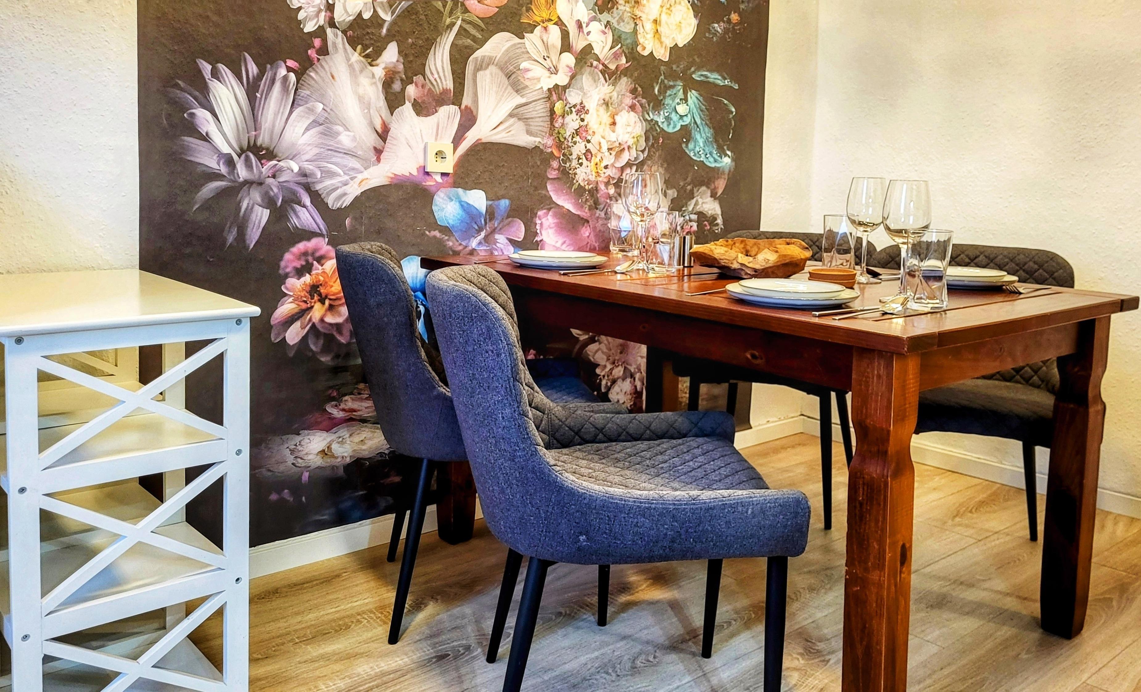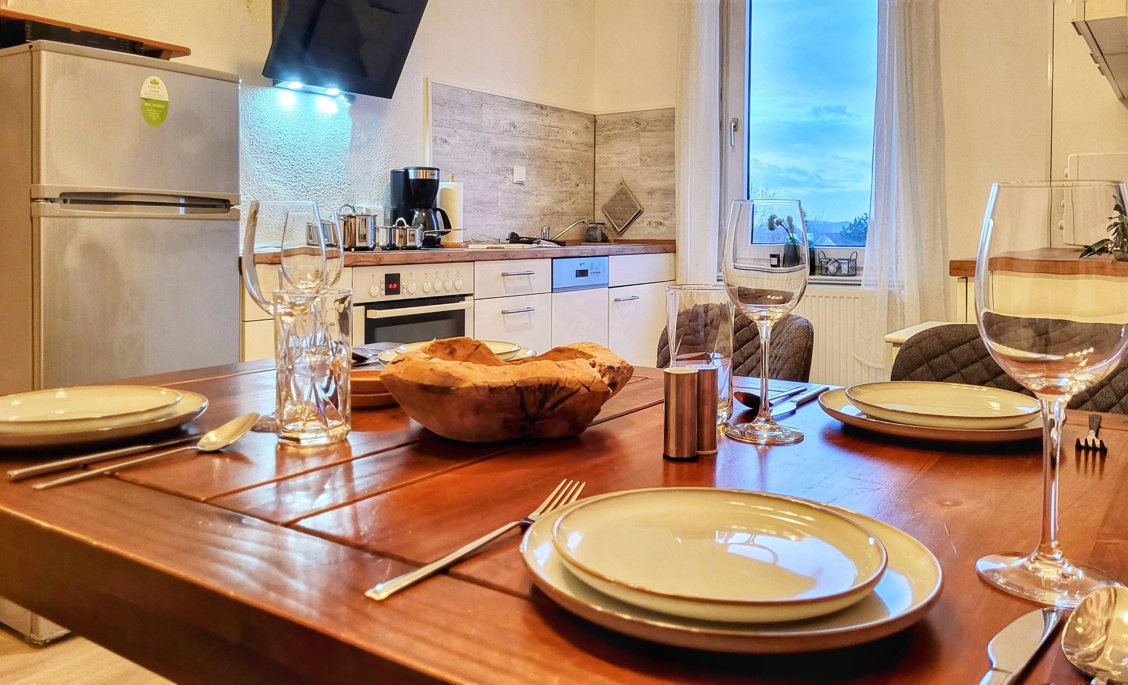 Die geräumige Wohnküche mit 4 Sitzgelegenheiten und Esstisch wurde im November 2022 völlig neu eingerichtet - jetzt auch mit Spülmaschine und Cerankochfeld.