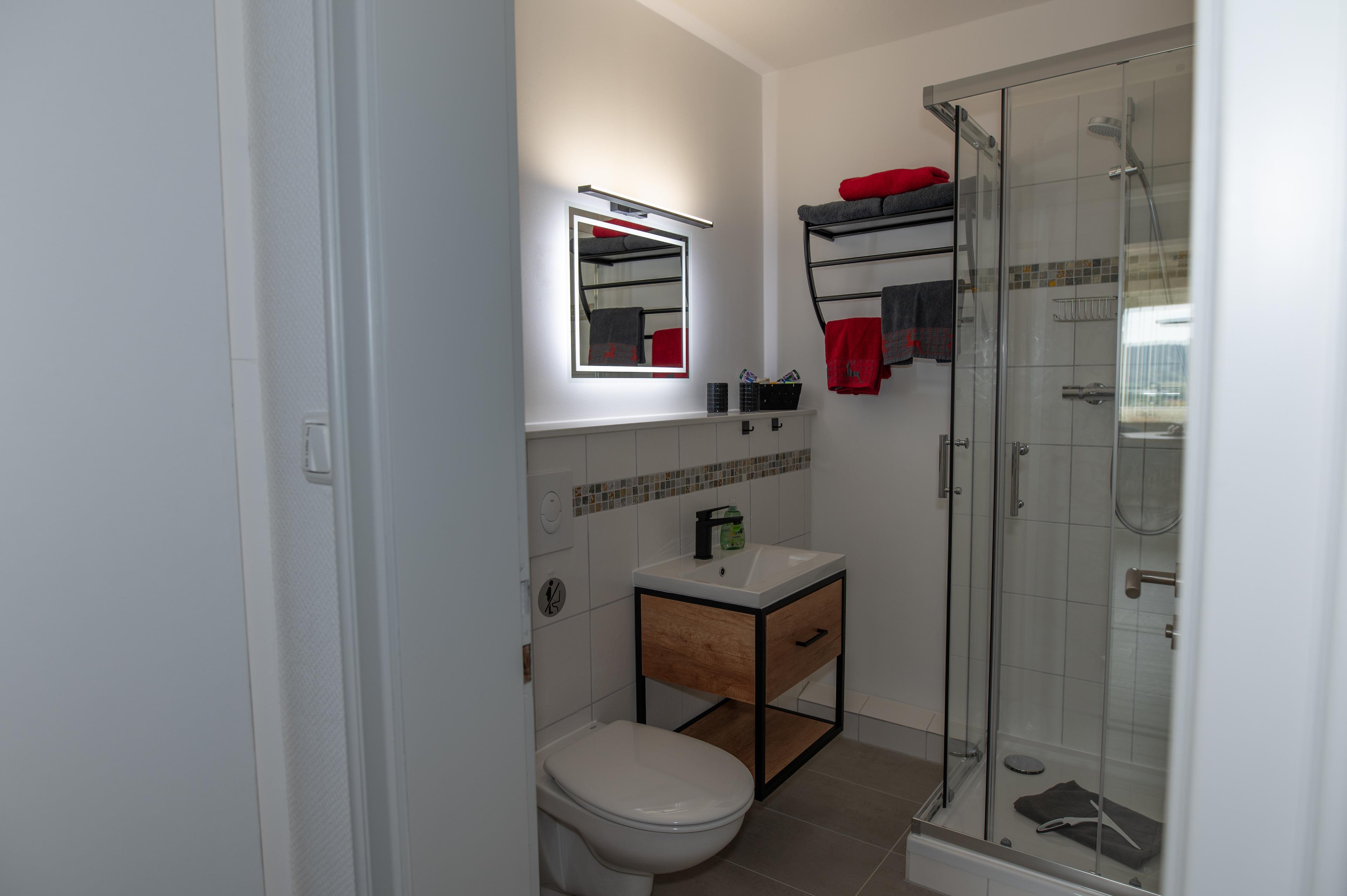Genießen Sie eine entspannte Dusche im Badezimmer mit Waschtisch und WC. Sie finden Föhn, Kosmetikspiegel sowie Hygieneartikel vor.