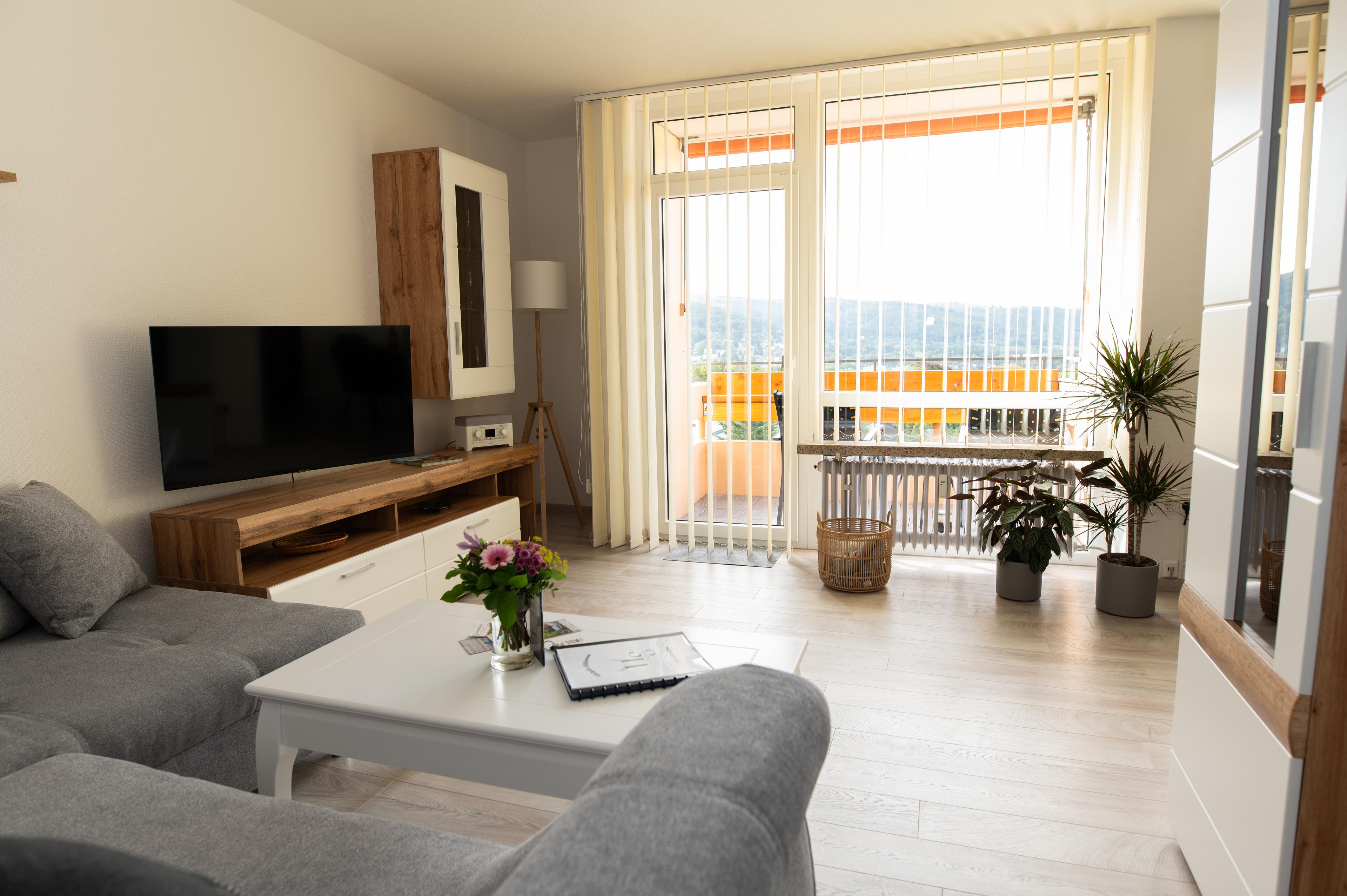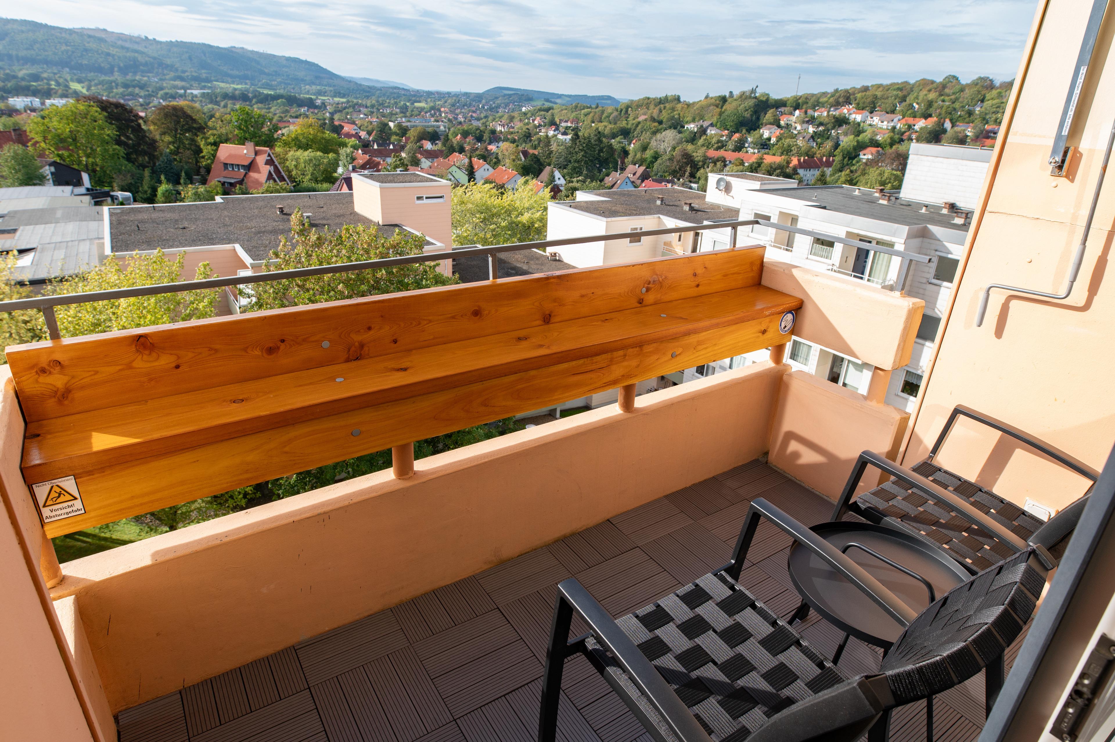Relaxen Sie im Wohnzimmer auf dem gemütlichen Ecksofa, welches ausziehbar ist und somit 2 weitere Schlafplätze bereithält. Von hier aus können Sie schon den Ausblick über Bad Harzburg genießen oder Sie nehmen direkt Platz auf dem Balkon.