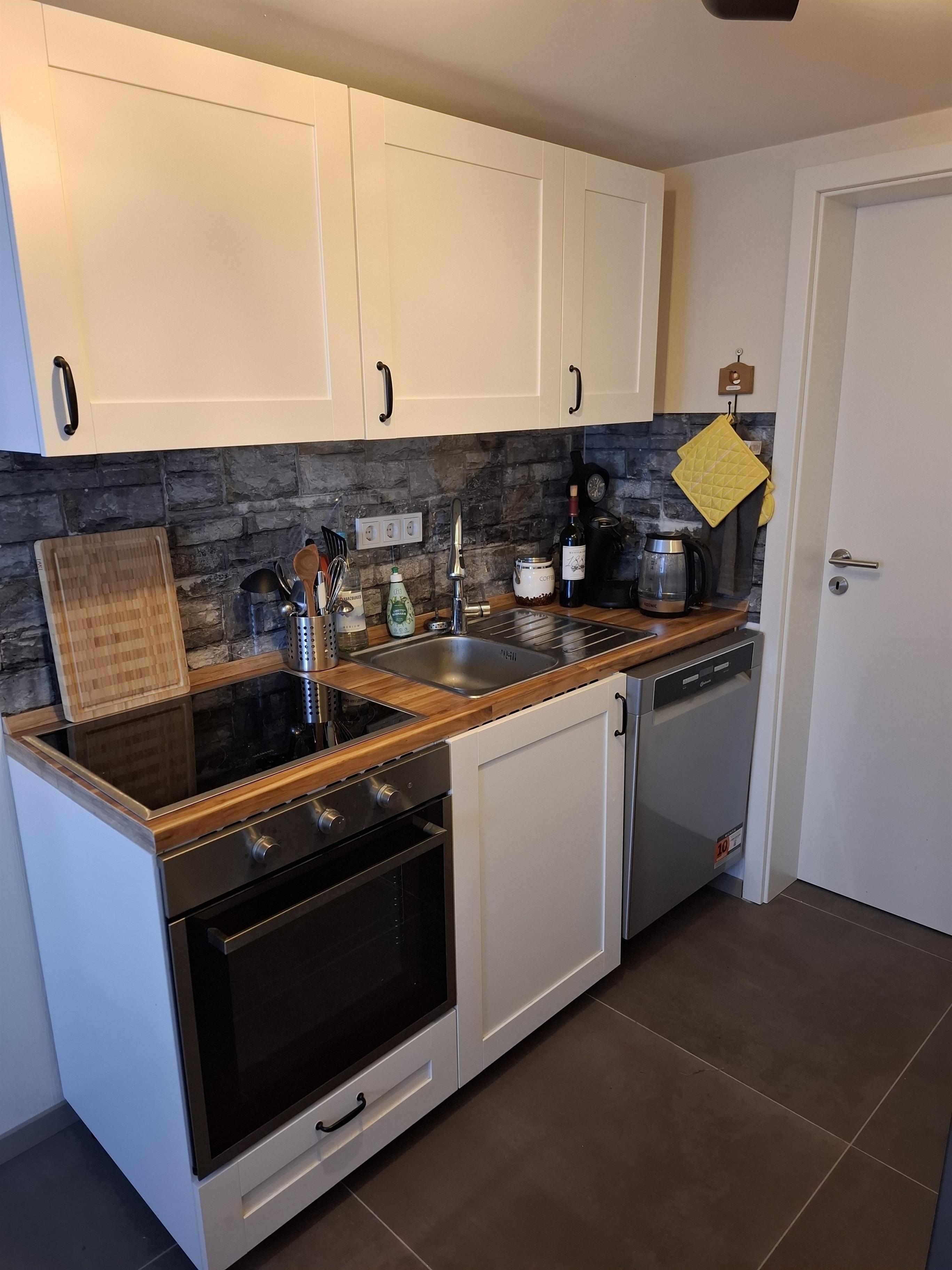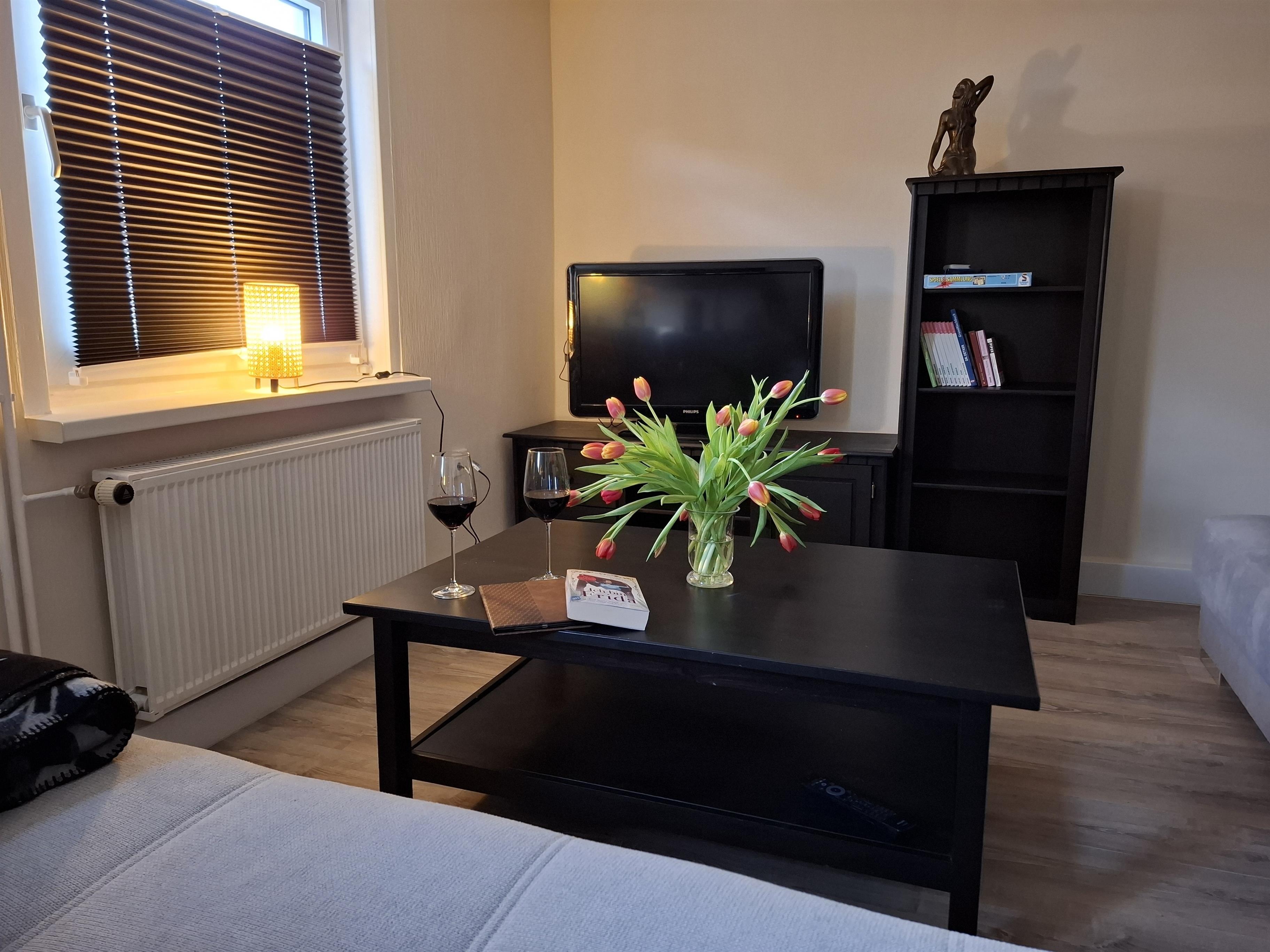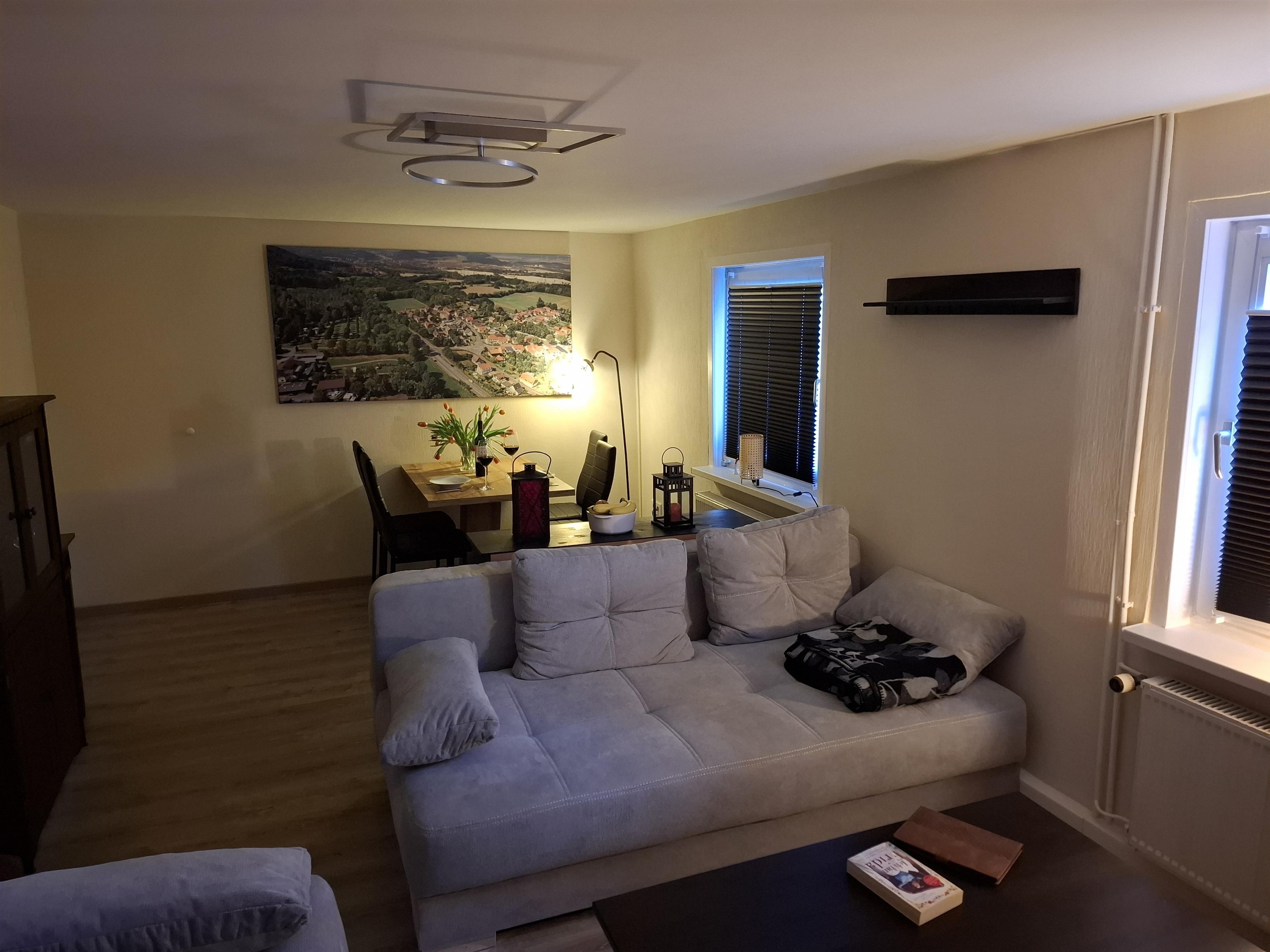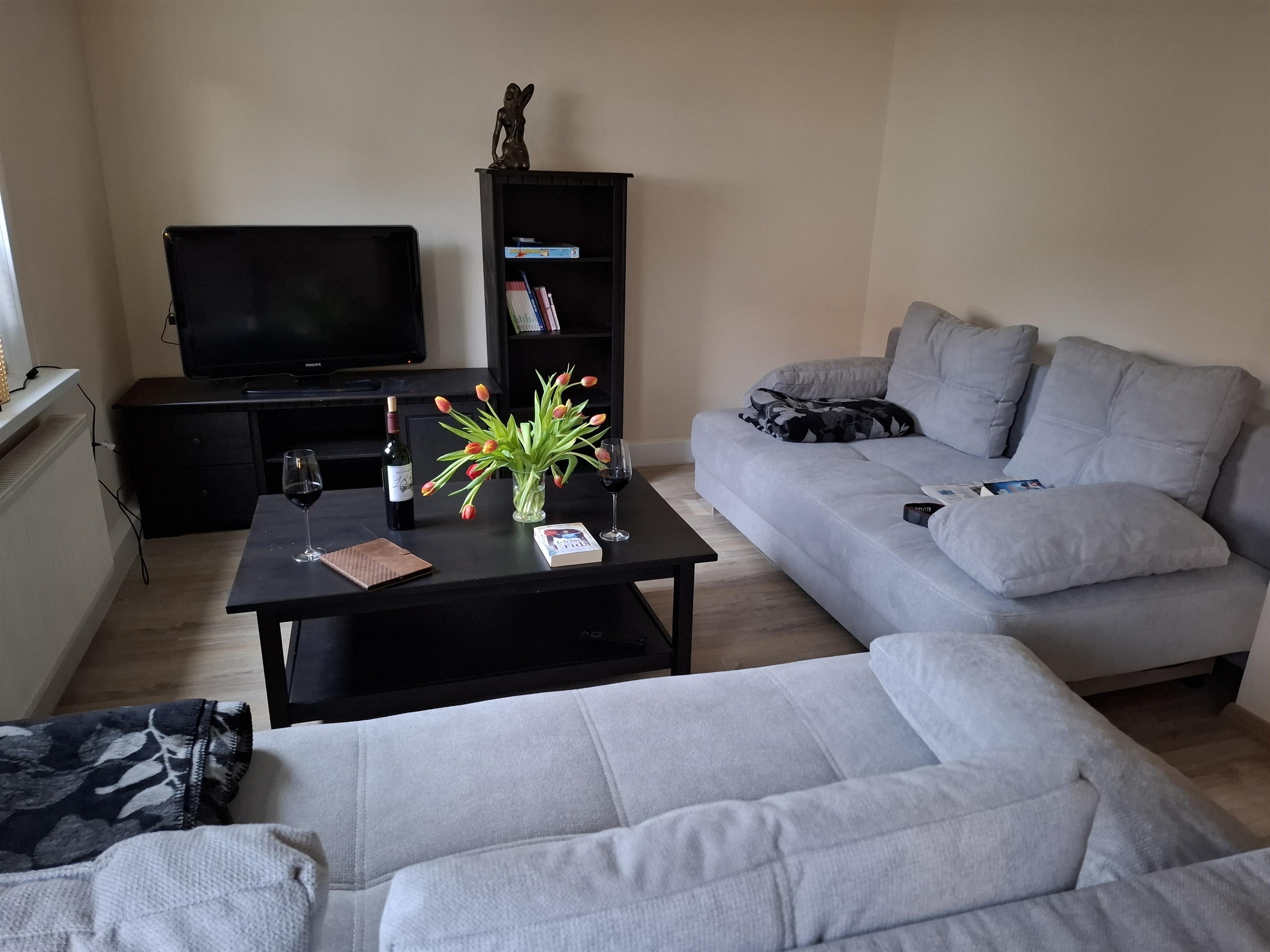 Unsere Ferienwohnung ist eine Einliegerwohnung von unserem Einfamilienhaus, hat einen separaten Eingang und bietet kostenfreie Parkplätze am Straßenrand. Sie verfügt über ein Schlafzimmer mit großem Doppelbett und zwei gemütlichen Boxspring-Schlafsofas im Wohnzimmer, so dass Familien mit 1 - 4 Kindern ausreichend Platz finden. Bei Bedarf stellen wir auch gerne Reisebetten für Babys bzw. Kleinkinder zur Verfügung. Ein Hochstuhl ist bei Bedarf vorhanden, ebenso Spielsachen und Bücher. Neben Familien können sich in unserer Ferienwohnung Paare und Alleinreisende genau so wohlfühlen wie Gruppen von bis zu 6 Personen. Ihre Vierbeiner sind bei uns herzlich willkommen. Neben Schlaf- und Wohnzimmer gibt es eine voll ausgestattete Küche mit einer kleinen Küchenzeile, Spülmaschine, Kühlschrank und Herd. Sie verfügt über alle notwenigen Geräte, wie Kaffeeautomat, Kaffeemaschine, Wasserkocher, Toaster und Mixer und bietet einen Tisch für ein kleines Frühstück. Für die großen Mahlzeiten gibt es im Wohnzimmer eine gemütliche Essecke. Die Küche verfügt über die notwendige Ausstattung zur Zubereitung von Mahlzeiten. Daneben ist eine Grundausstattung von Salz, Pfeffer und Öl vorhanden sowie frische Spüllappen, Spültabs, Spülmittel, Seife und Geschirrtücher. An die Küche grenzt das Badezimmer mit WC, ebenerdiger Regendusche und einer Waschmaschine an.