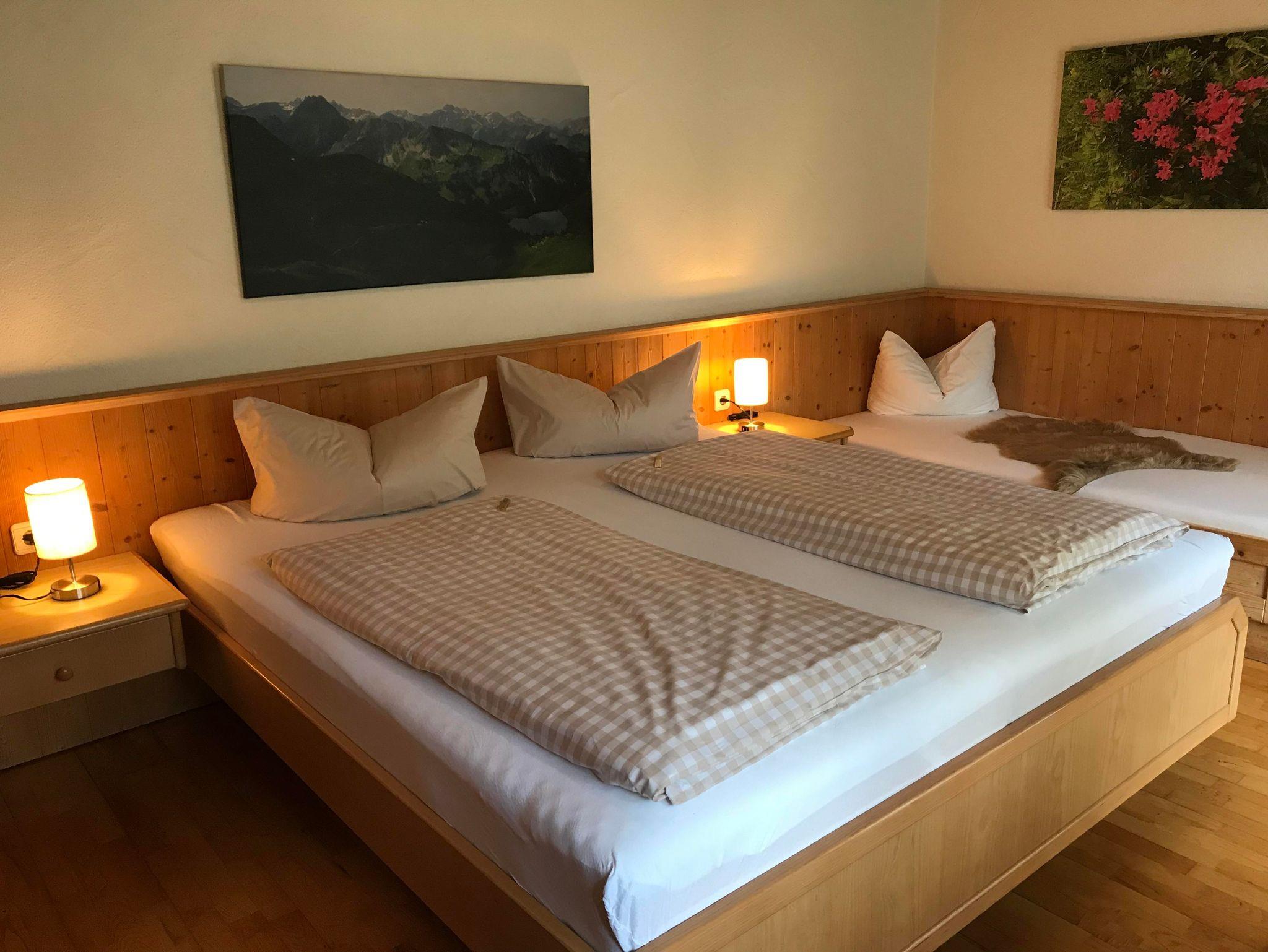 Großes Schlafzimmer mit 3 Komfortbetten 0,45m Sitzhöhe offenes Fussende . Dusche , WC, Handtücher und Föhn .