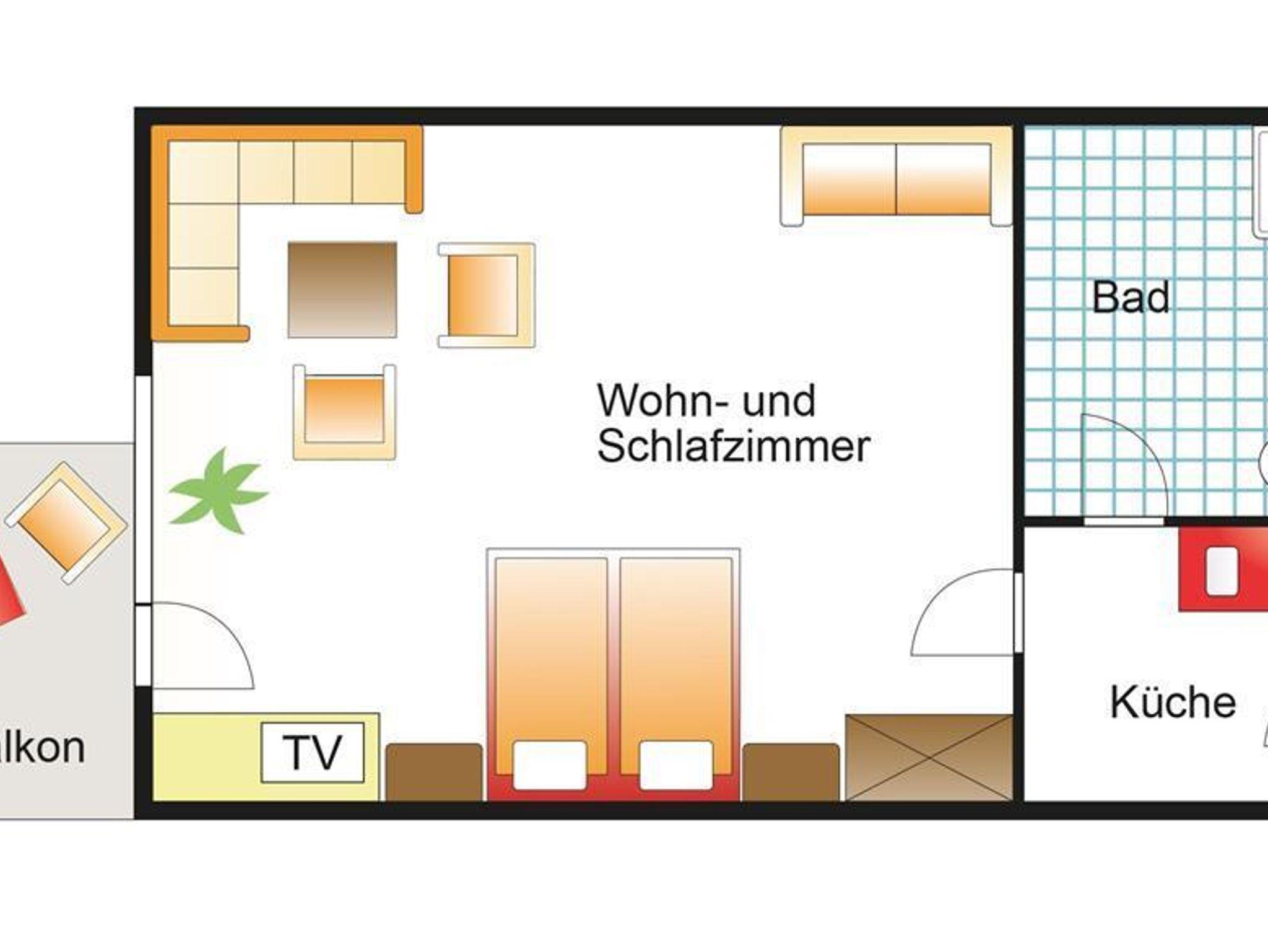 kombinierter Wohn- und Schlafraum mit Doppelbett
