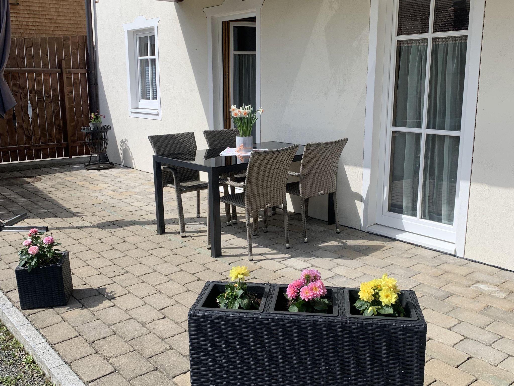 Großzügige, allergikerfreundliche Nichtraucherwohnung (Parterre) mit separatem Schlafzimmer, Wohnküche (Spülmaschine, Backofen uvm.), Bad mit Fußbodenheizung, Südterrasse mit Bergblick.