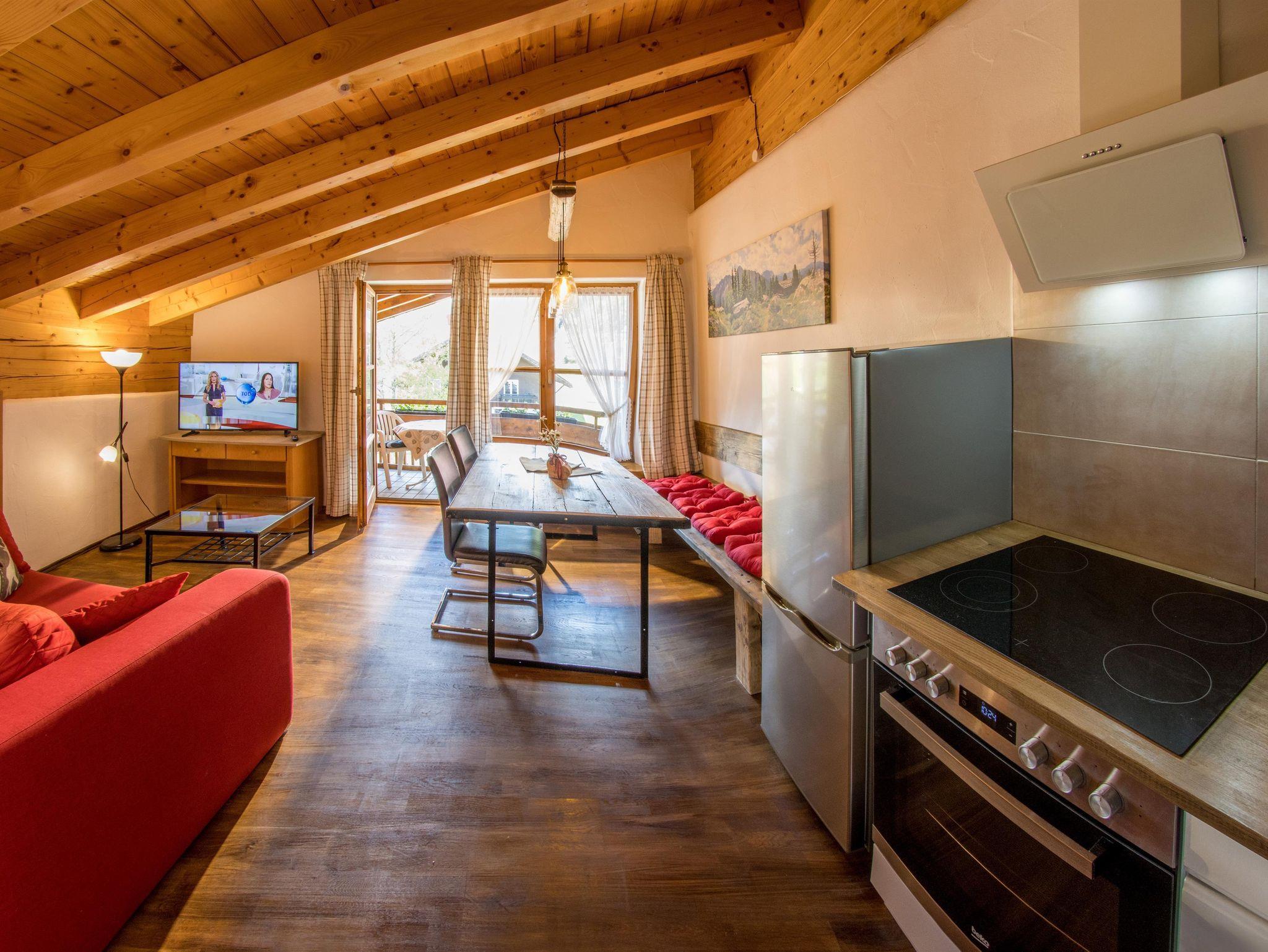 47 m² große Ferienwohnung im Dachgeschoss mit gemütlichem Ambiente. Vom Westbalkon aus können Sie den Sonnenuntergang in den Bergen erleben. Ein seperates Schlafzimmer sowie ein schöner Wohnbereich mit Schlafcouch und Flachbild TV ist vorhanden. Eine Küchenzeile mit geräumigen Essplatz macht die Wohnung komplett. BAD/WC, allergiegerechte Ausstattung, Nichtraucher.