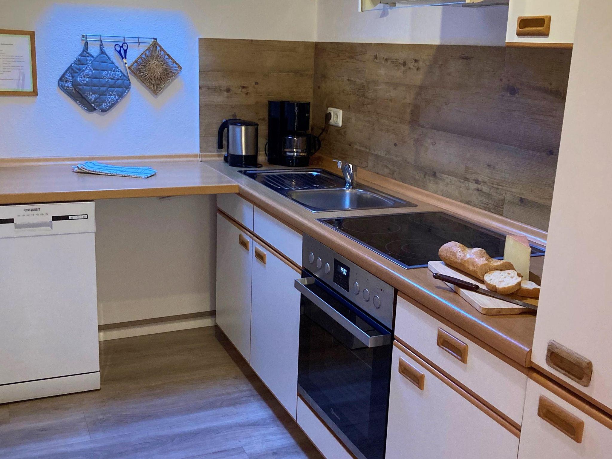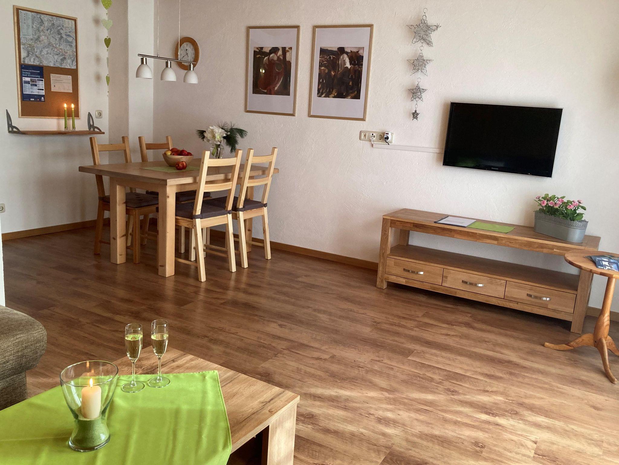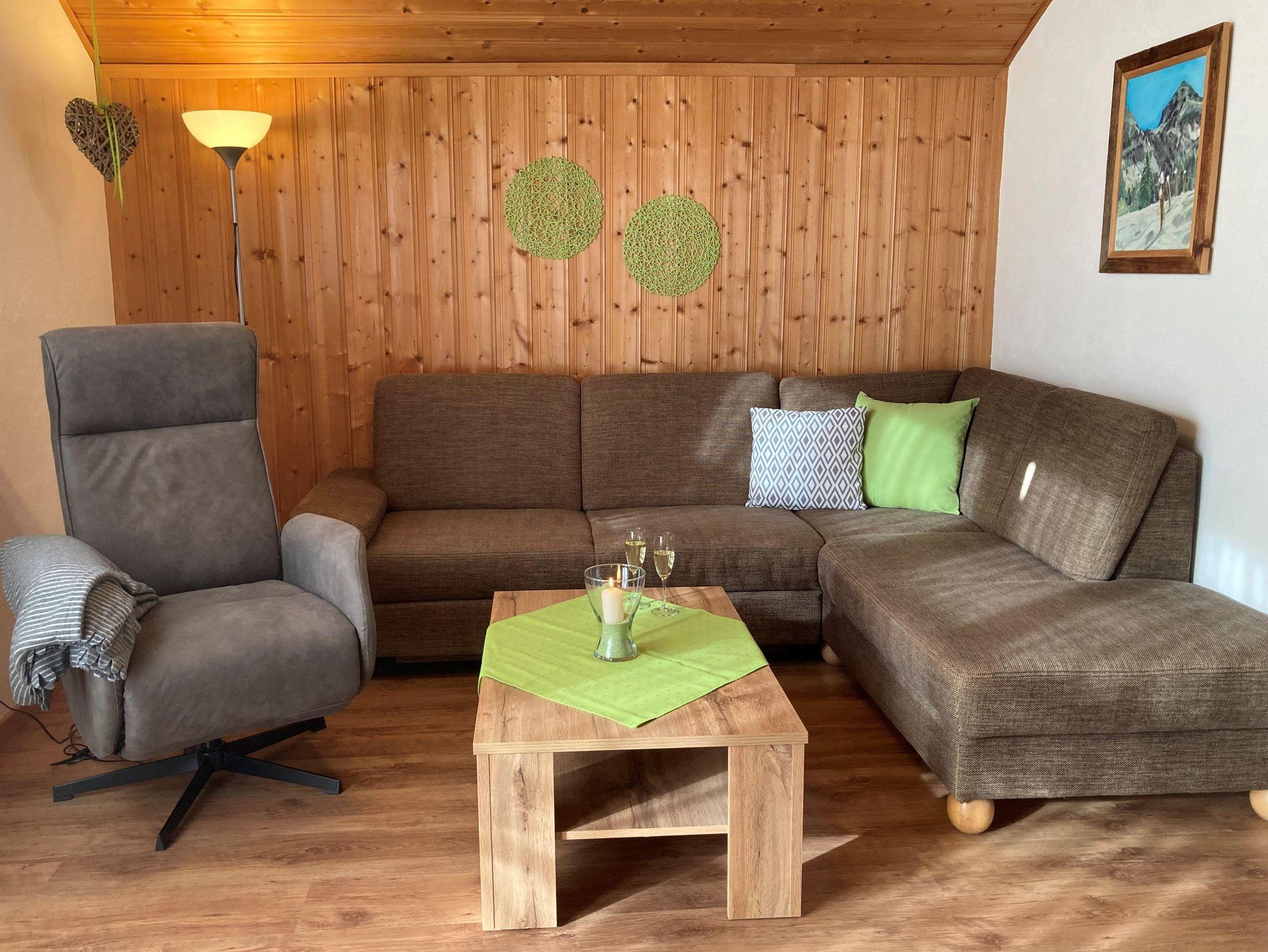 sep. Schlafzimmer mit Doppelbett/ DU-WC/ kl. Küche mit kompl. Kochzeile (Backofen, Cerankochfeld, Kühlschrank, Spülmaschine, Kaffeemasch., Toaster)/ einem hellen, großzügigen Wohnraum zur Südseite mit Eßecke, Couch und Wellnesssessel, SAT-TV, kostenlosem WLan und einem geschützten, möblierten Südbalkon mit freiem Blick auf ein traumhaftes Bergpanorama!