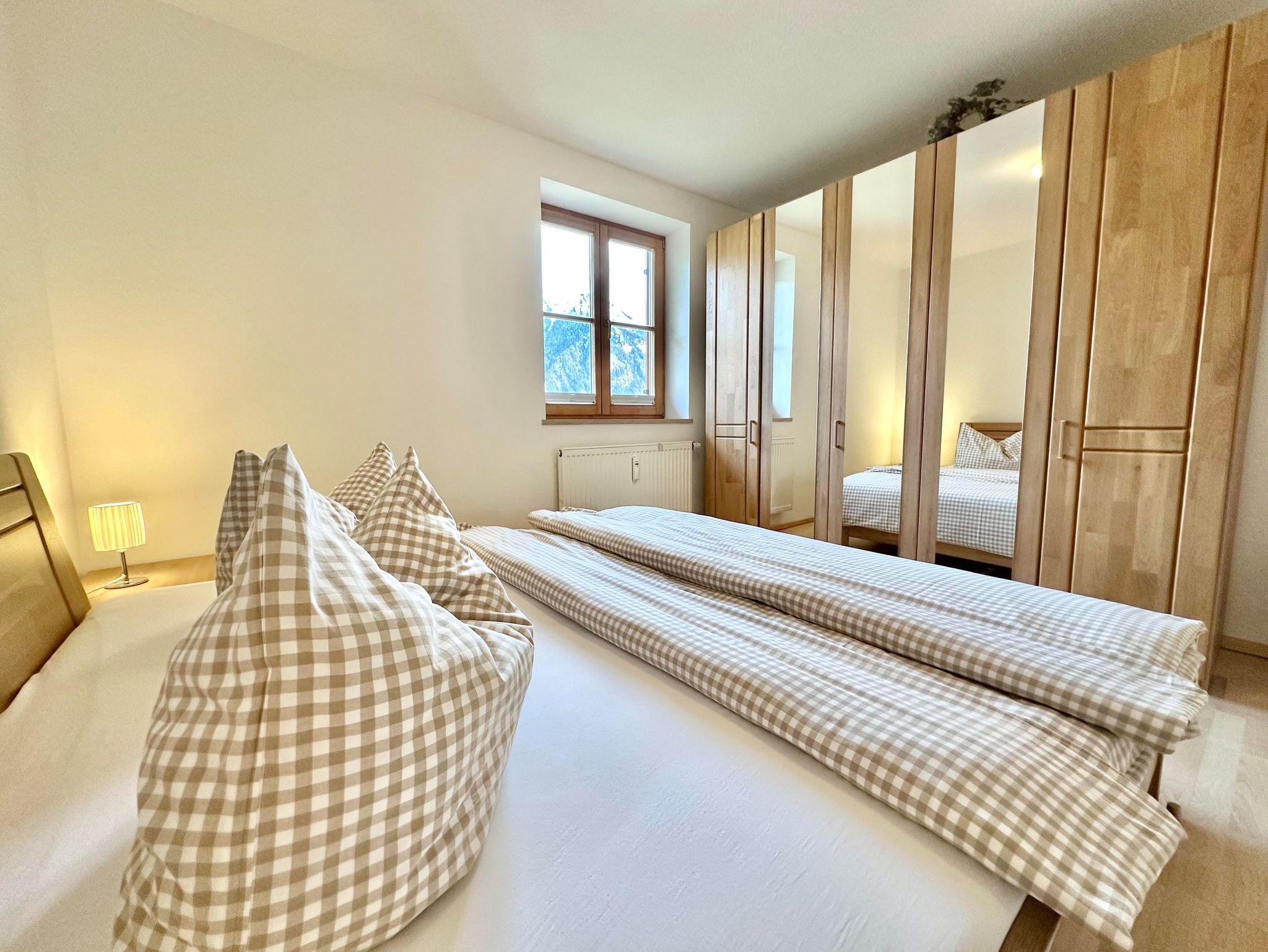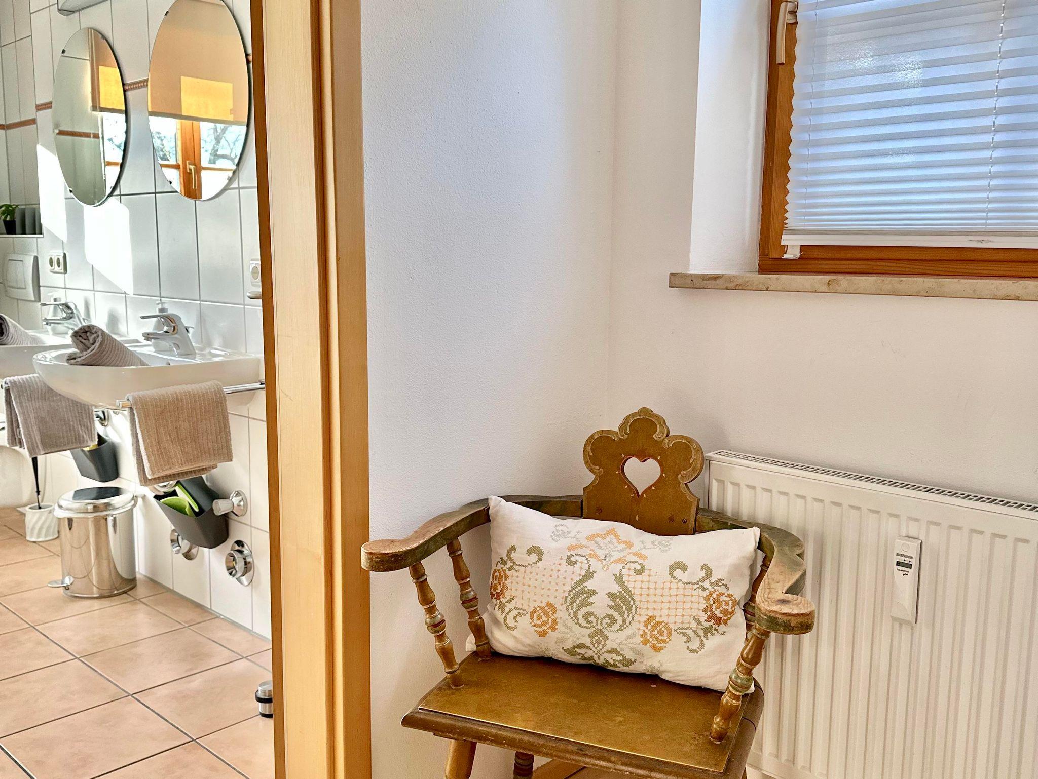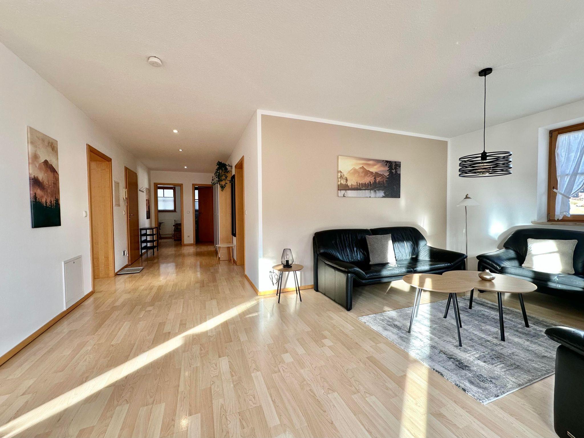Hochwertige, sehr helle und sonnige, großzügige Ferienwohnung, ausgestattet mit einem stilvollem Wohnzimmer, 3 getrennten Schlafräumen, Küchezeile, Bad mit Wanne / sep. Dusche, WC, SAT-TV. Südbalkon mit freiem, umfassenden Bergblick; Bauerngarten und Liegewiese unter alten Apfelbäumen.