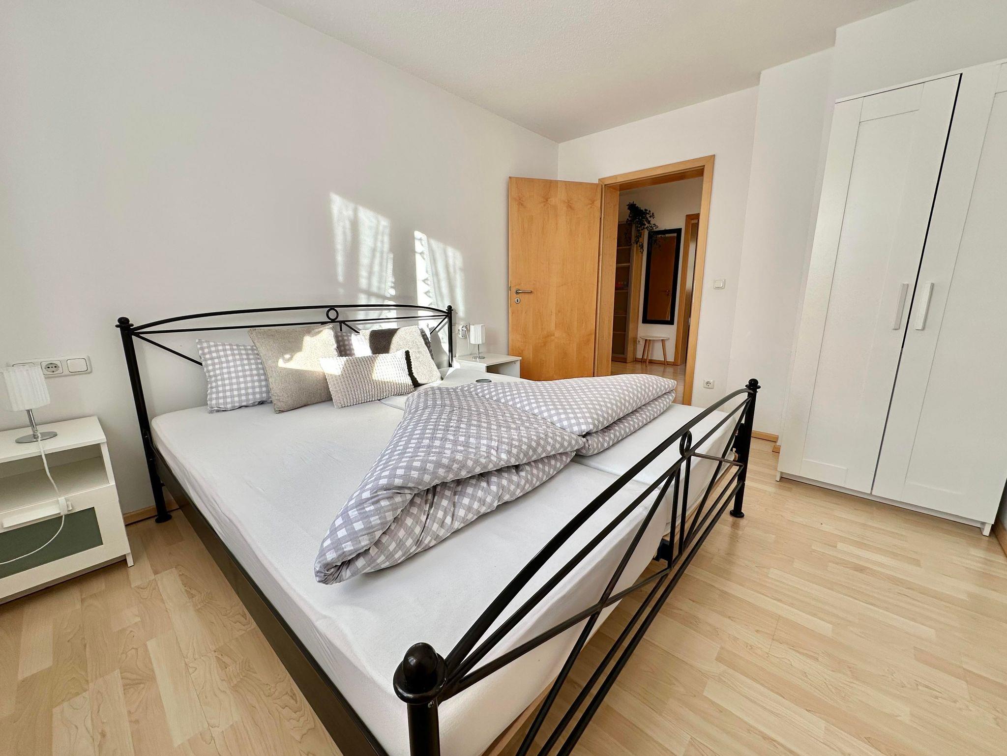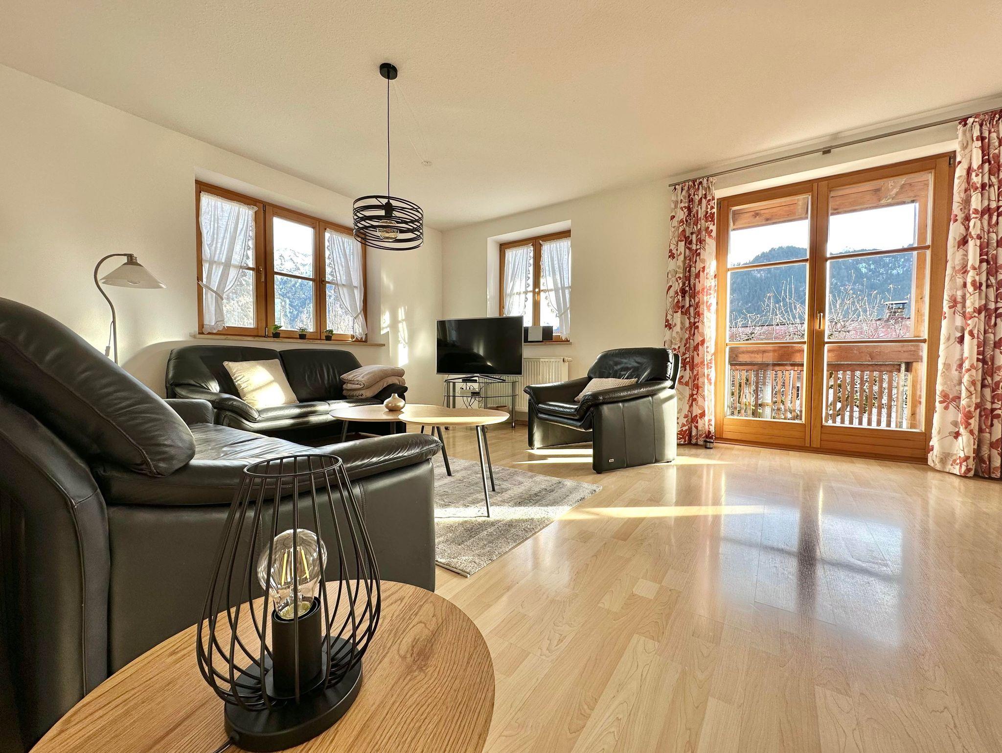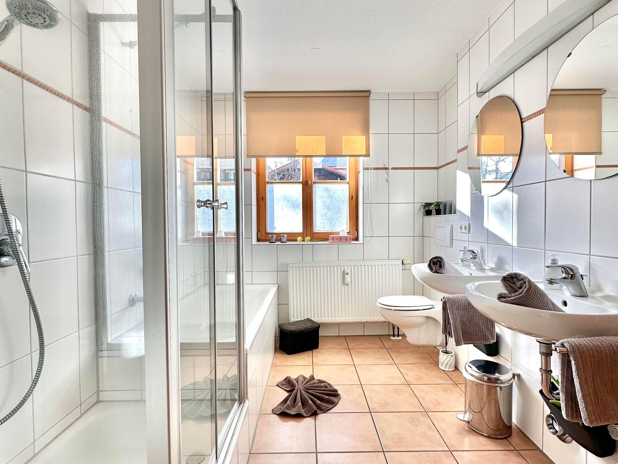 Hochwertige, sehr helle und sonnige, großzügige Ferienwohnung, ausgestattet mit einem stilvollem Wohnzimmer, 3 getrennten Schlafräumen, Küchezeile, Bad mit Wanne / sep. Dusche, WC, SAT-TV. Südbalkon mit freiem, umfassenden Bergblick; Bauerngarten und Liegewiese unter alten Apfelbäumen.