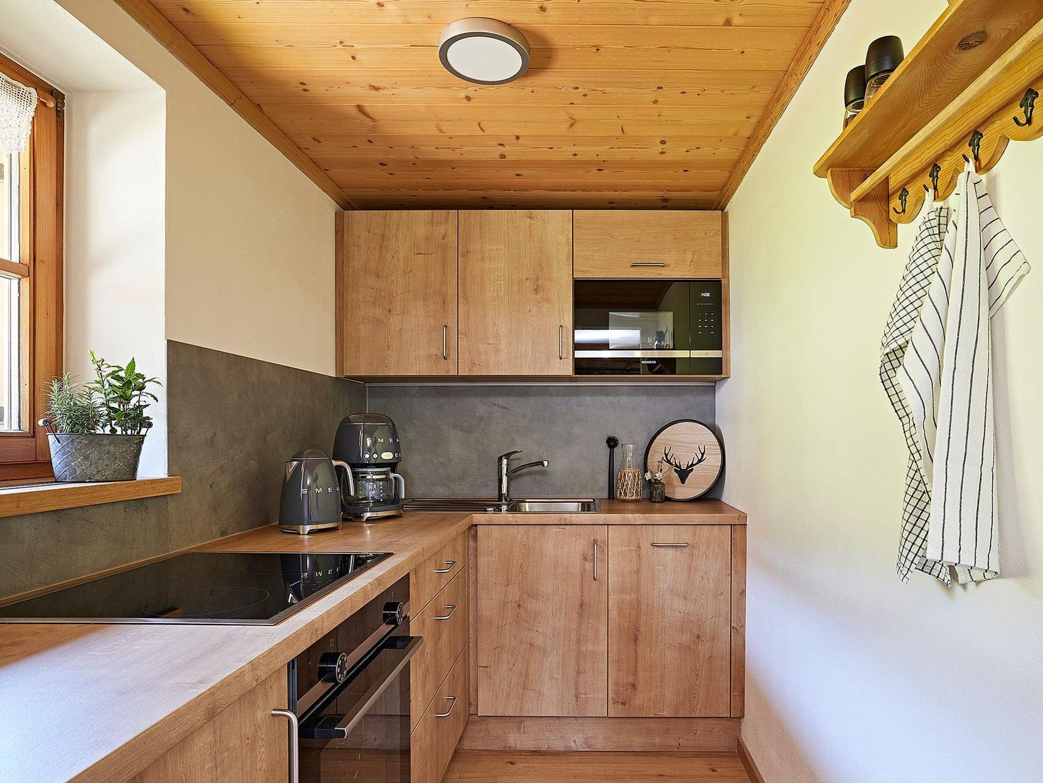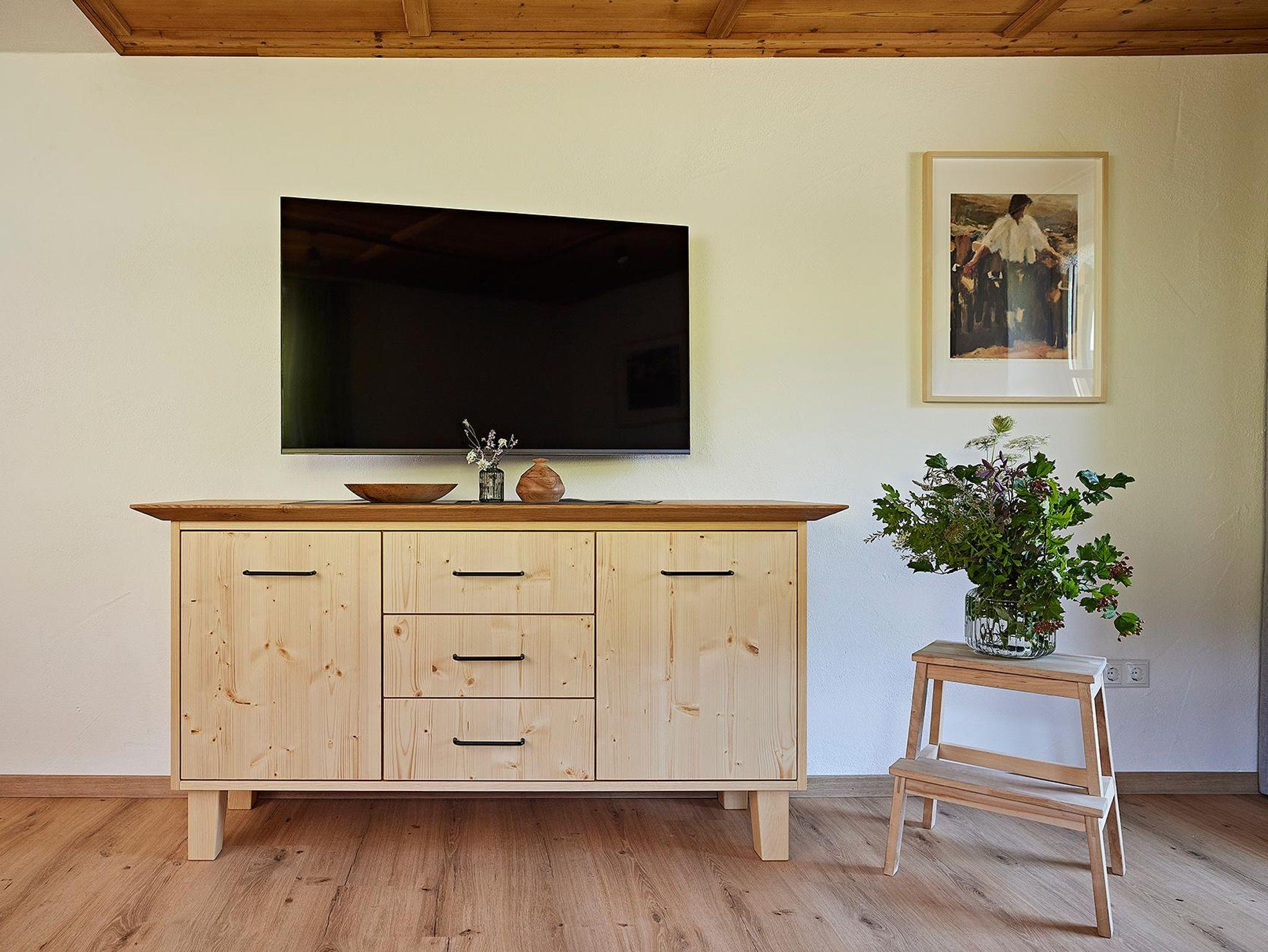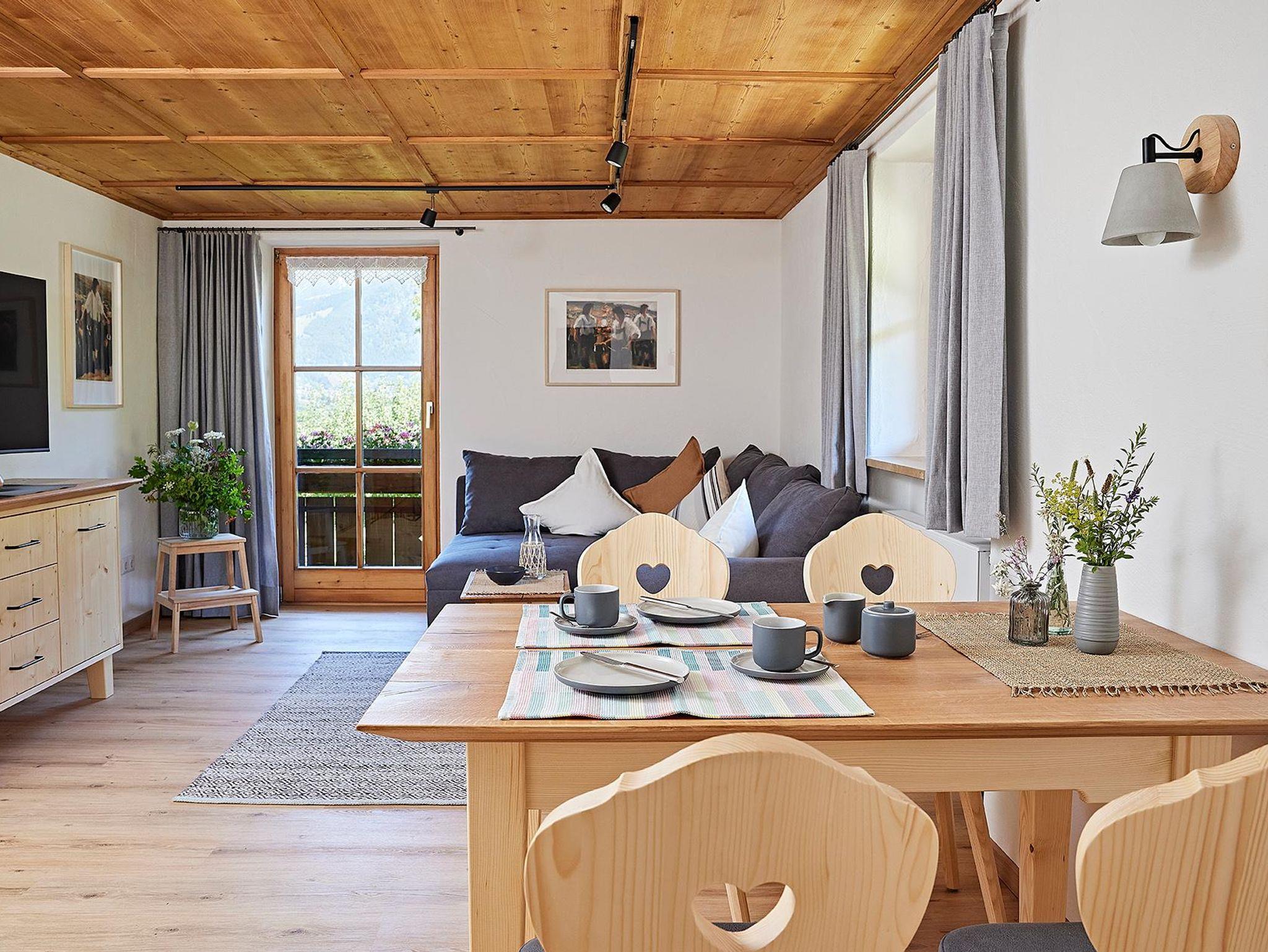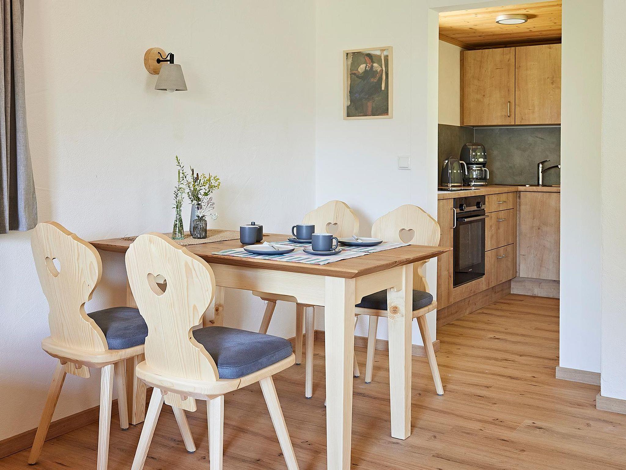 Der gemütliche Wohnraum ist im Allgäuer Stil eingerichtet und hat einen Ausgang zum Balkon.
