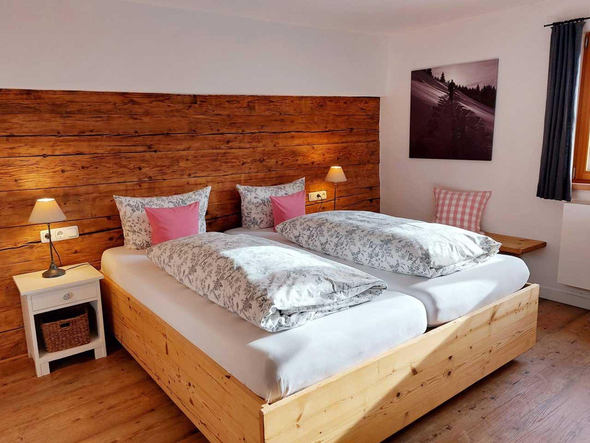 Unsere große Ferienwohnung hat zwei separate Schlafräume mit Betten in Komforthöhe eines davon mit zusätzlichem TV, einen gemütlichen Wohnraum mit Küchenzeile, ein Badezimmer mit Doppelwaschbecken und Dusche sowie ein sep. WC und einen Südbalkon mit Sitzgelegenheit und Bergblick.