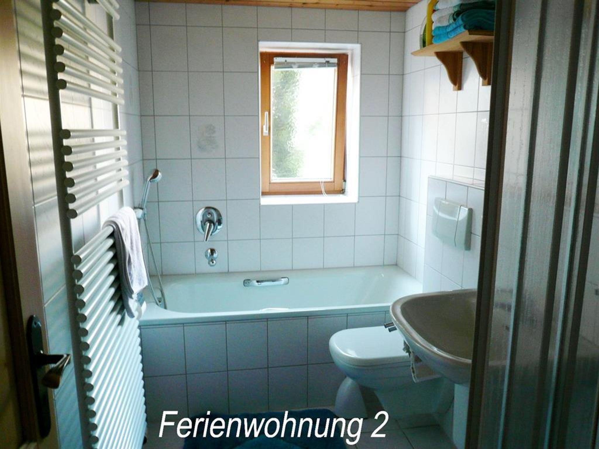 - Badezimmer mit Badewanne, Dusche, WC und Fön