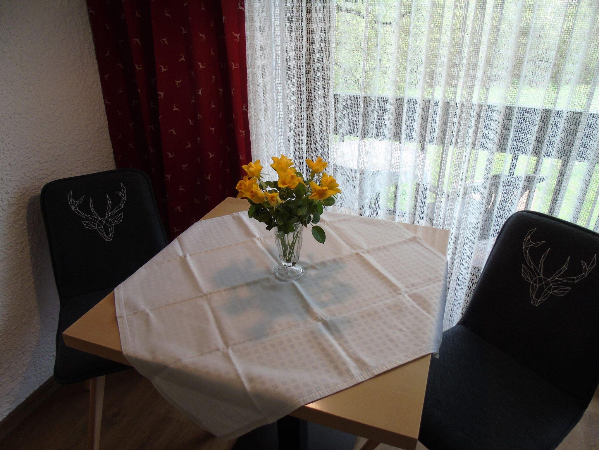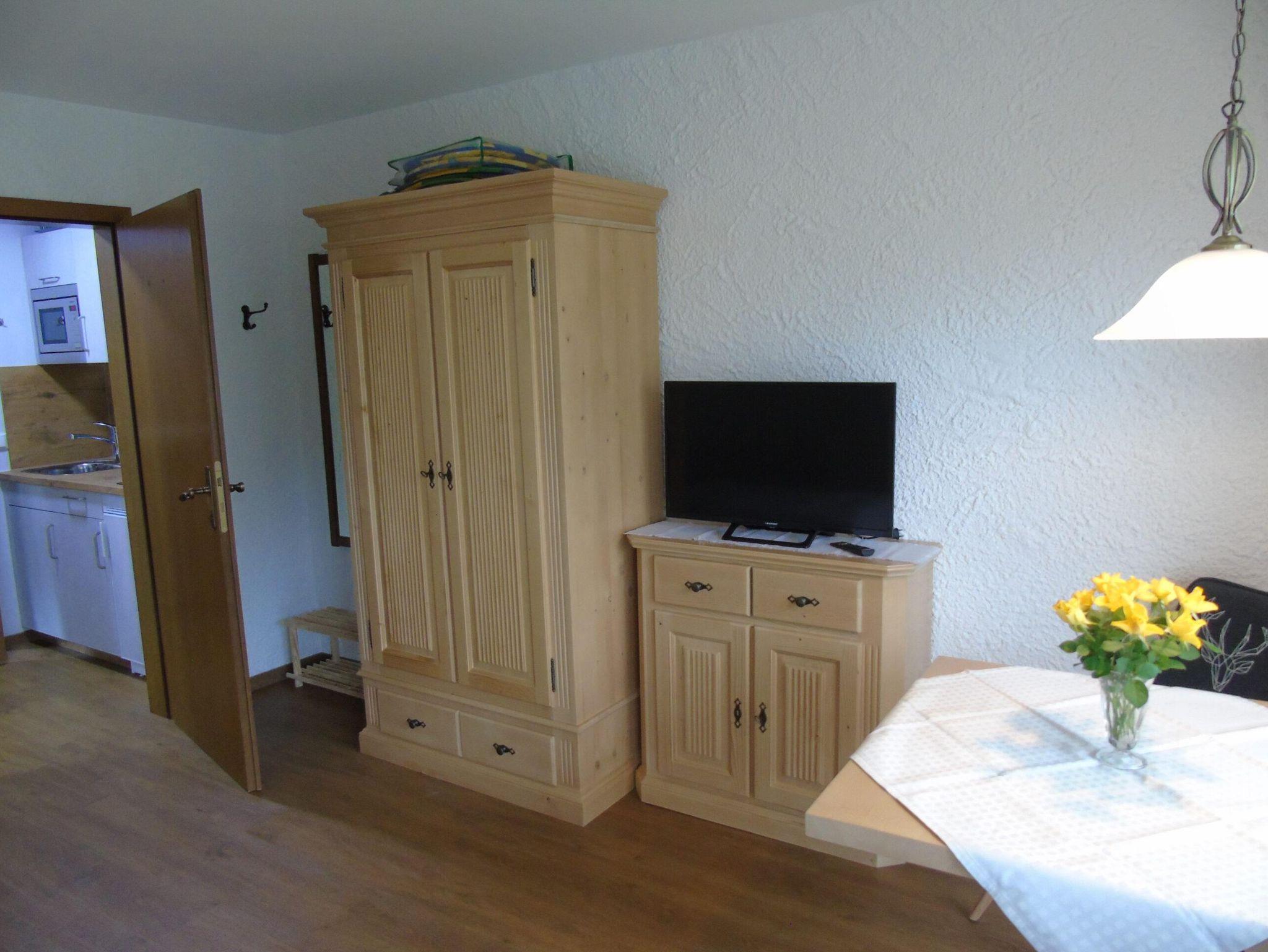 Unsere frisch renovierte Ferienwohnung Nr. 3 besticht durch den Balkon mit der schönsten Aussicht sowie den meisten Sonnenstunden. Genießen Sie die Abendsonne und den wunderbaren Ausblick auf unseren Garten sowie auf das Imberger Horn. Der Balkon verfügt über einen kleinen Tisch sowie zwei Stühlen (eine Sonnenliege), die zu gemütlichen Mahlzeiten an der frischen Luft einladen. Wohnschlafraum, Kleinküche und Dusche/WC.