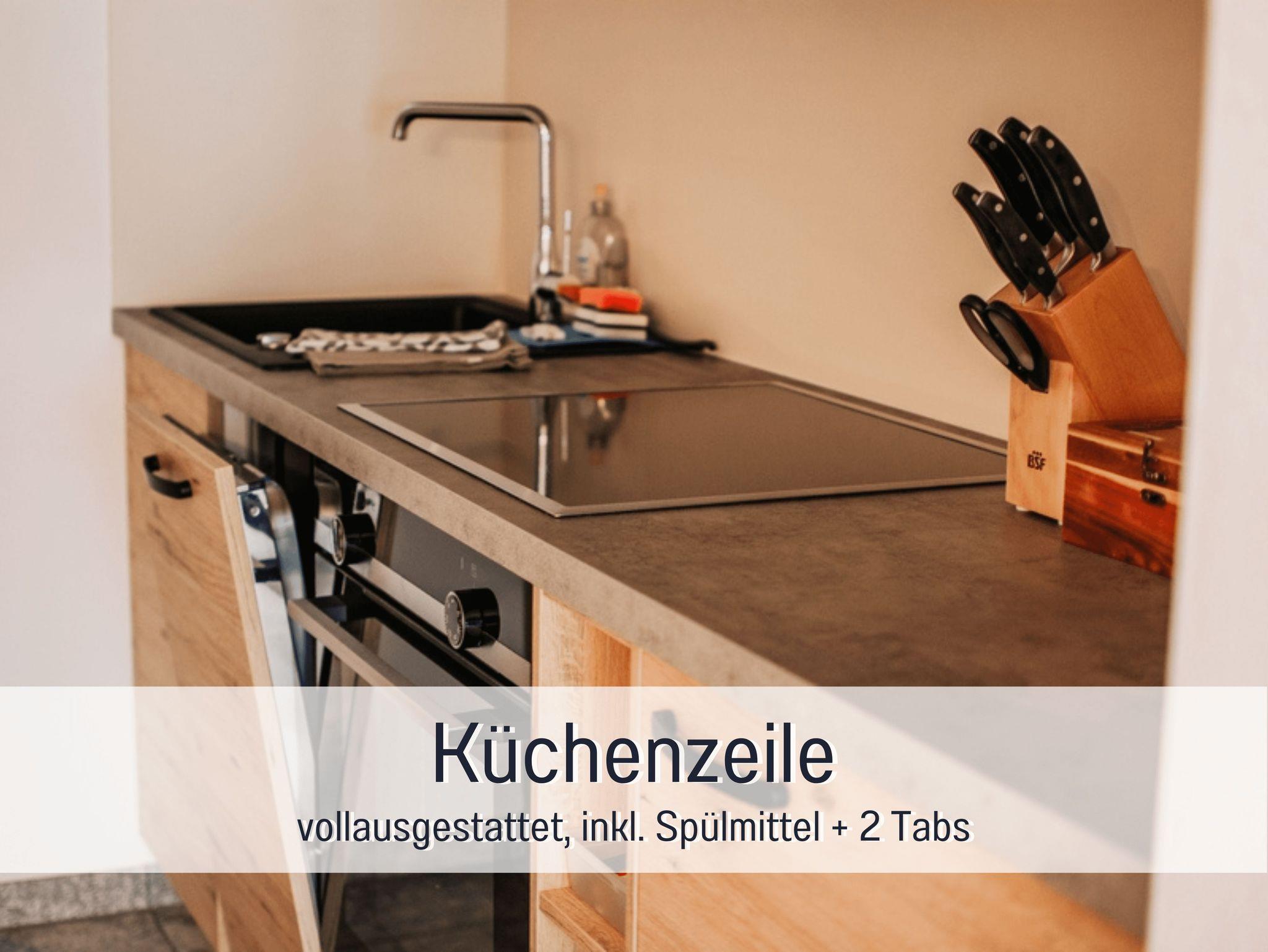 • vollausgestattete, moderne Küchenzeile, Esstisch und Couch