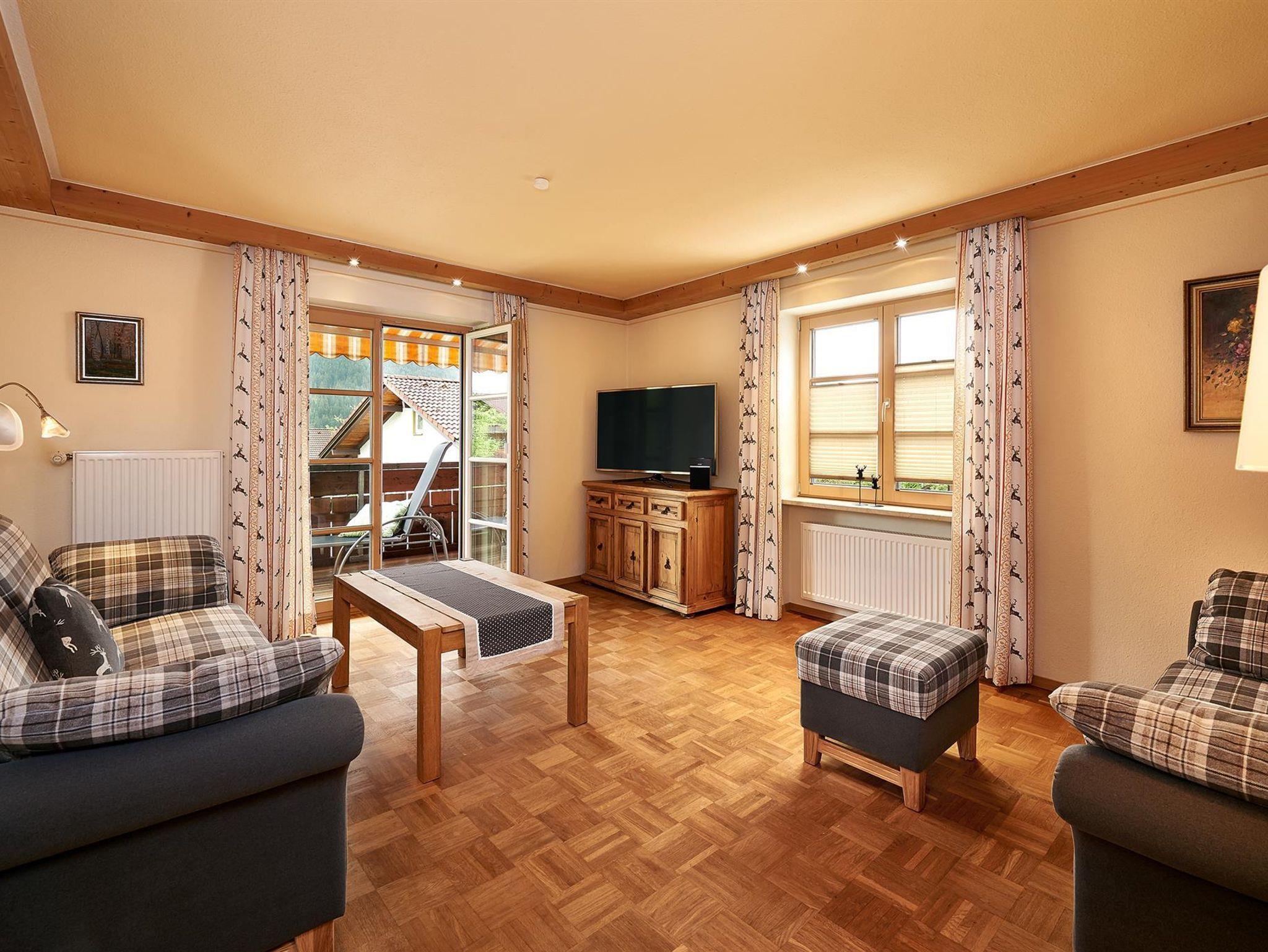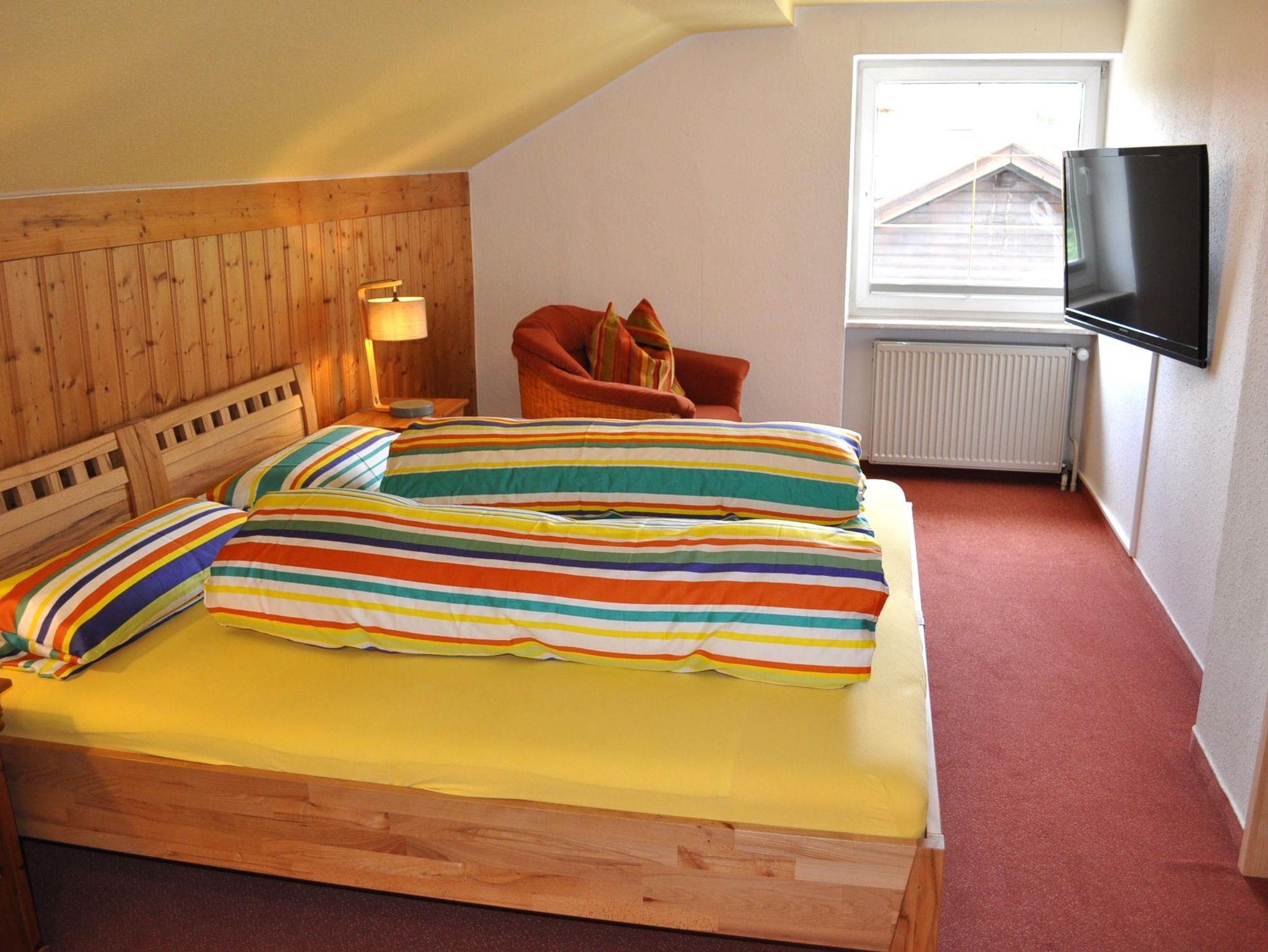 Charmante FeWo für unbeschwerte Urlaubstage: 3-Sterne Economy (80qm) im zweiten Stock: großzügig kombiniert: Doppelbett und Wohnzimmer mit Ostbalkon (freier Bergblick zum Iseler), großer Holztisch mit fünf passenden Stühlen, Couch, Sessel und Flachbild-TV, separate Ankleide mit Dachfenster, separate Küche mit Blick zum Hirschberg (Spülmaschine, Ceranfeld, Backofen), zwei weitere separate Schlafzimmer (1 x Einzel, 1 x Doppelbett) sowie neues Bad mit Dusche/WC sowie Badewanne und separates WC.