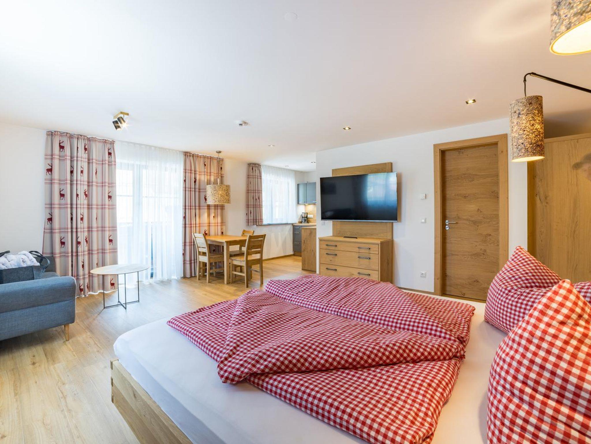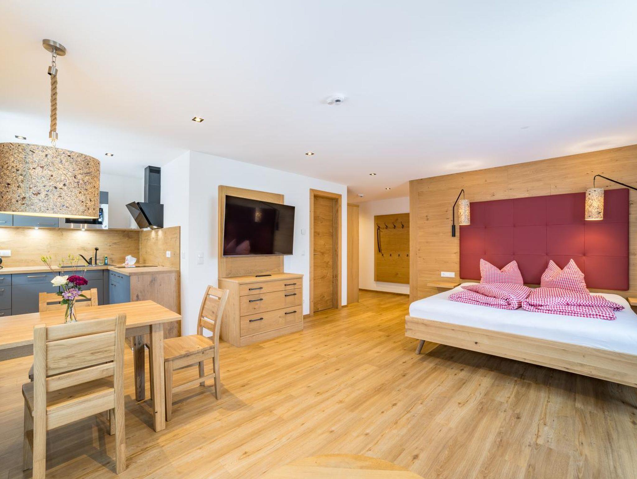 Geräumiges Appartement (42 m²) für 2-3 Personen. Wohn-Schlafraum mit Küche (inkl. Geschirrspüler). Alle Leistungen des Hotels inklusive (Frühstück, Schwimmbad, Sauna, Fitnessraum, Hobbyraum).