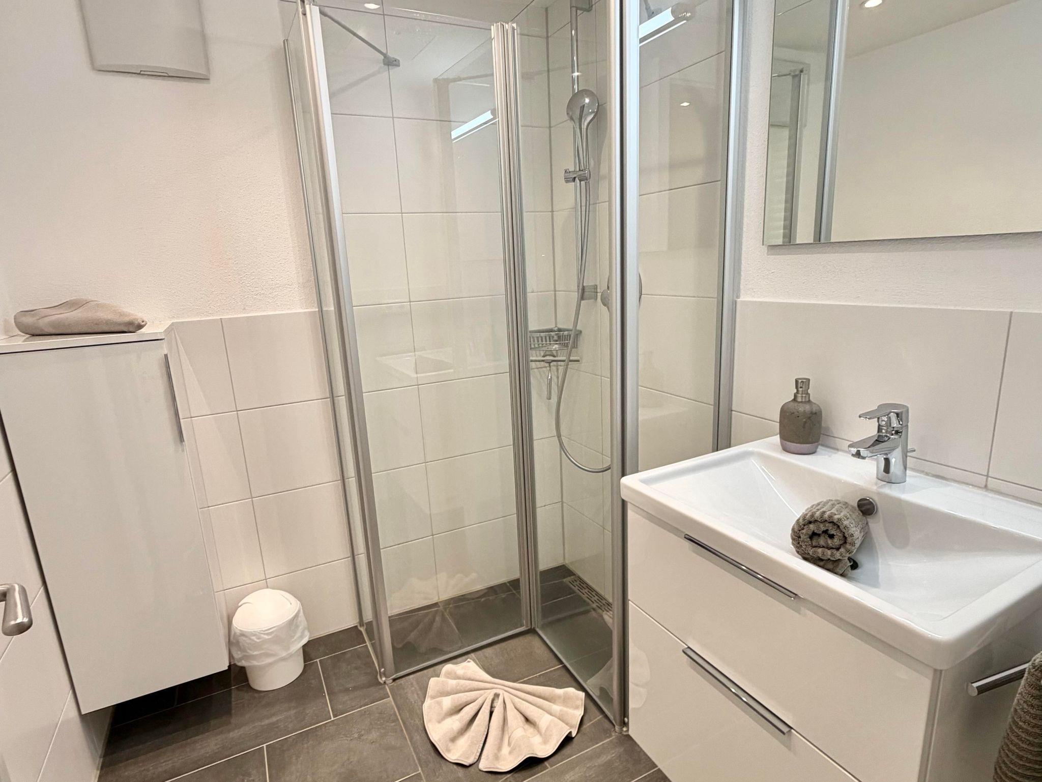 Das Badezimmer verfügt über eine begehbare Dusche, während das WC in einem separatem Raum zu finden ist (Haartrockner vorhanden).
