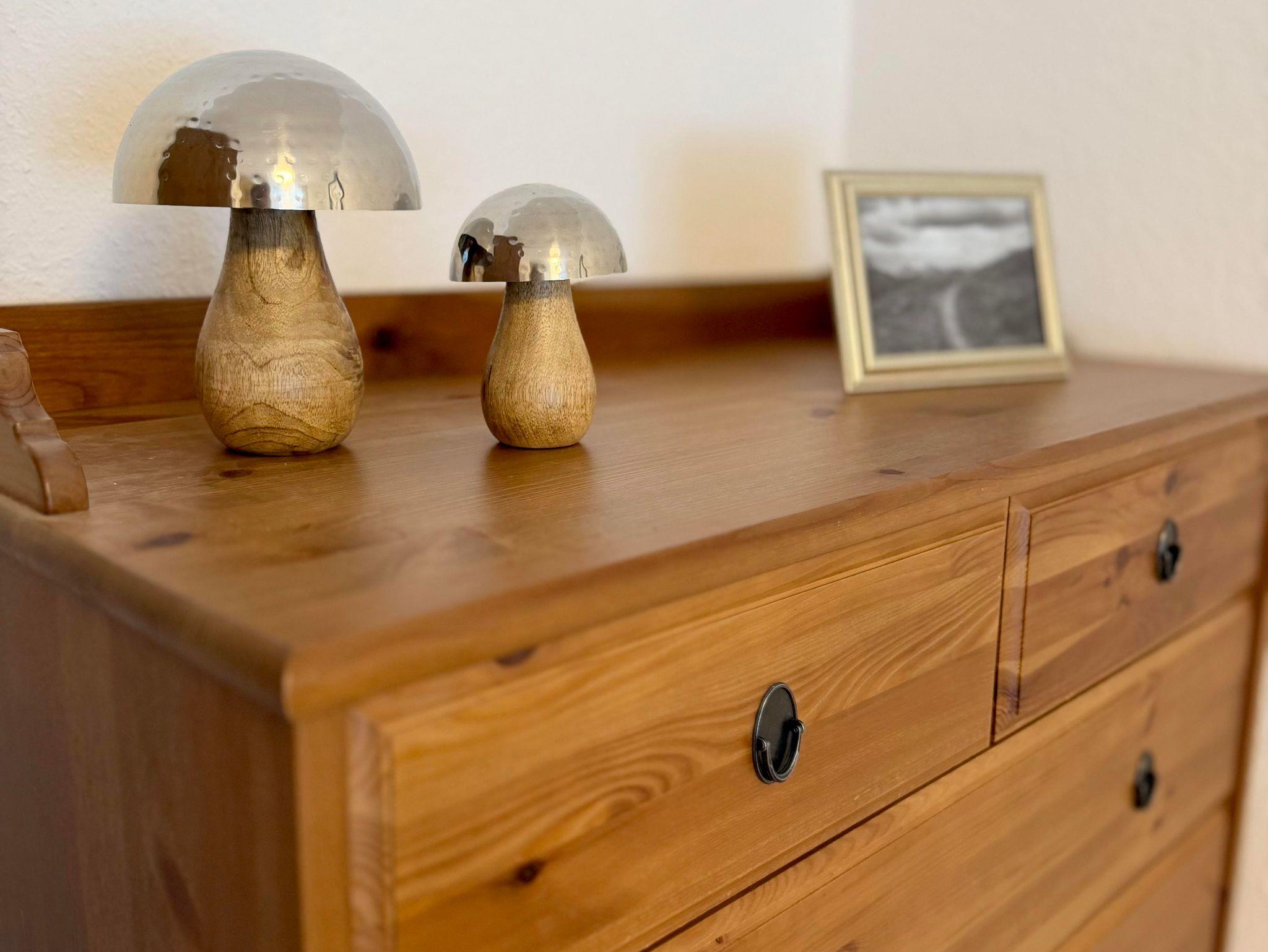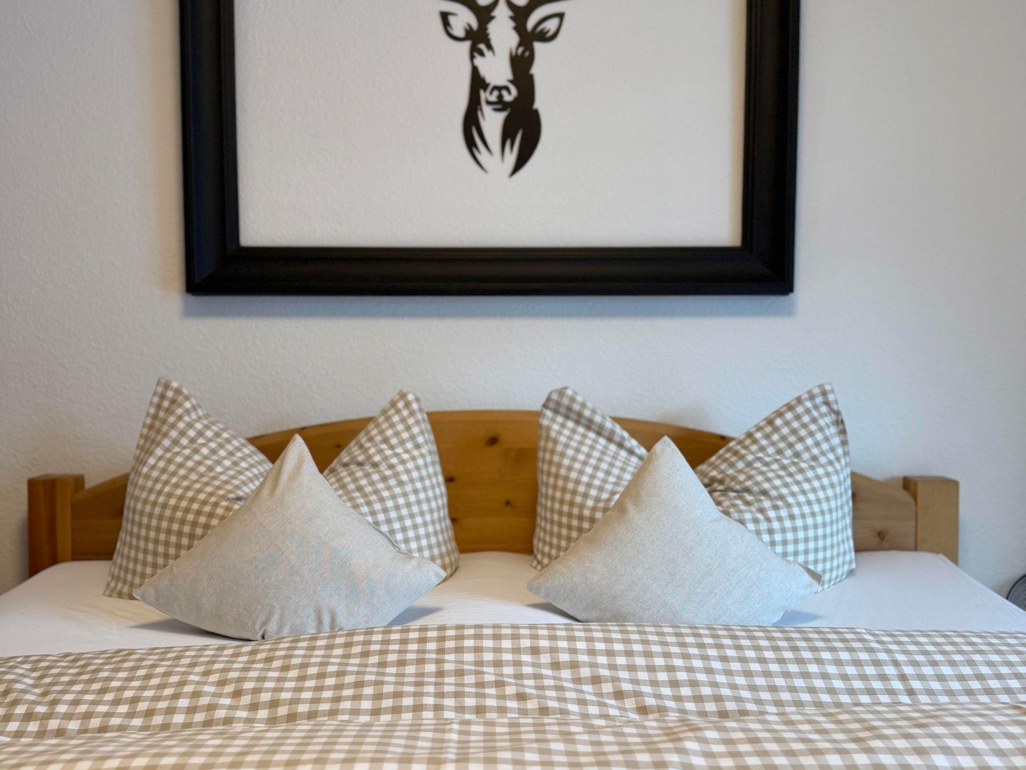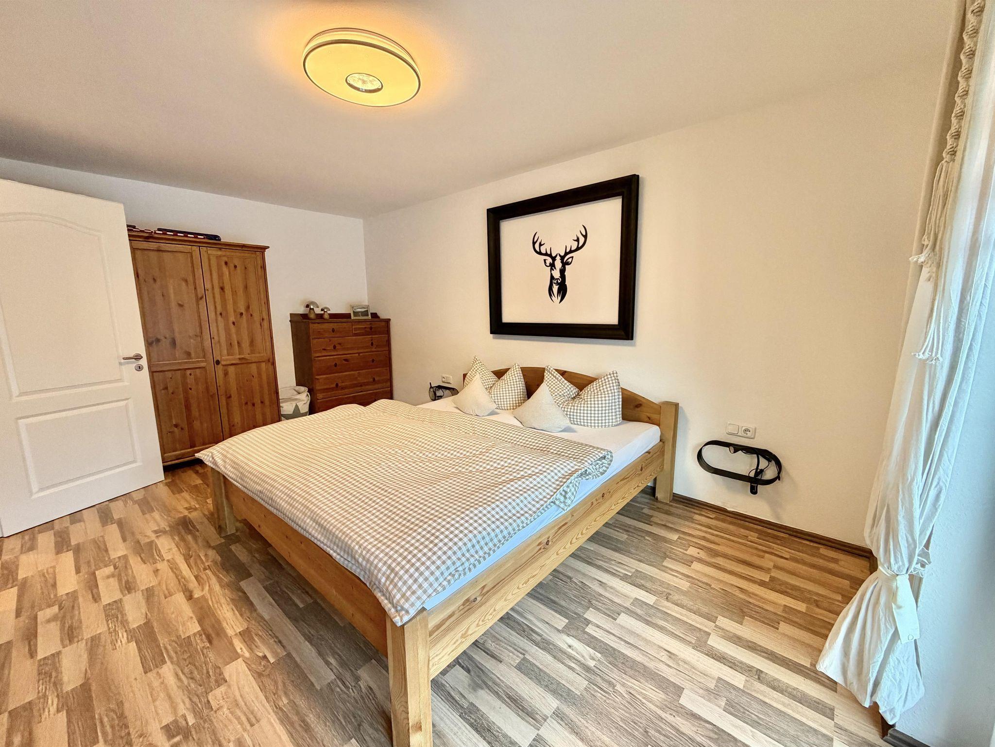 Das Schlafzimmer bietet durch einen Kleiderschrank und eine Kommode ausreichend Platz für eure Garderobe und das 180x200 cm große Bett lädt zum Kuscheln oder Fernsehen ein.