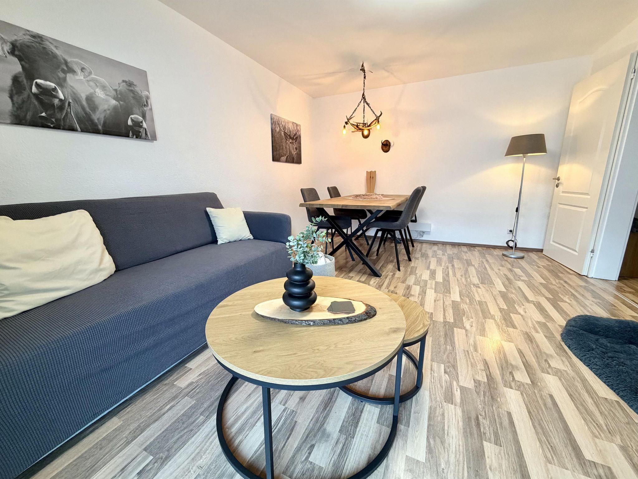Hier befindet sich ein großer Esstisch mit vier Sitzmöglichkeiten und einer Couch mit Beistelltischen.