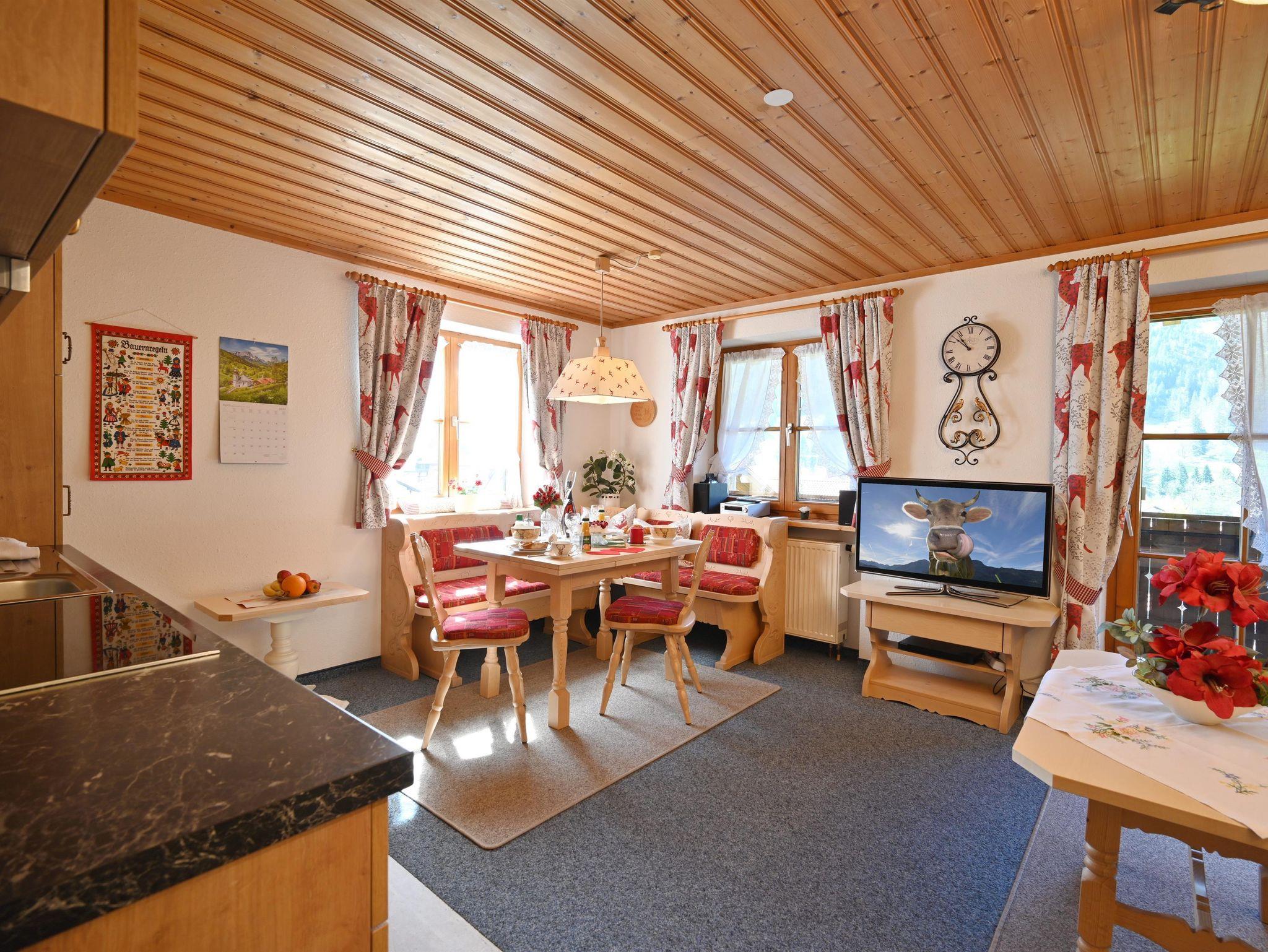 App.1 - mit großem Südbalkon - 4 Sterne Obergeschoß: für 2 Pers.,50 qm, rustikale Einrichtung, komfortable, komplett eingerichtete Wohnküche, separates Schlafzimmer, Dusche/WC, ( mit Massagebrause!), Sateliten-Farb-TV mit 21 Progr., Telefon, Stereoanlage, DVD-/Blu-ray-Player, 2.Farb TV ! (Neue Matratzen-wirbelsäulengerecht!) Träumen Sie in der Ostrachaler Bergwelt !! Genießen Sie unseren herrlichen Obstgarten die große Blumenwiese und den freien Blick in die Ostrachtaler Bergkette! Traumhaft