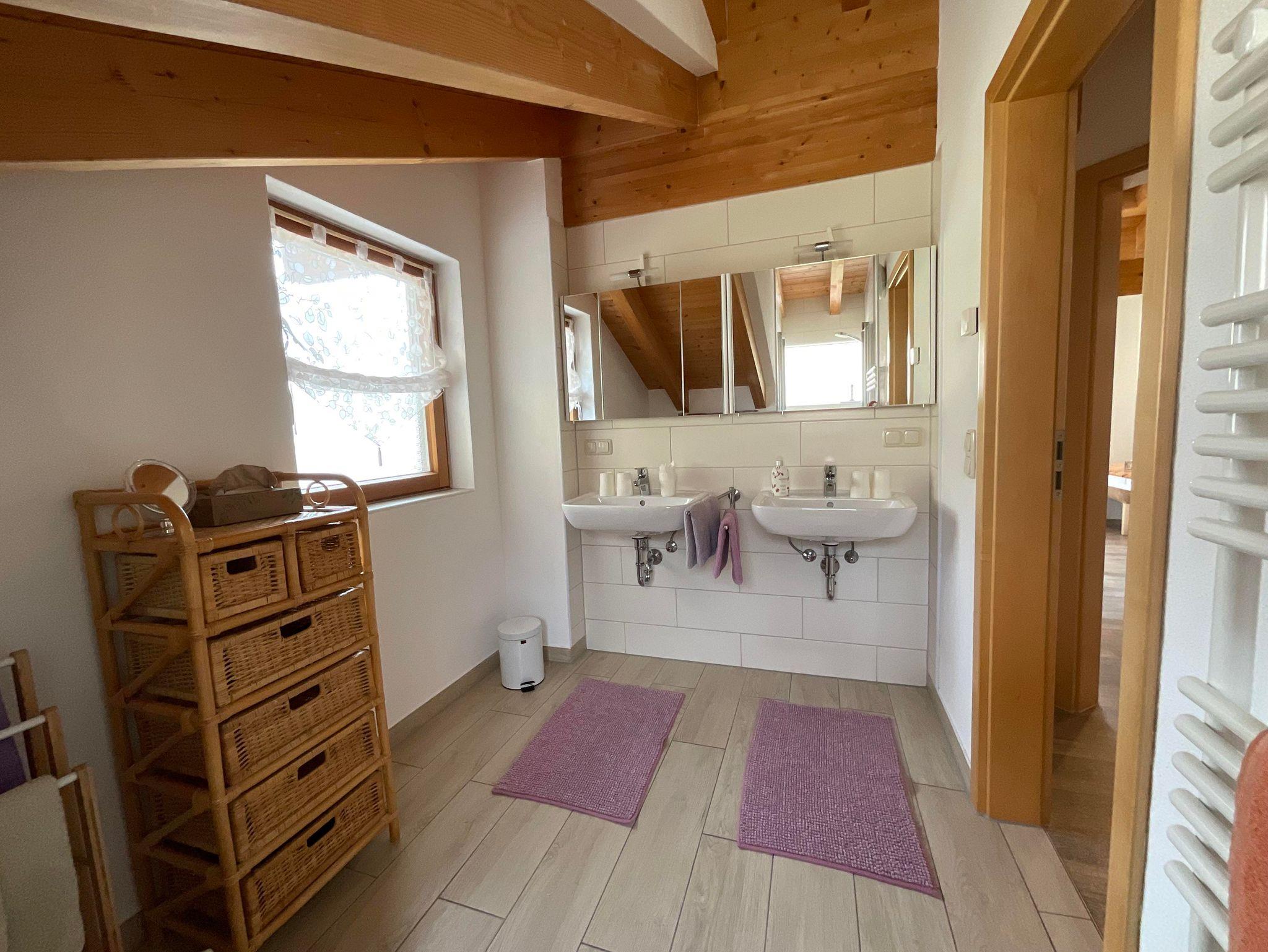 Badezimmer mit ebenerdiger Dusche und Doppelwaschtisch & sep. WC, Haartrockner;