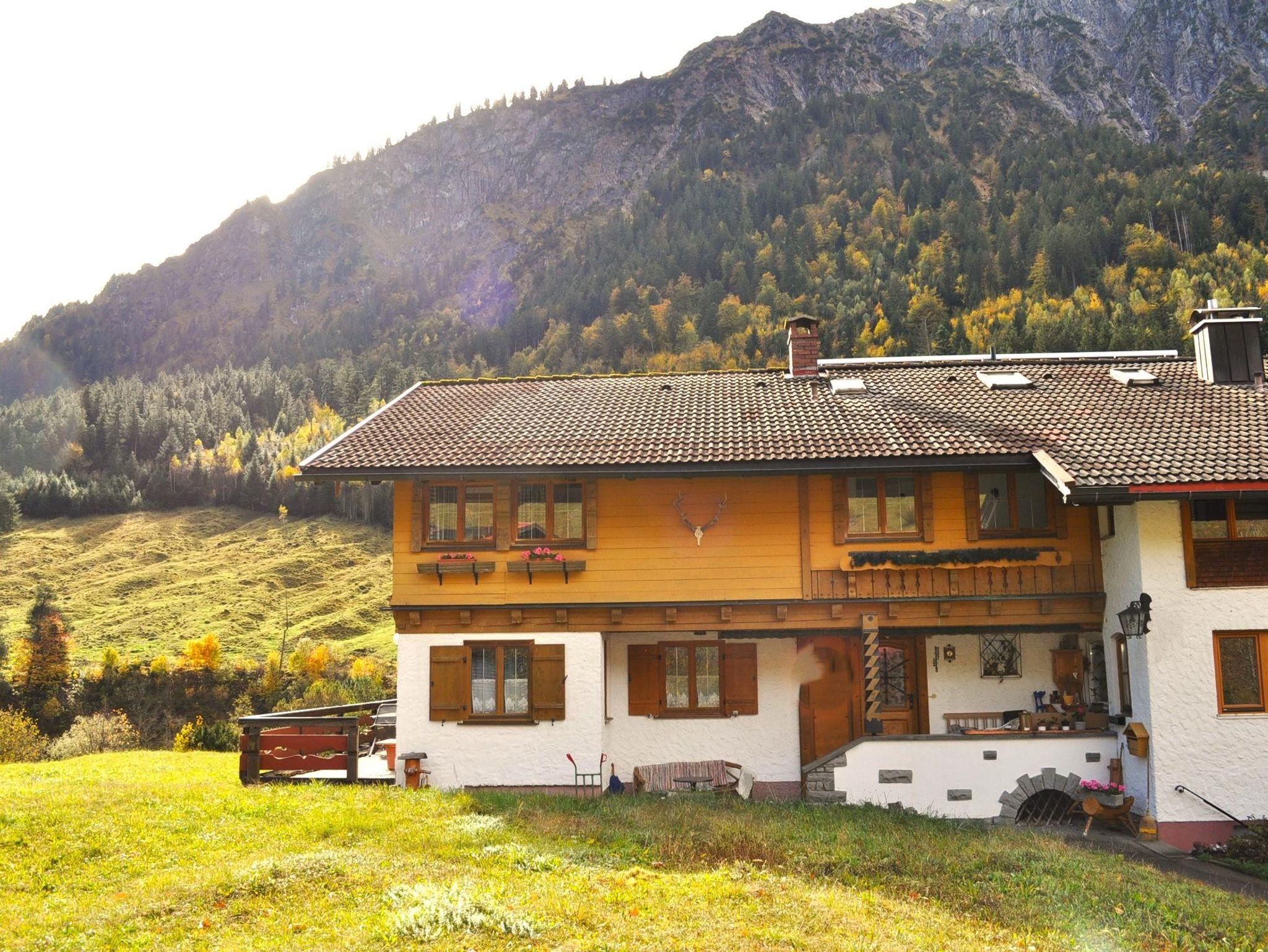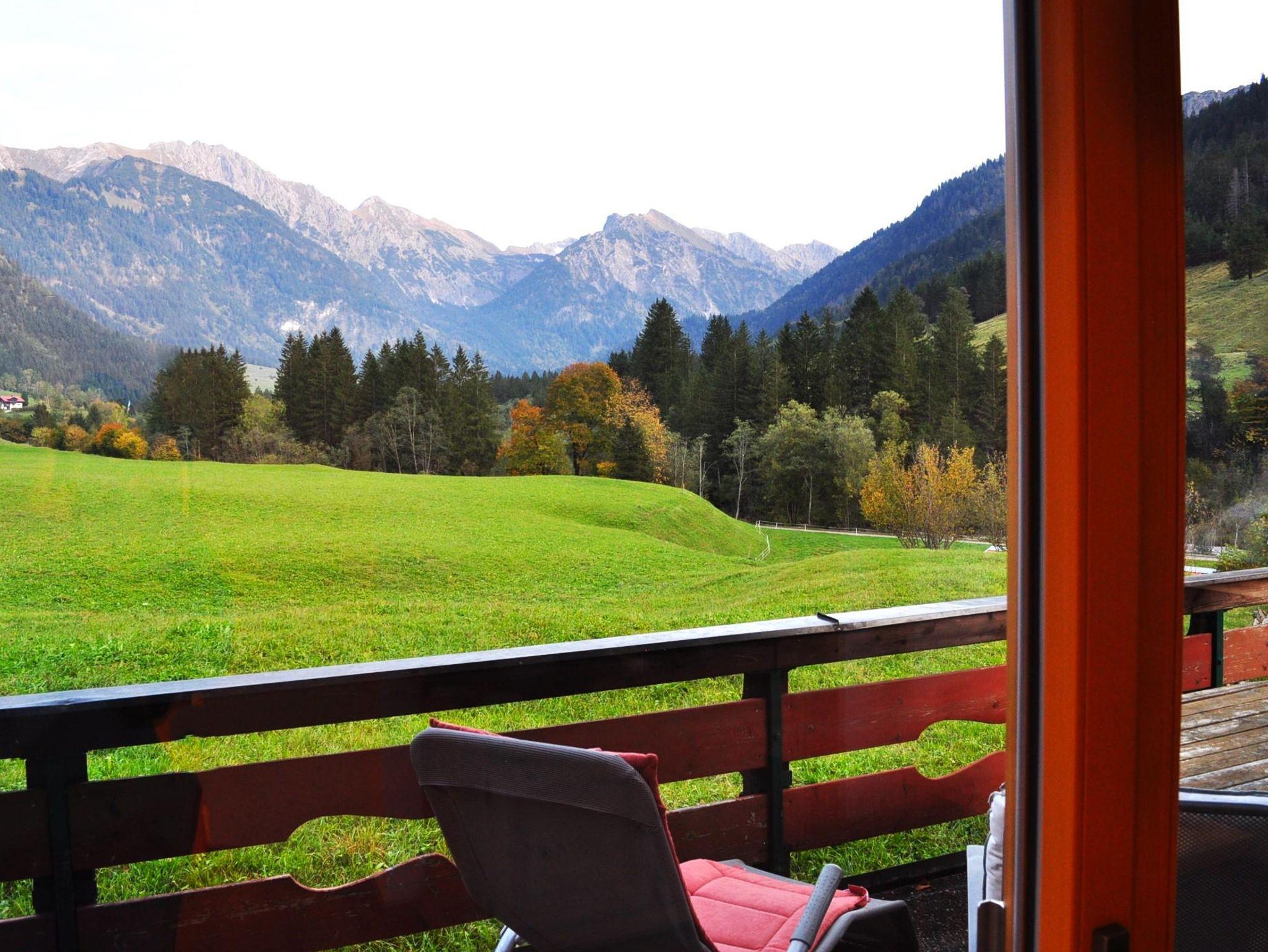 Neu renovierte Ferienwohnung im Erdgeschoss mit Terrasse Richtung Osten. Freier Ausblick auf das Bergdorf Hinterstein und die Allgäuer Hochalpen. Moderne Küche, sep. Schlafzimmer, Tageslicht-Badezimmer.