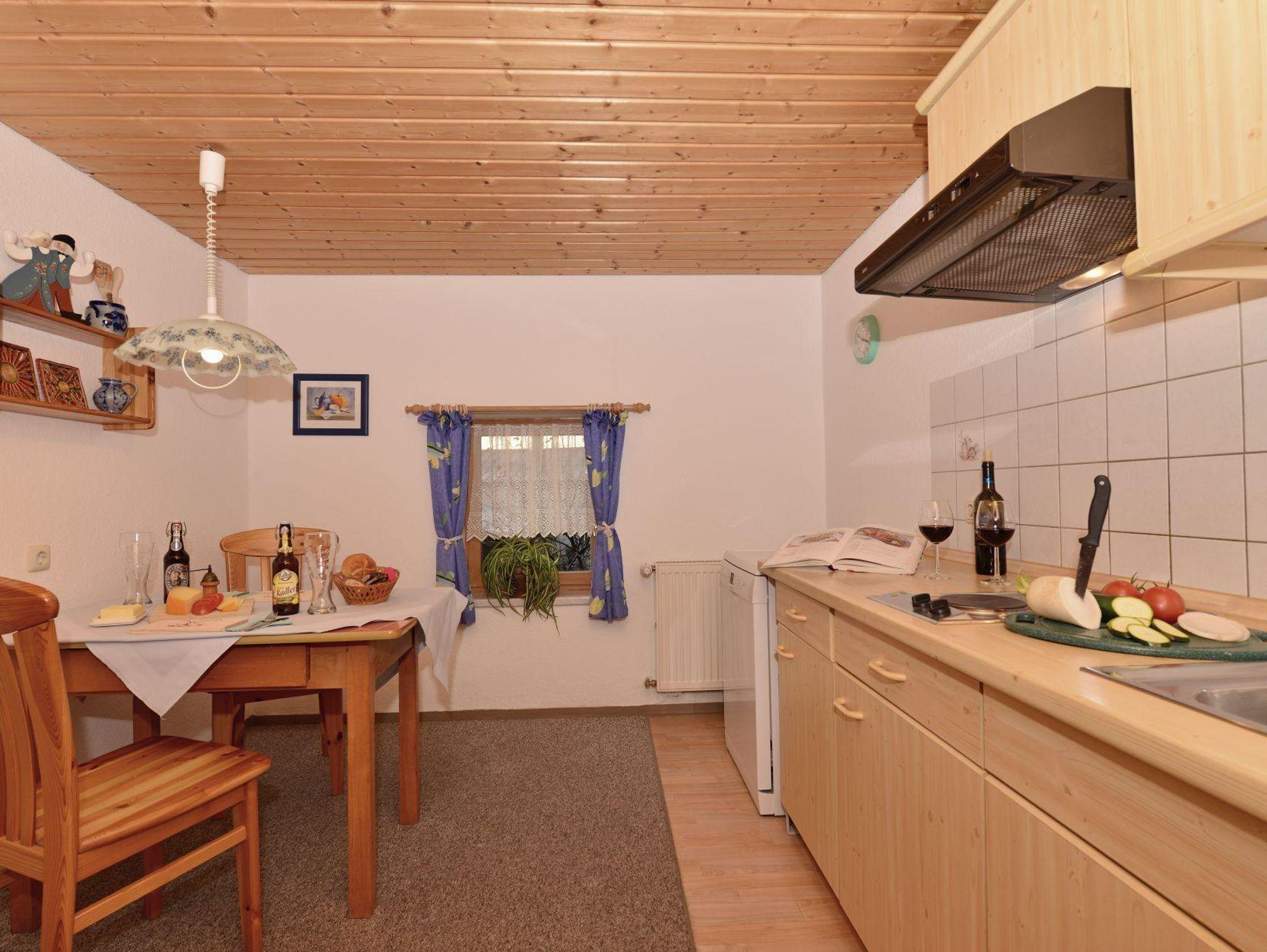 Die Küchenzeile ist komplett ausgestattet mit Geschirrspüler, Mikrowelle,Toaster, Kaffeemaschine, Kochfeld, Geschirr.