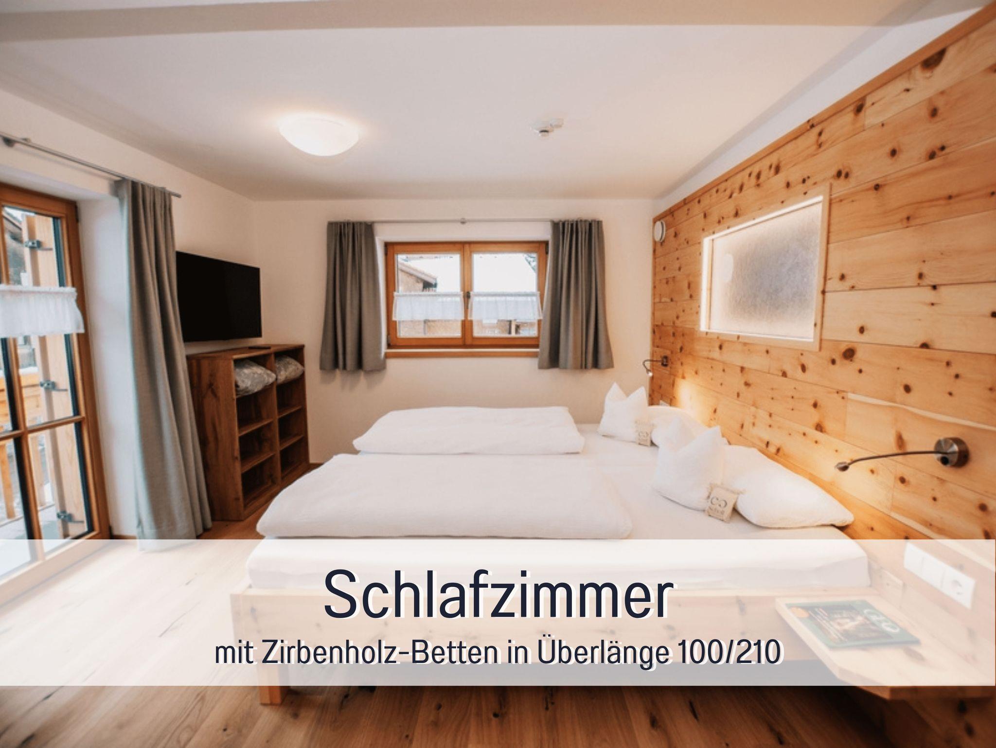 • ein Schlafzimmer mit einem Doppelbett aus Zirbe in Überlänge