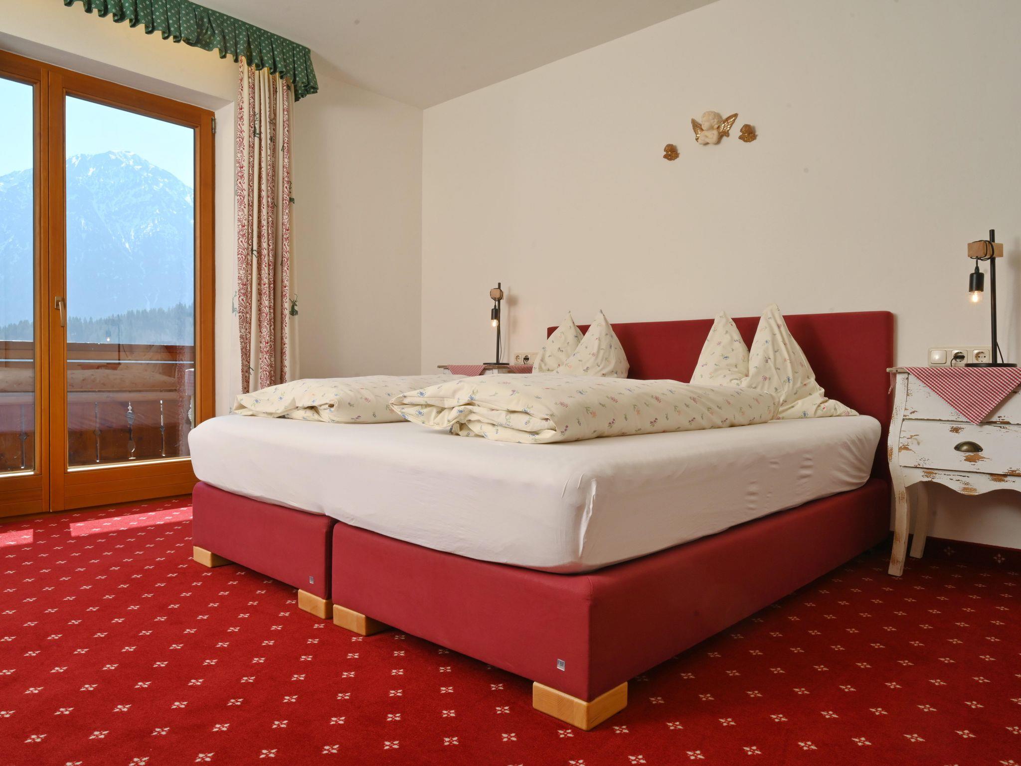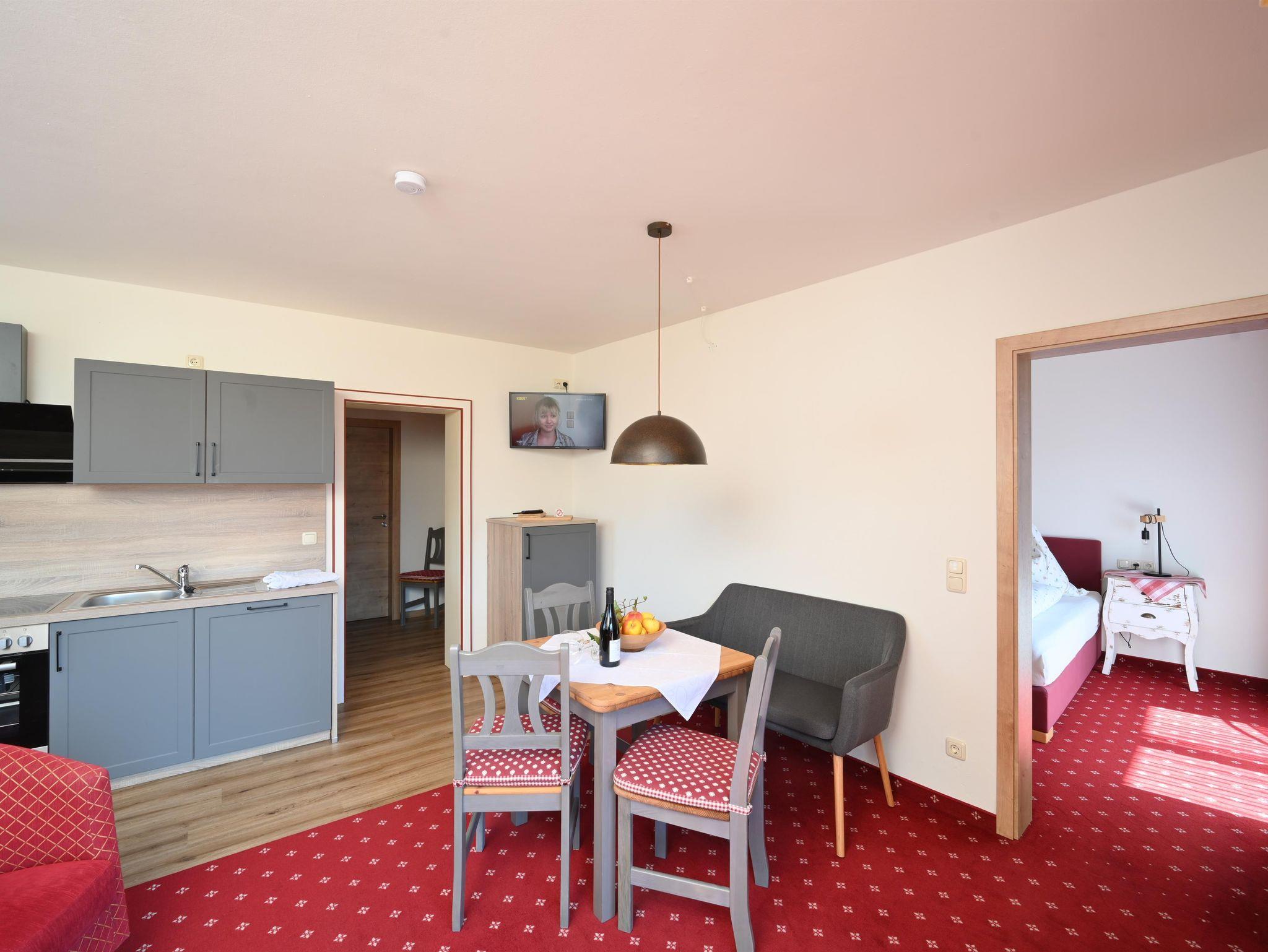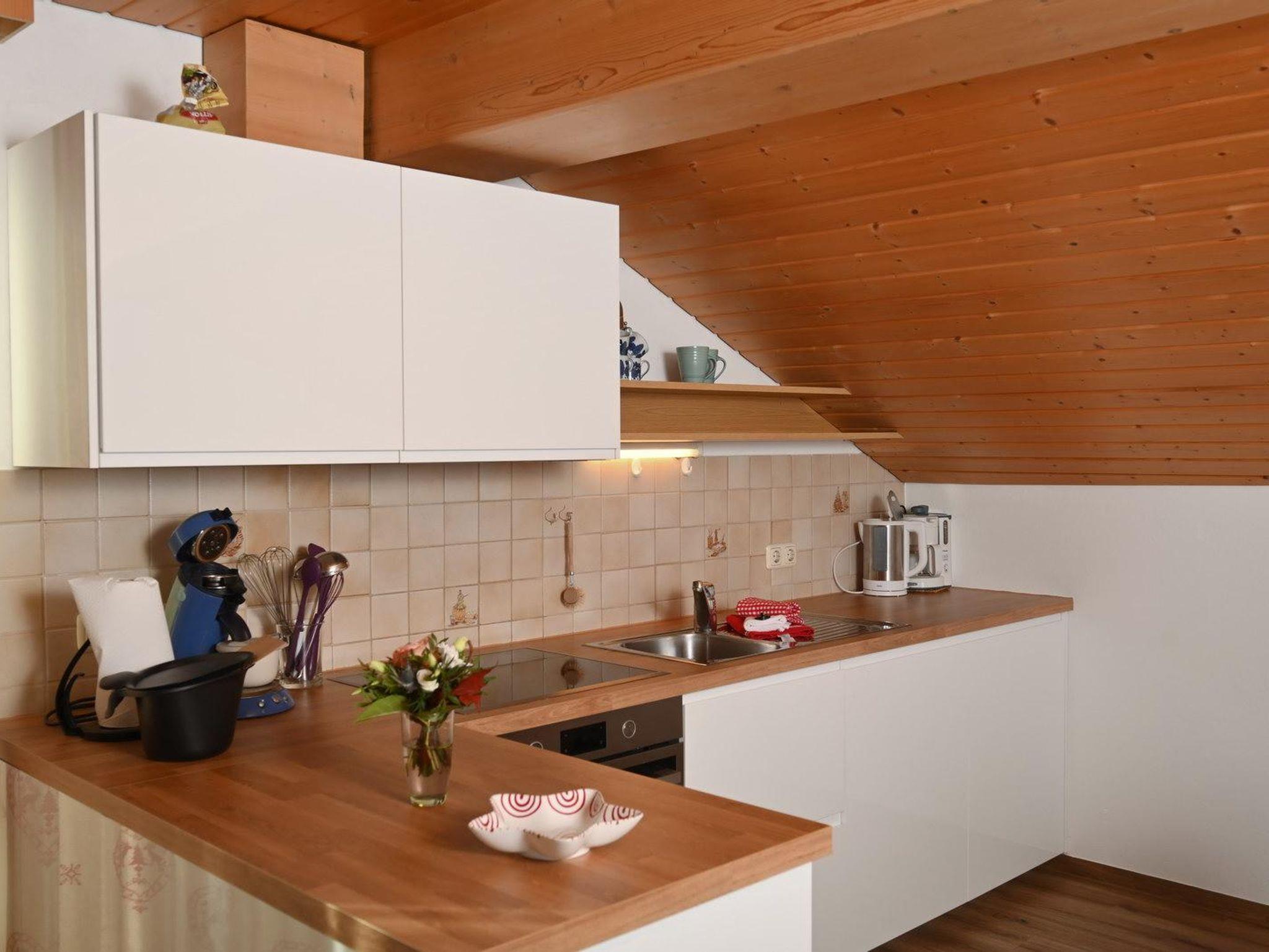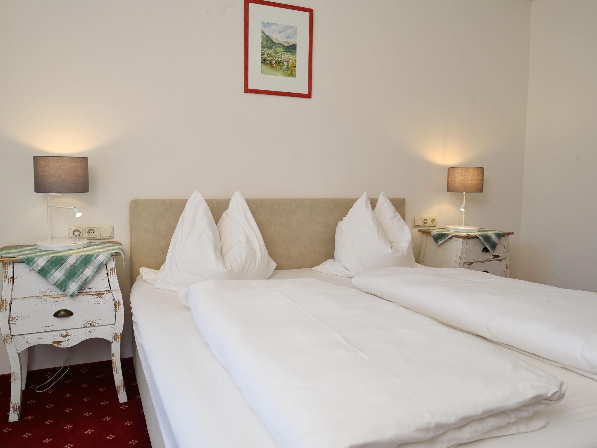 Gemütliche Ferienwohnung im Dachgeschoss für 1-2 Personen. Westbalkon mit herrlichem Bergblick, Badewanne und WC, Couchgarnitur zum entspannen, komplett eingerichtete Küche mit Eckbank im Wohnbereich (zusätzliche Schlafmöglichkeit), separates Schlafzimmer mit Boxspringbetten.