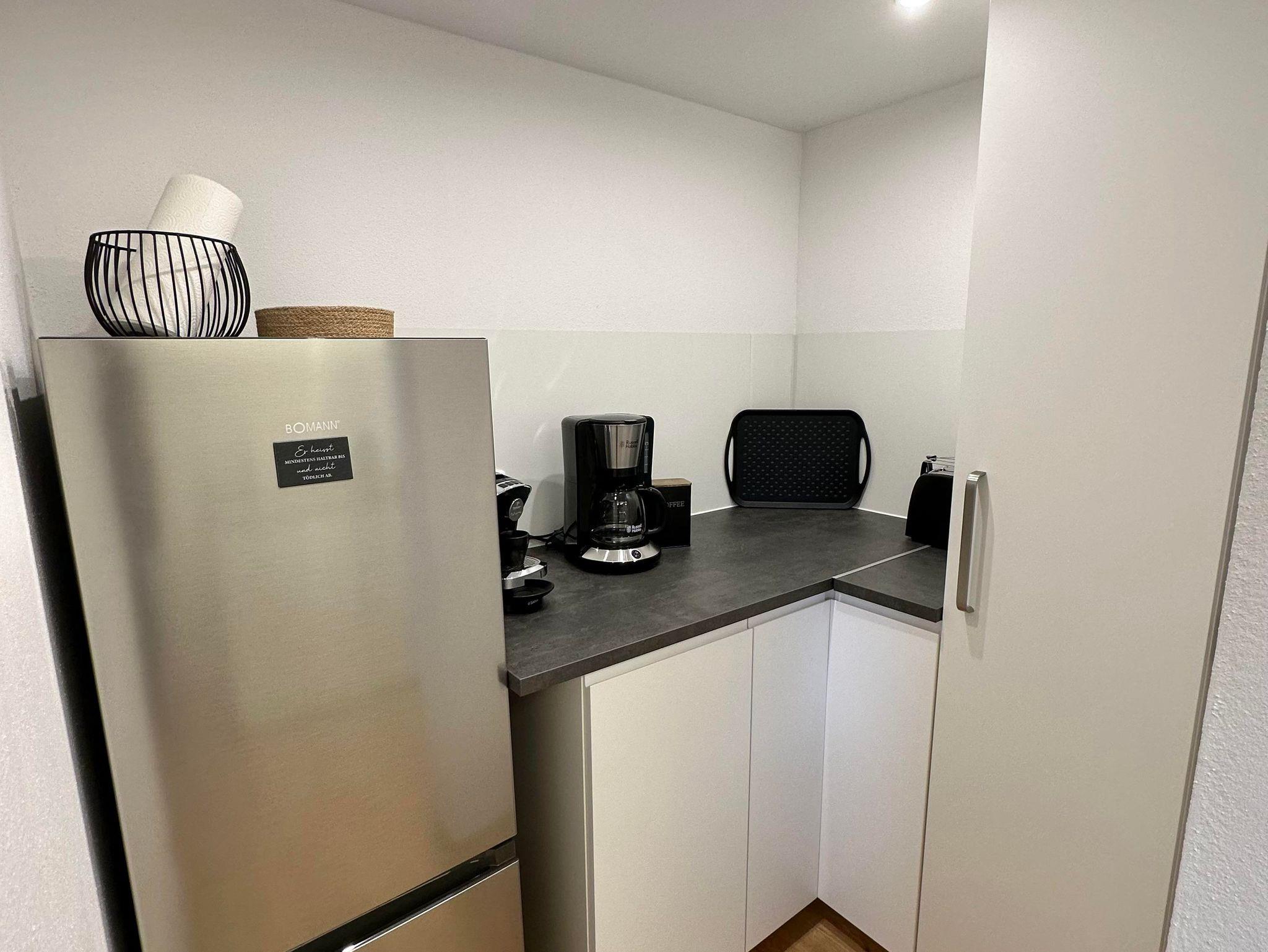 Die vollausgestattete Küche besitzt einen Herd mit Backofen, eine Geschirrspülmaschine und einen Kühlschrank mit Gefrierfach.