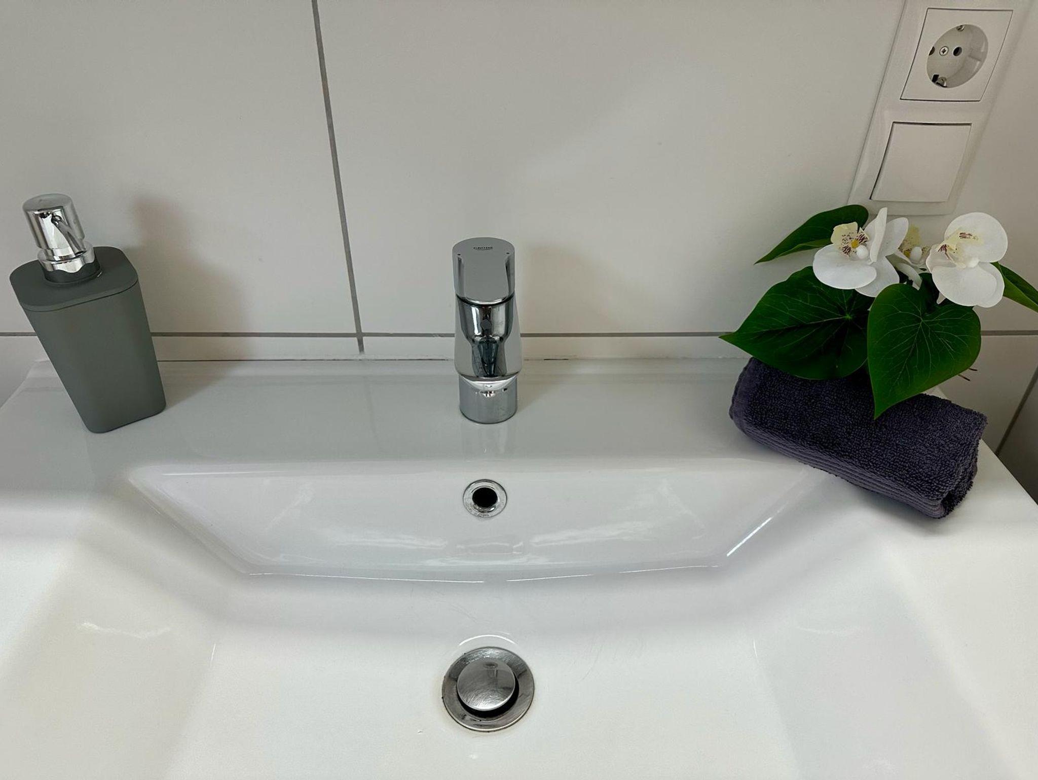 Das Badezimmer ist mit einer geräumigen Dusche, einem Fön, sowie Handtüchern und Seife ausgestattet, die inklusive sind. Bettwäsche ist ebenfalls im Preis inbegriffen.