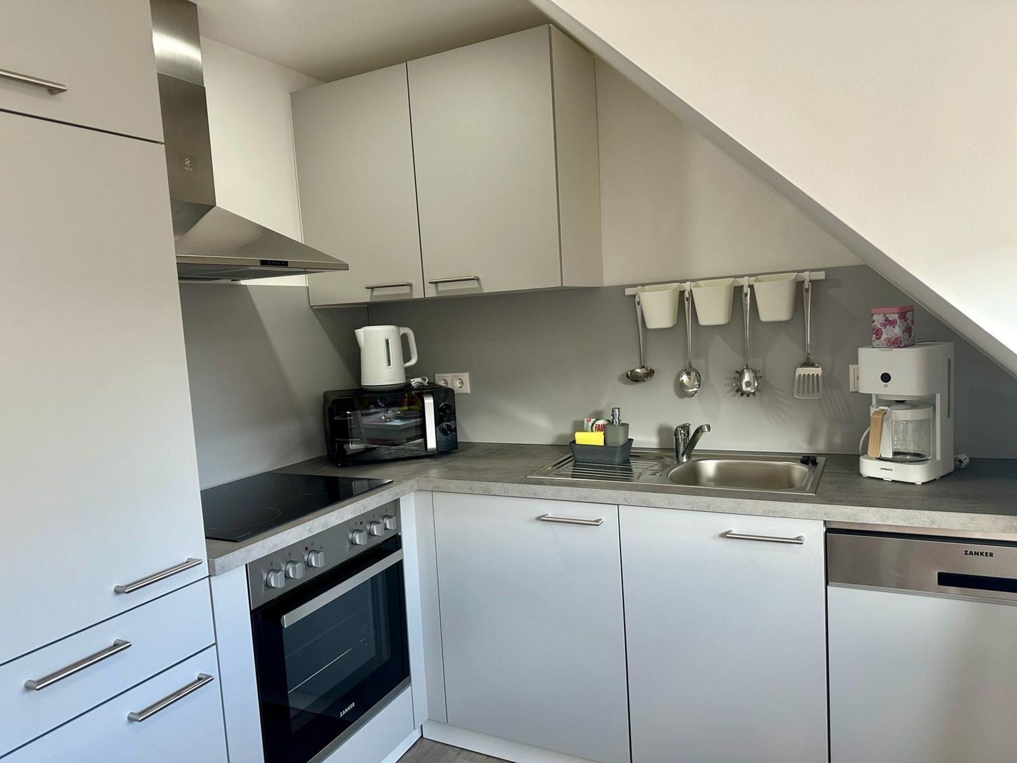 Die Küche ist vollständig ausgestattet mit einem Backofen, einer Mikrowelle, einem Kühlschrank, einer Spülmaschine, einem Wasserkocher, einer Kaffeemaschine, sowie Besteck und Kochutensilien. Hier können Sie sich bequem Ihre Lieblingsgerichte zubereiten und gemeinsame Mahlzeiten genießen.