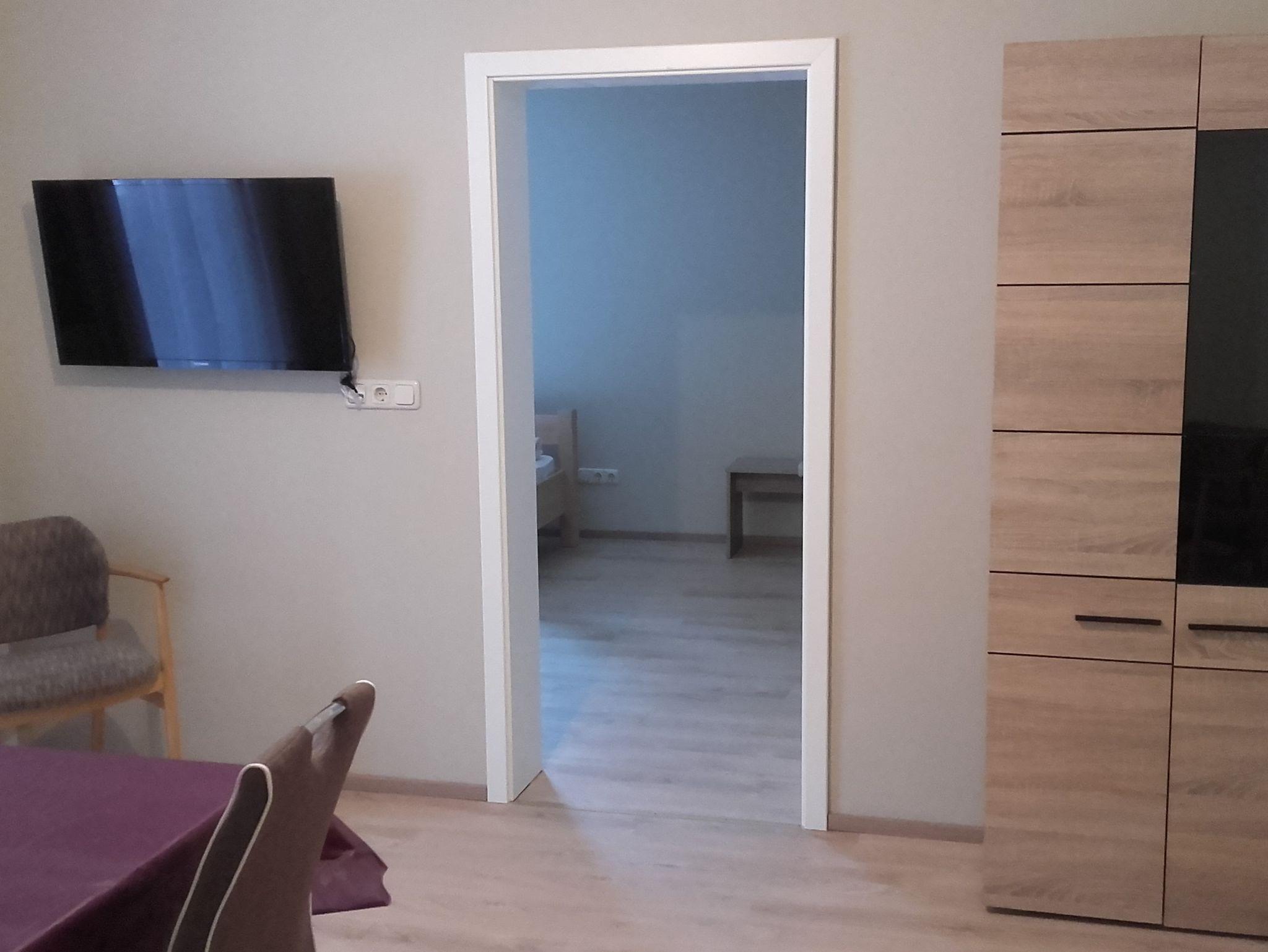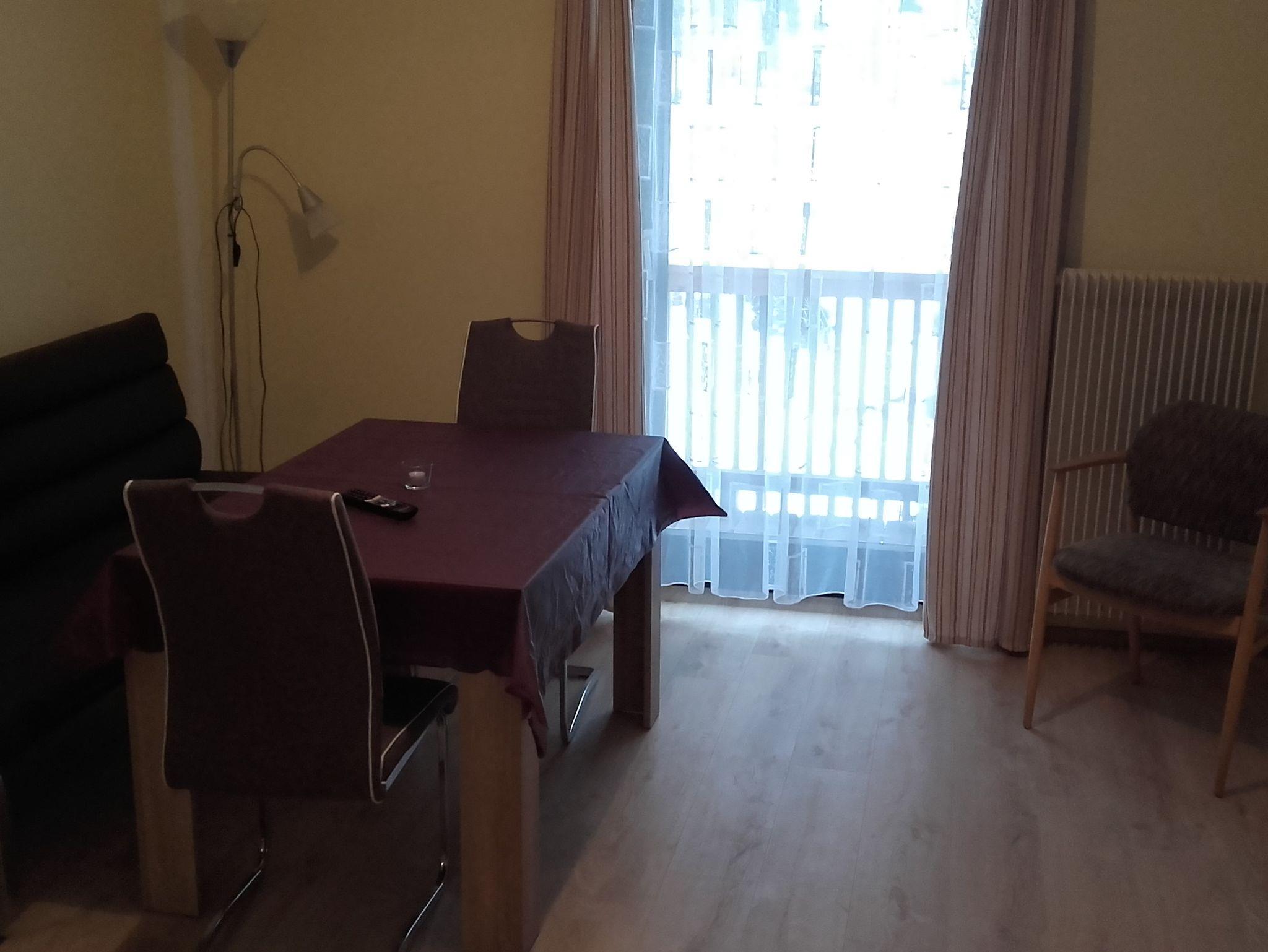 Das Wohnzimmer, bestehend aus einem Wandschrank mit Flachbildfernseher sowie einem Esstisch mit Sitzgelegenheit, verfügt über einen LAN- Anschluss. Des Weiteren ist W-LAN frei verfügbar. Auch vom Wohnzimmer ausgehend kann man direkt auf den Balkon.