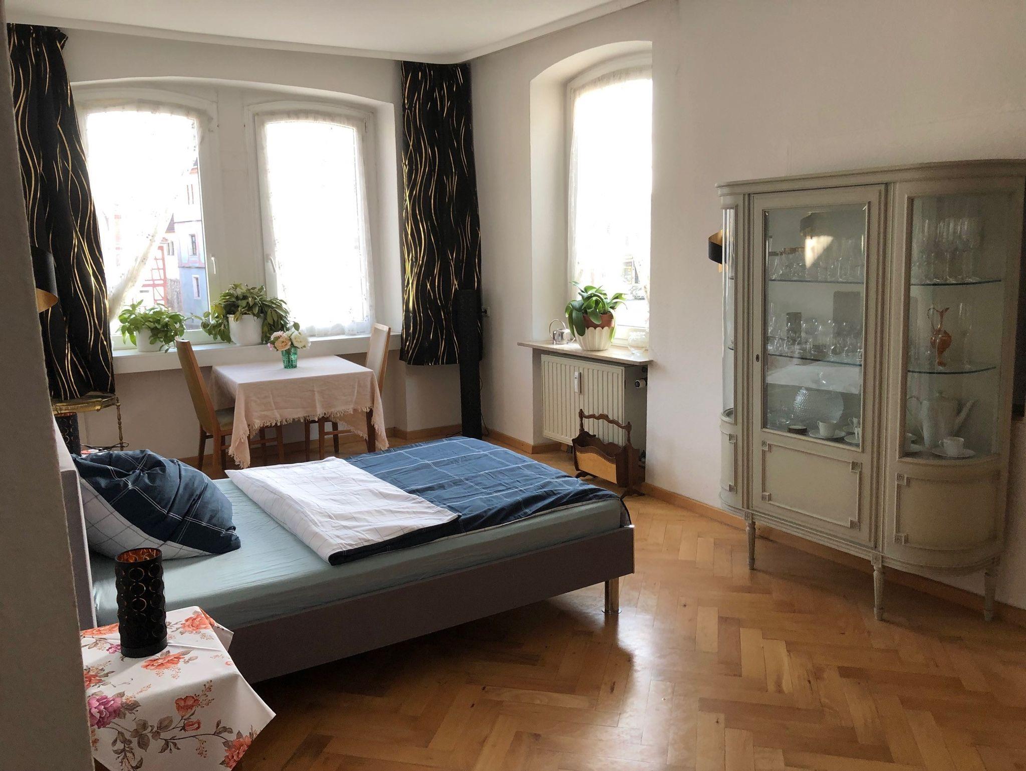 Diese wunderschöne Wohnung ist im 1. OG des Gebäudes und über den Hintereingang der Einbahnstraße (Schlundstr.) erreichbar. Sie wurde gerade im vorderen Bereich modernisiert und mit einer neuen Küche ausgestattet. Der hintere Bereich hat noch ein paar alte Erinnerungen an die Zeit des Hotel Heintz, die wir gerne und bewusst so erhalten haben. Die erweiterte Wohnung ist sehr verwinkelt und verspielt, was den alten Charakter des Hauses widerspiegelt. Ein Highlight ist das licht-durchflutete Wohnzimmer (3 große Fenster der Mitte des 1. LGs), das zum Genießen und Entspannen einlädt, mit dem schönsten Blick auf den Marktplatz und das Rathaus. Dieses Zimmer war früher der Frühstücksraum der Hotelgäste vom ehem. Hotel Heintz