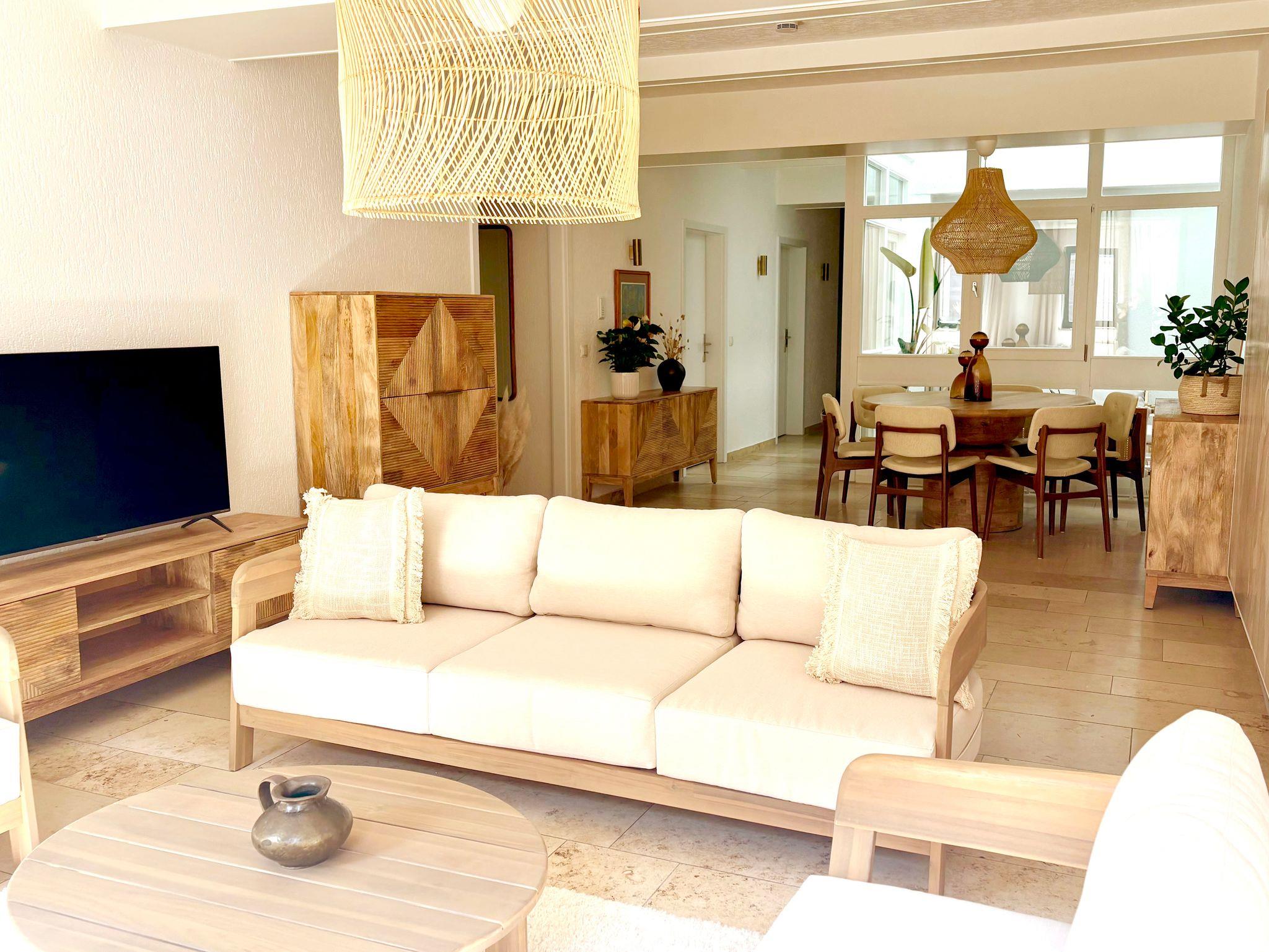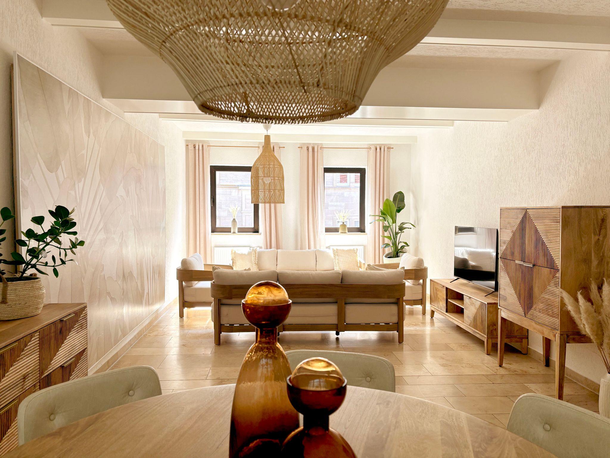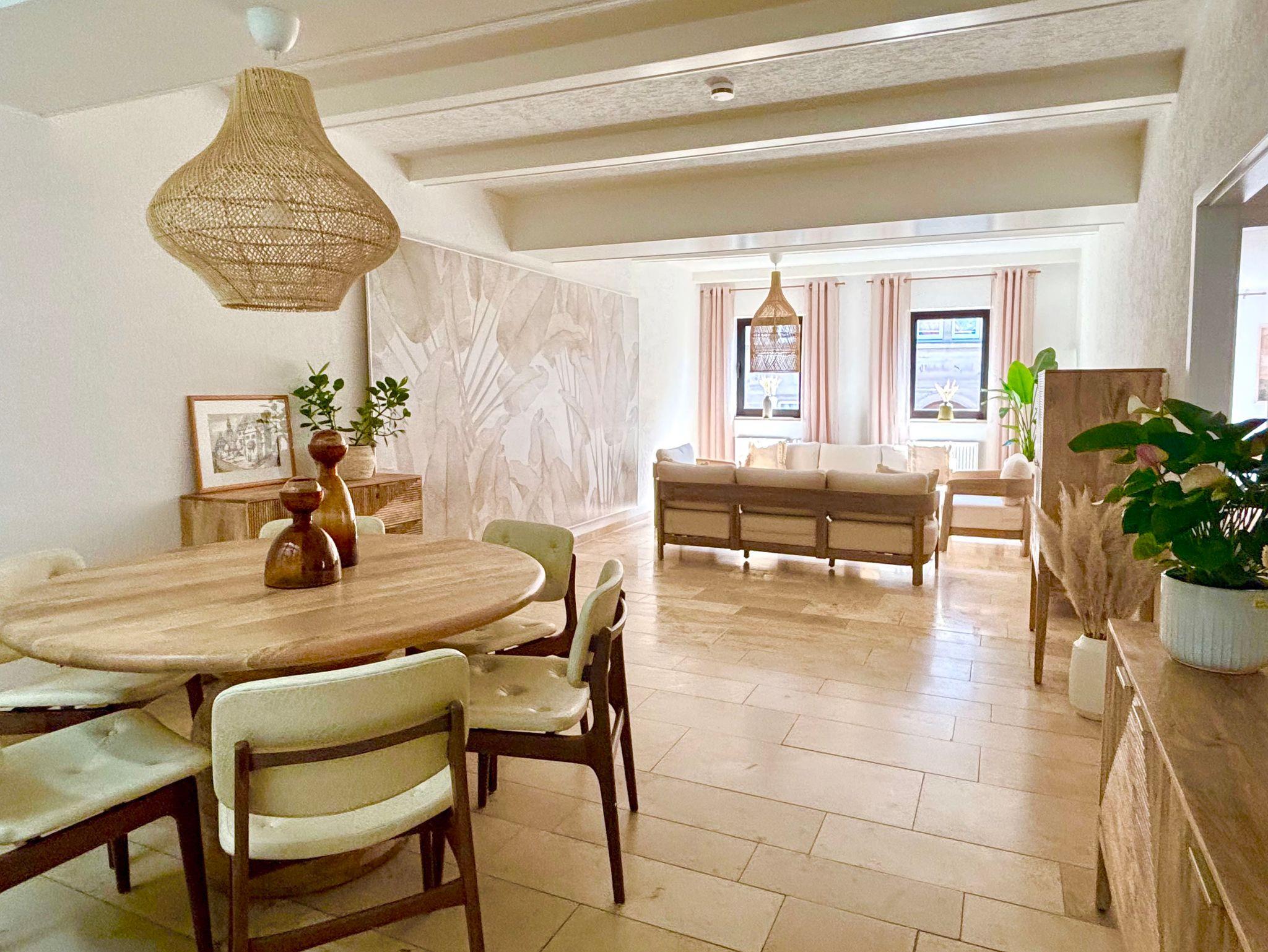 - Helles, stilvoll eingerichtetes Wohnzimmer mit gemütlichen Essbereich und TV