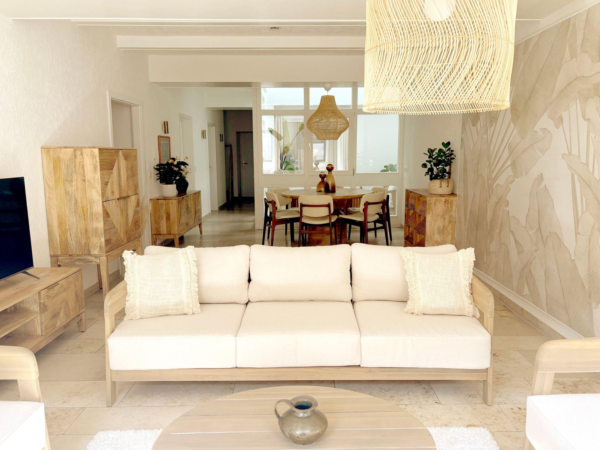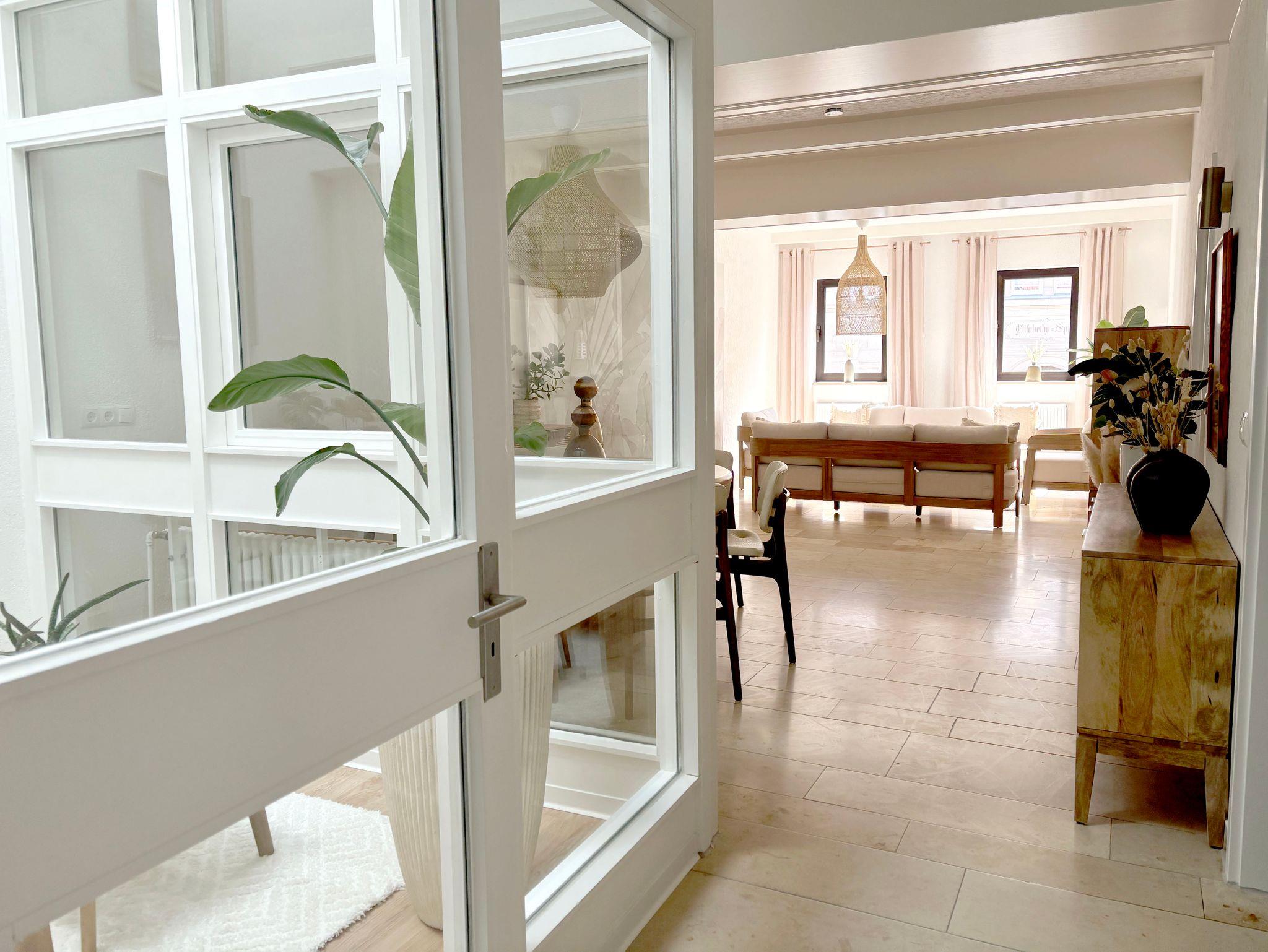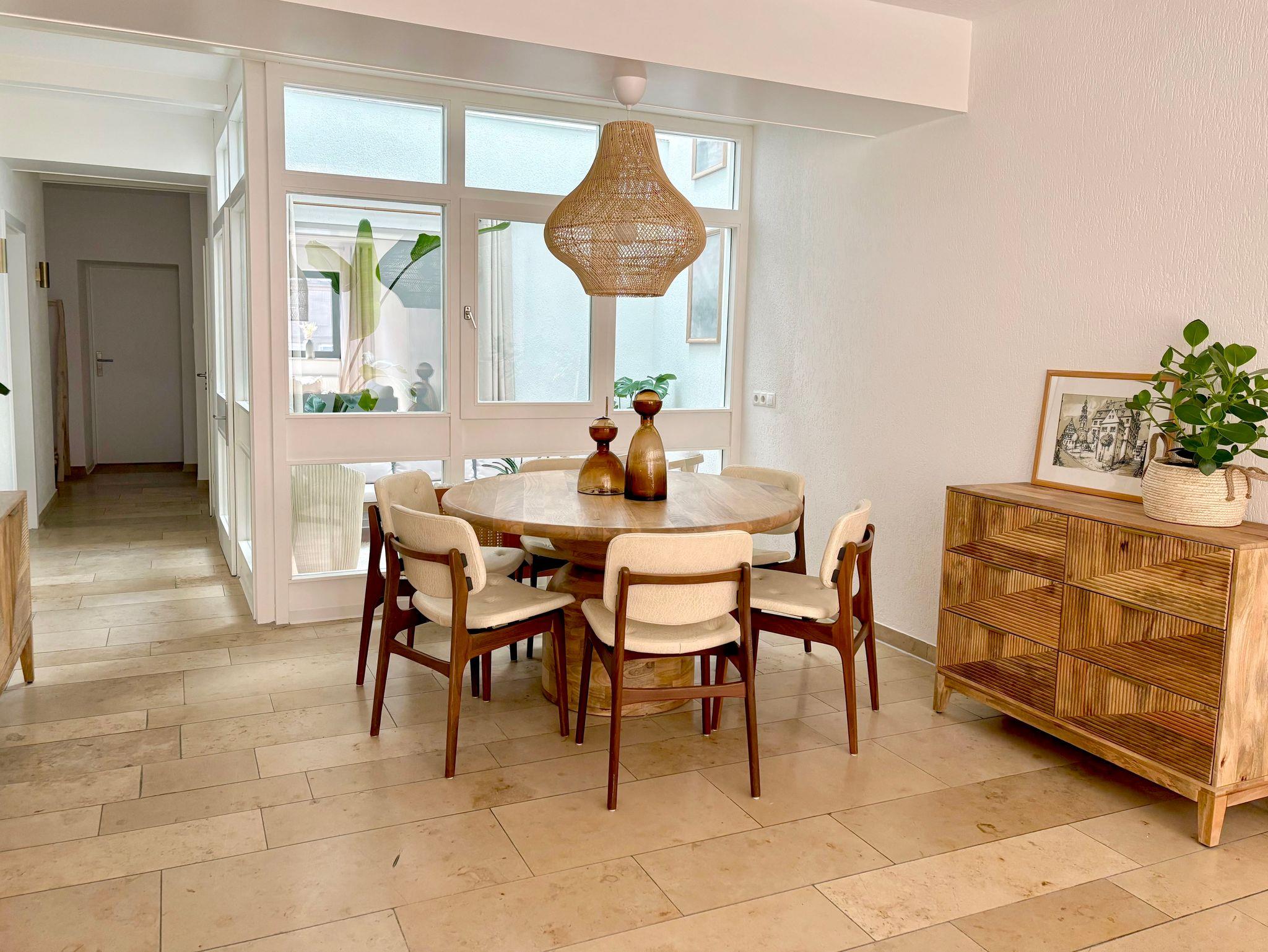 - Helles, stilvoll eingerichtetes Wohnzimmer mit gemütlichen Essbereich und TV