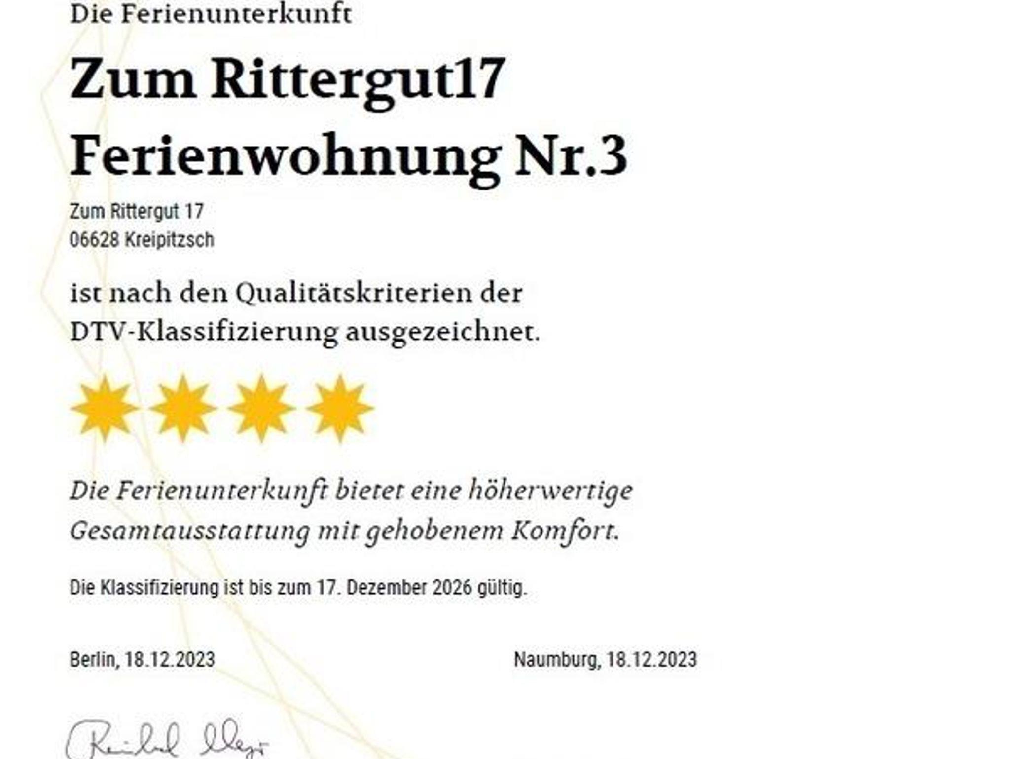 Die Ferienwohnung wurde im Dezember 2023 vom Deutschen Tourismusverband mit vier Sternen nach den Qualitätskriterien der DTV-Klassifizierung ausgezeichnet.