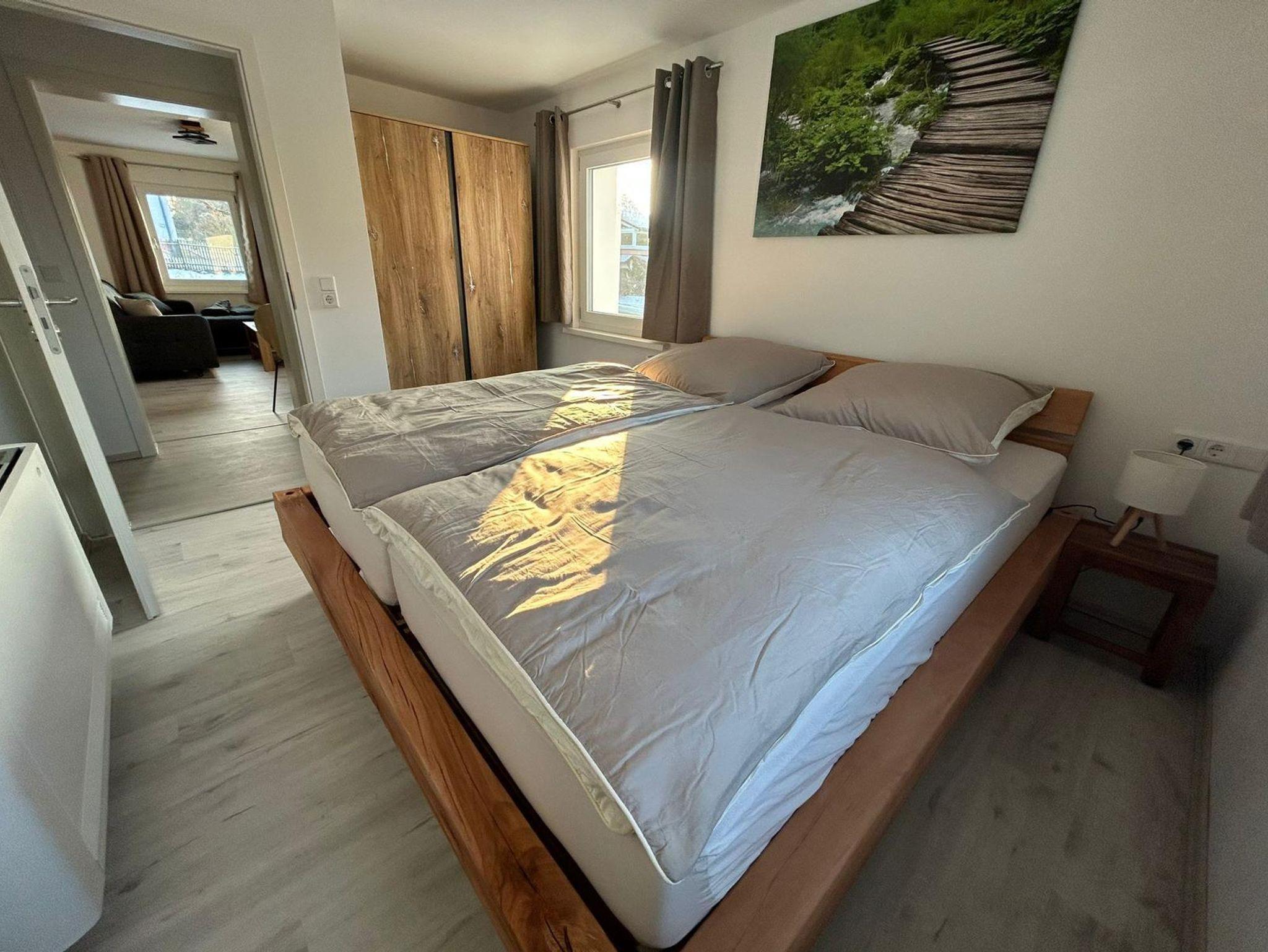 Unsere neue Ferienwohnung mit 50 m² Wohnfläche bietet im Erdgeschoss mit Gartenblick Platz für 1-4 Personen. Die gemütliche Wohnküche mit Sofa und Flachbild-TV lädt zum Verweilen ein. Die komplett ausgestattete Küchenzeile mit Geschirrspüler, Kühlschrank inkl. Gefrierfach, Herd, Backofen, Mikrowelle, Wasserkocher, Toaster und Kaffeemaschine lässt keine Wünsche offen. Die Ferienwohnung verfügt über zwei separate Schlafzimmer mit einem Doppelbett und zwei Einzelbetten. Das Badezimmer mit ebenerdiger Dusche, WC, Waschtisch und Handtuchtrockner rundet das Gesamtbild ab. Vor allem im Sommer können Sie entspannte Grillabende in unserem Garten verbringen. Bitte beachten Sie, dass keine Haustiere erlaubt sind. Das WLAN und den Parkplatz vor dem Haus können Sie kostenfrei nutzen.