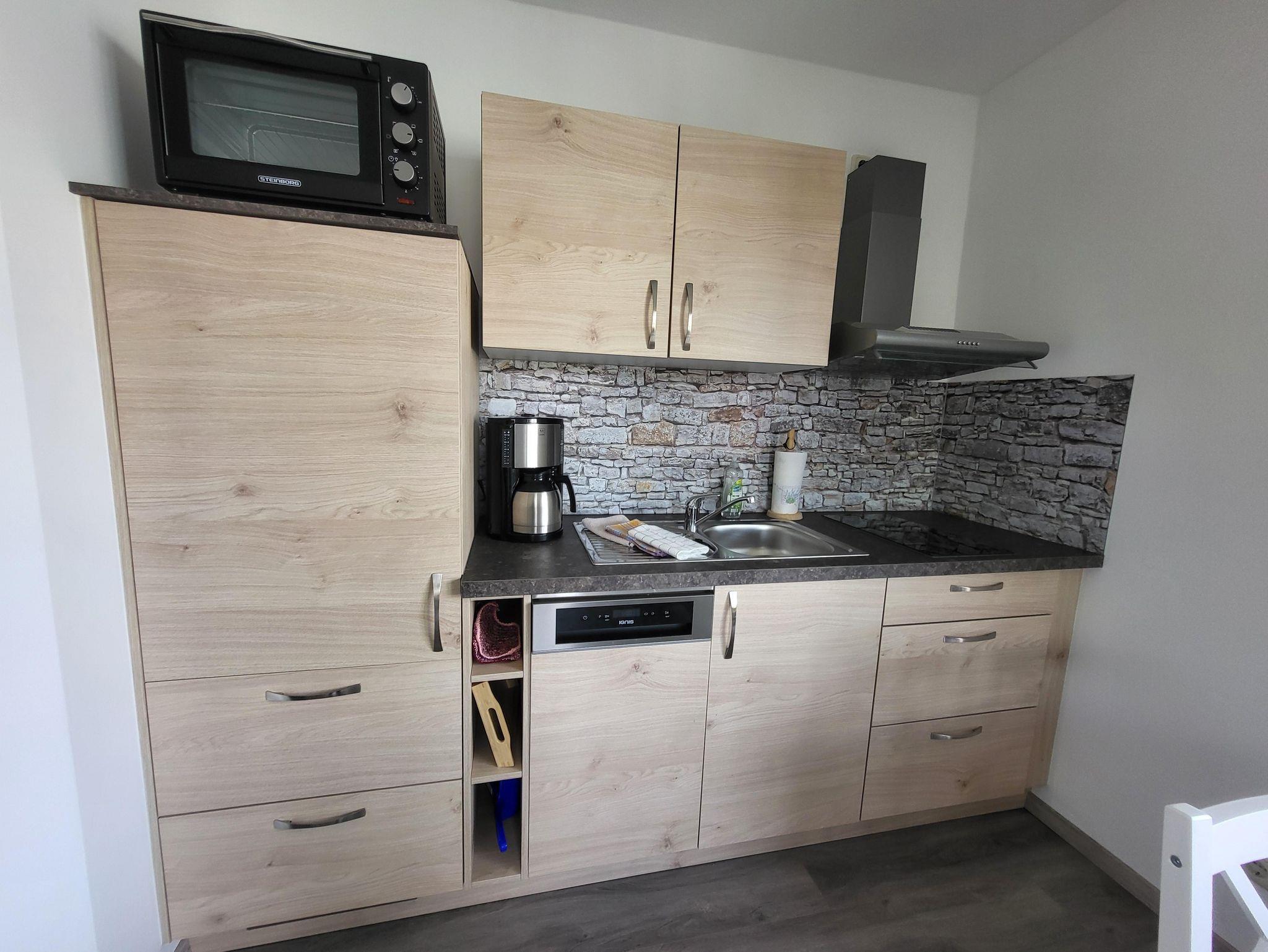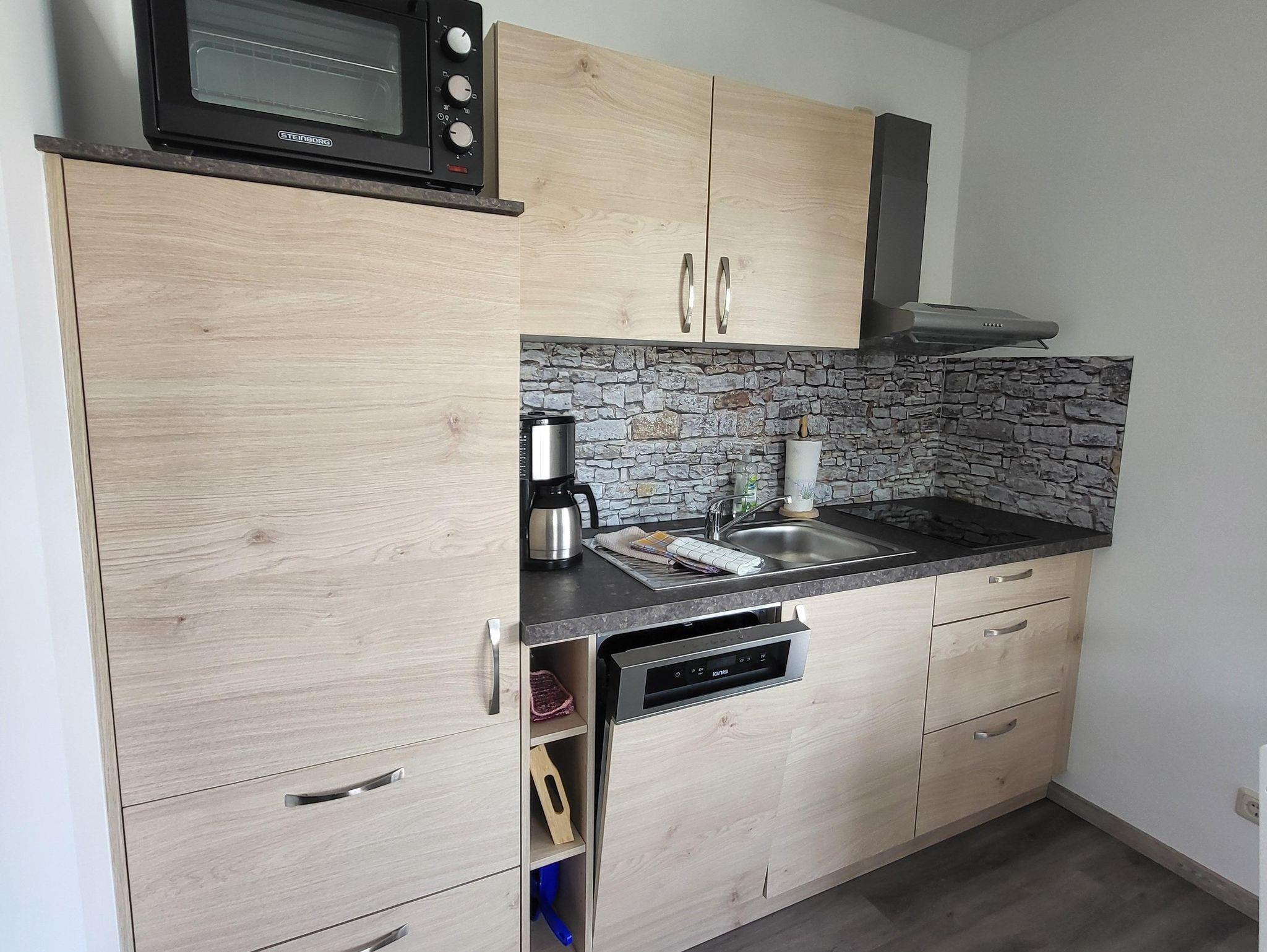 Die eingebaute Küche bietet einen Kühlschrank, Kochfläche, Wasserkocher und Toaster.