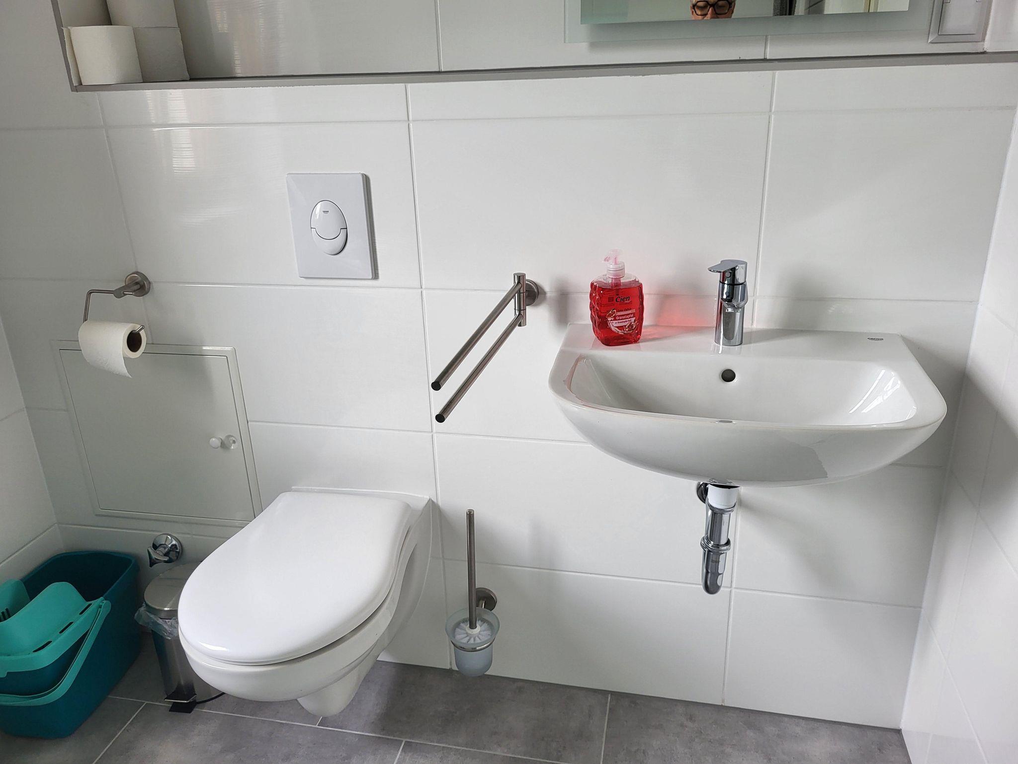 Im sanierten Bad befindet sich eine ebenerdige Dusche und ein Fön ist auch vorhanden.