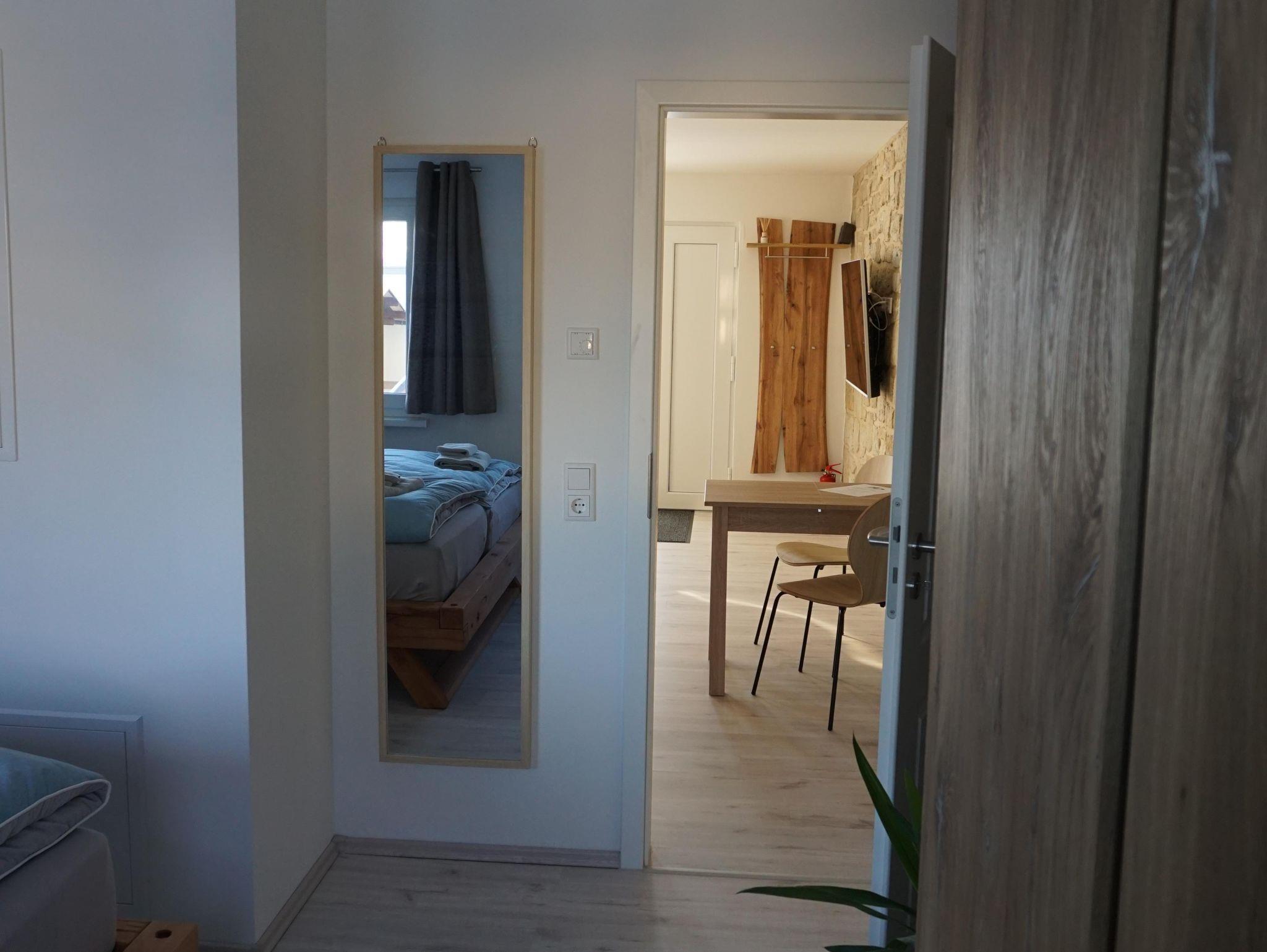 Unsere neue Ferienwohnung mit 40 m² Wohnfläche bietet im Erdgeschoss mit Gartenblick Platz für 1-2 Personen. Die gemütliche Wohnküche mit Sofa und Flachbild-TV lädt zum Verweilen ein. Die komplett ausgestattete Küchenzeile mit Geschirrspüler, Kühlschrank inkl. Gefrierfach, Herd, Backofen, Mikrowelle, Wasserkocher, Toaster und Kaffeemaschine lässt keine Wünsche offen. Die Ferienwohnung verfügt über ein separates Schlafzimmer mit einem Doppelbett. Das Badezimmer mit ebenerdiger Dusche, WC, Waschtisch und Handtuchtrockner rundet das Gesamtbild ab. Vor allem im Sommer können Sie entspannte Grillabende in unserem Garten verbringen. Bitte beachten Sie, dass keine Haustiere erlaubt sind. Das WLAN und den Parkplatz vor dem Haus können Sie kostenfrei nutzen.