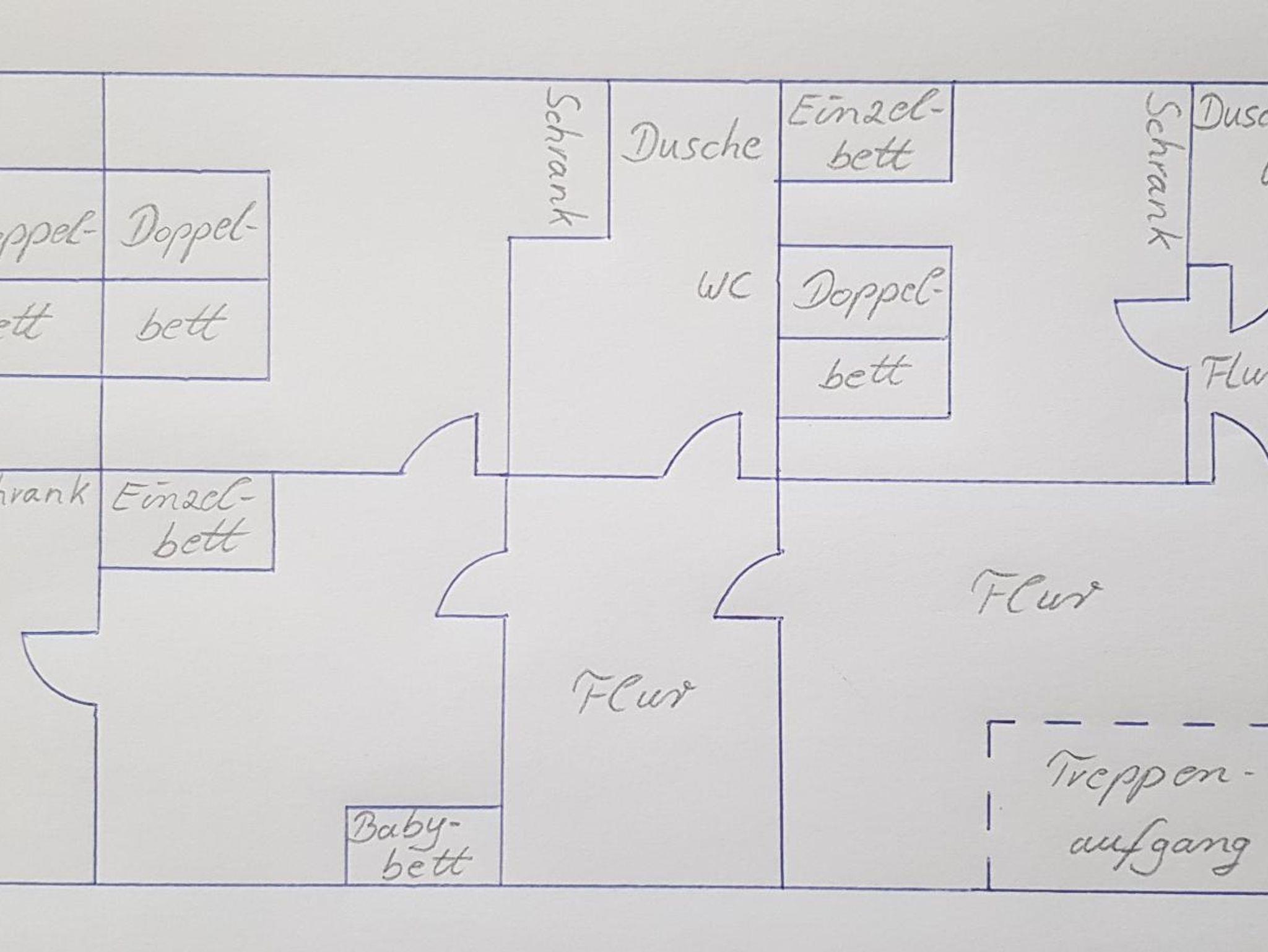 Ferienhaus (210 qm) für bis zu 13 Personen: Im Erdgeschoss befindet sich ein großes Wohnzimmer mit Sat-TV, Couchgarnituren, eine große Küche mit Geschirrspülmaschine, Ceranfeld, Backofen, Mikrowelle, 2x Kaffeemaschine, Wasserkocher, Toaster, sowie ein WC und zwei Duschen. Zwischen der Küche und dem Fernsehraum befindet sich noch der Ess- und Aufenthaltsraum mit Kachelofen. Im Obergeschoss sind 6 Schlafzimmer mit: 3 Doppelbettzimmer, 2x 3-Bett-Zimmer und ein 1-Bett-Zimmer mit Kinderbett. Außerdem noch zwei Bäder mit Dusche und WC. Waschmaschine auf Anfrage. Vor dem Haus befindet sich eine Liegewiese, eine große überdachte Terrasse mit Gartenmöbeln, Grill, Feuerschale, sowie ein Brunnen. Die Betten sind bereits bezogen!