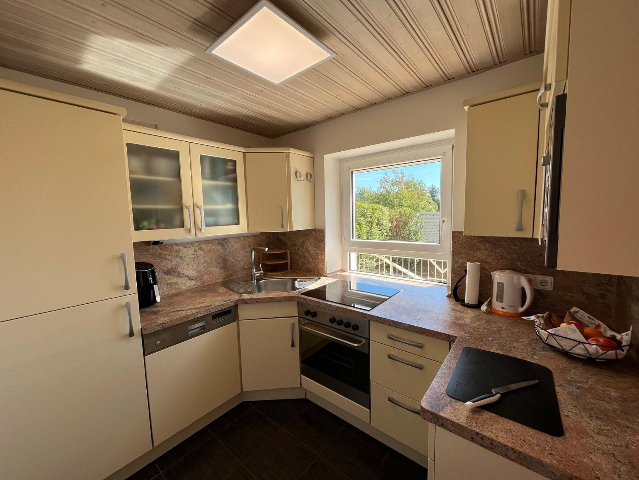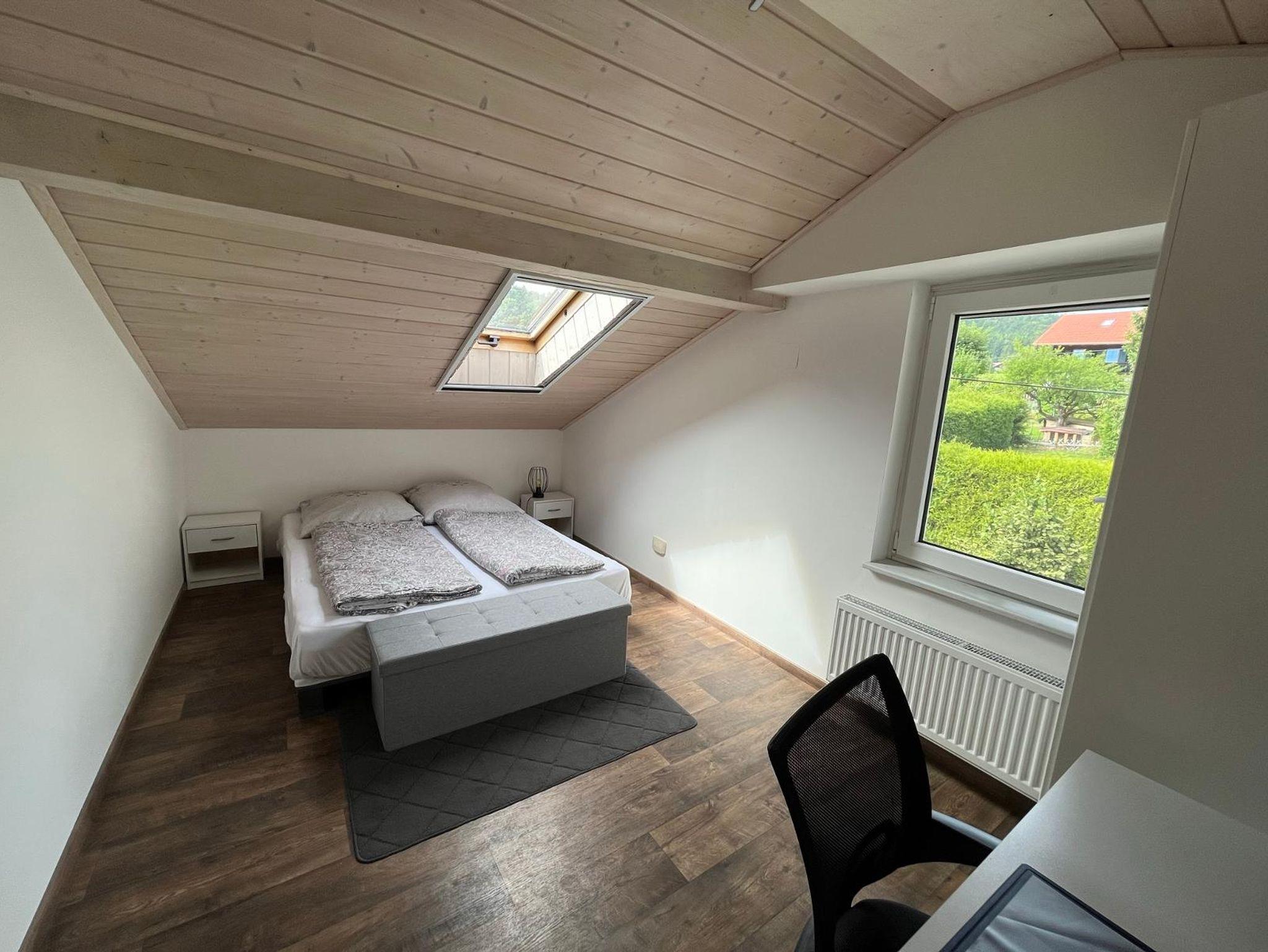 Das Ferienhaus mit 80qm verfügt über zwei Schlafzimmer, eine vollausgestattete Küche (Kühlschrank mit Gefrierschrank, Geschirrspüler, Herd mit Backofen, Mikrowelle, Kaffeevollautomat, Wasserkocher), ein Esszimmer und ein modernes Badezimmer. Über eine Treppe gelangen Sie in den offen gestalteten Wohnbereich mit großer Ausziehcouch und Smart-TV. WLAN ist ebenfalls verfügbar. Durch das Panoramafenster haben Sie einen schönen Blick auf die Berge und die Natotürme am Hohenbogen.