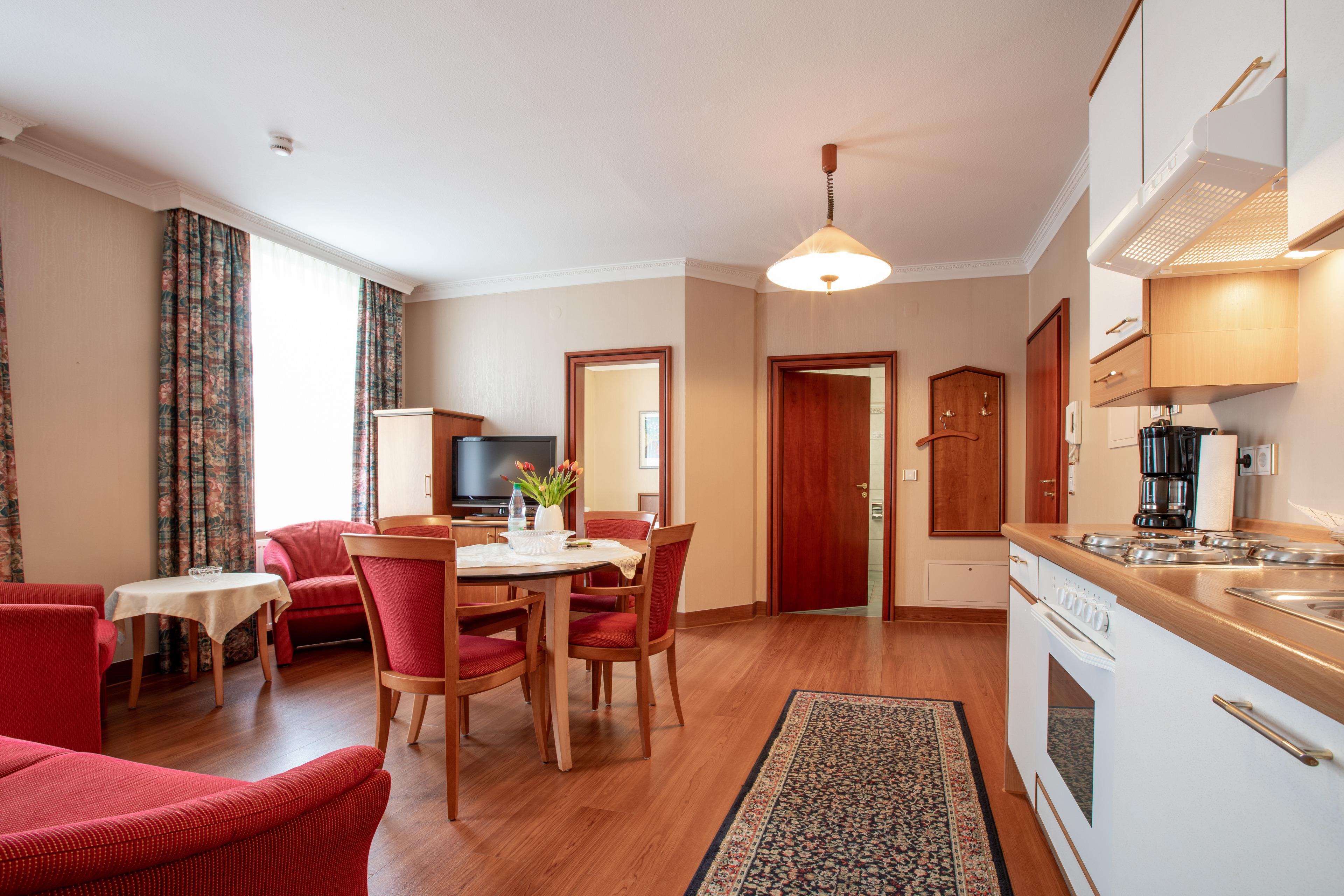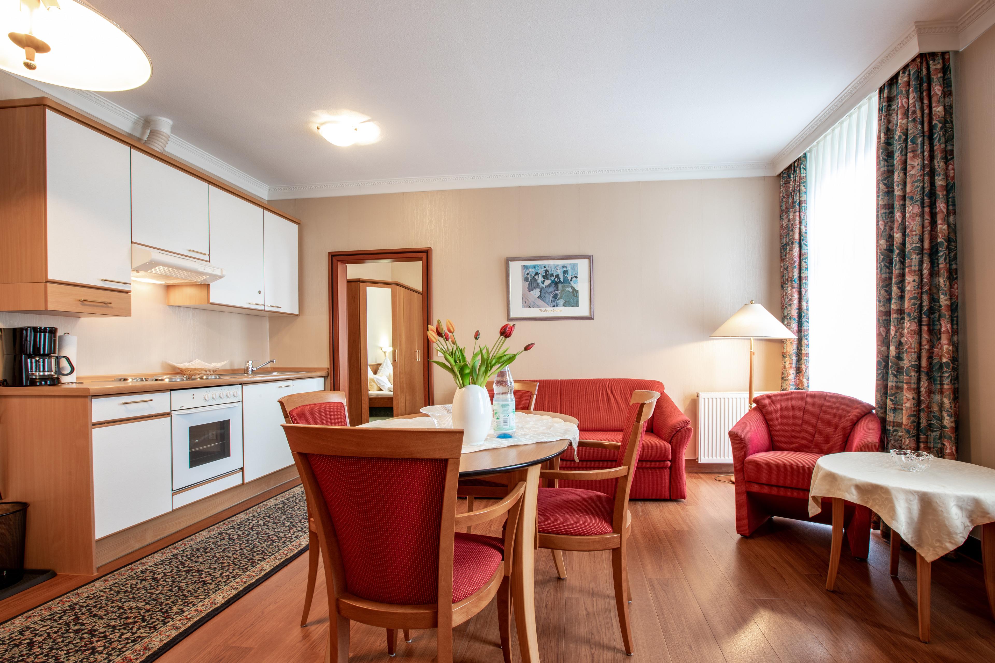 Komplett eingerichtete Küchenzeile oder kleine Küche | Bad mit Dusche | WC – teilweise zusätzlich Badewanne | Flachbild-TV | Zimmersafe | Durchwahltelefon | W-LAN