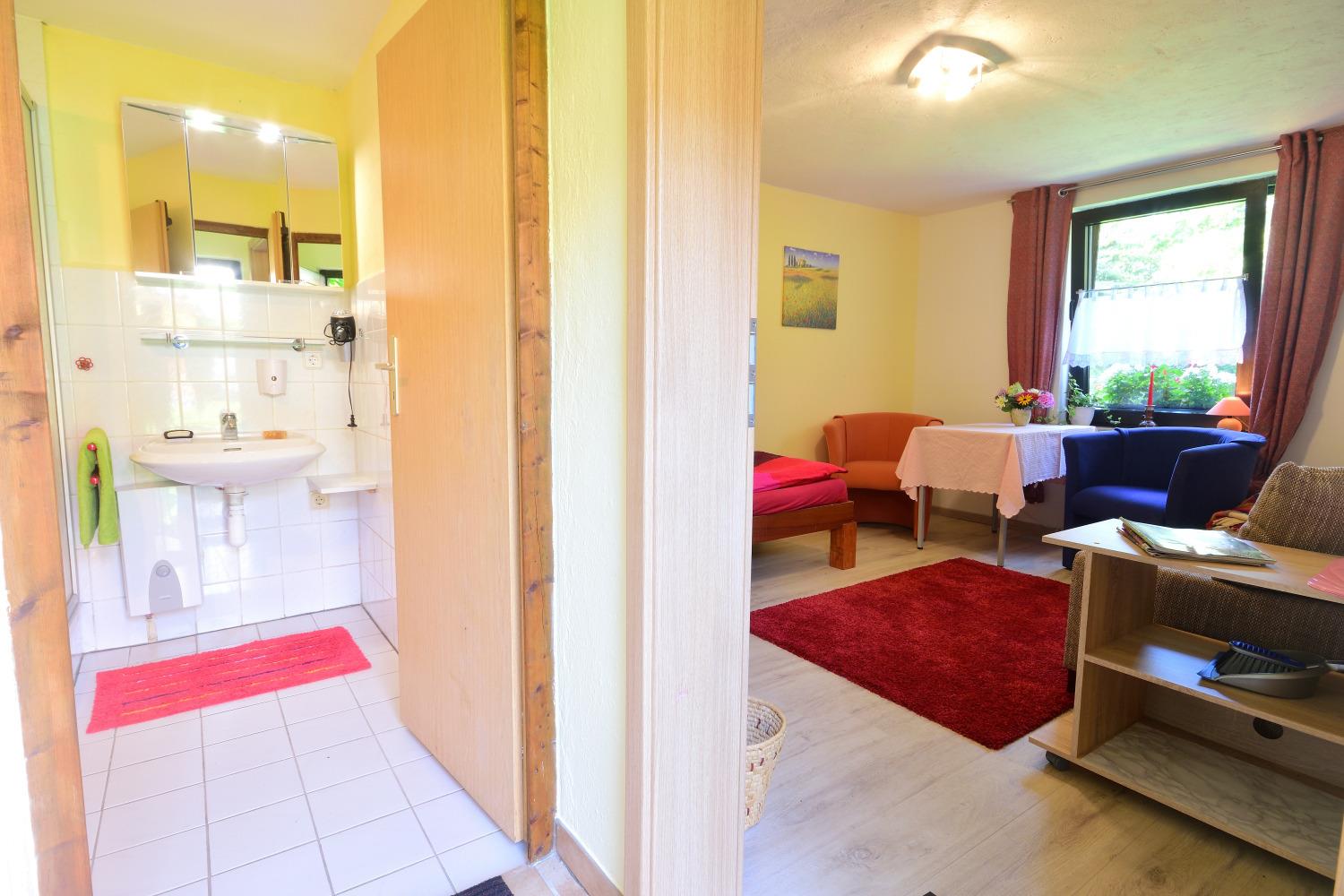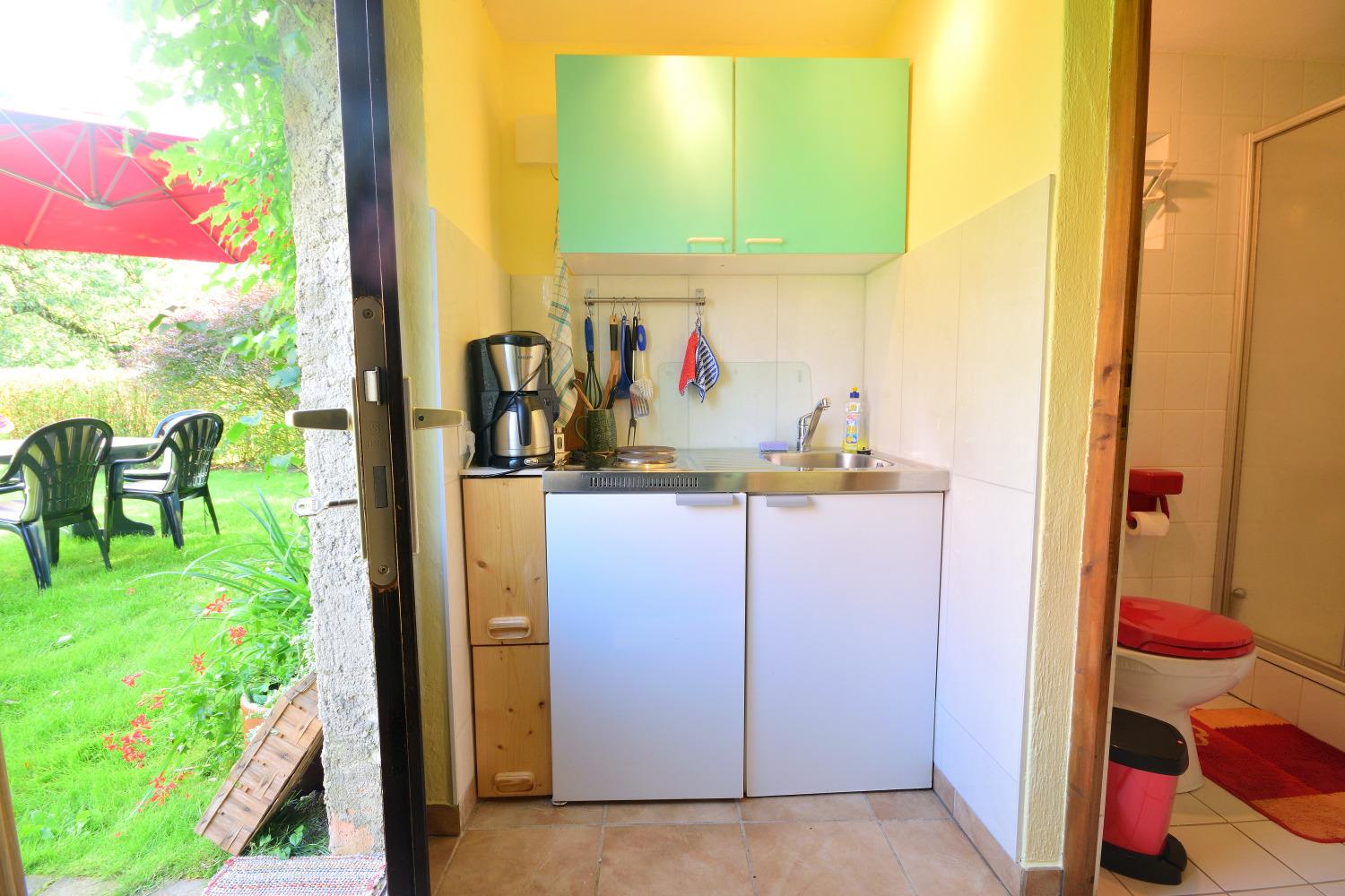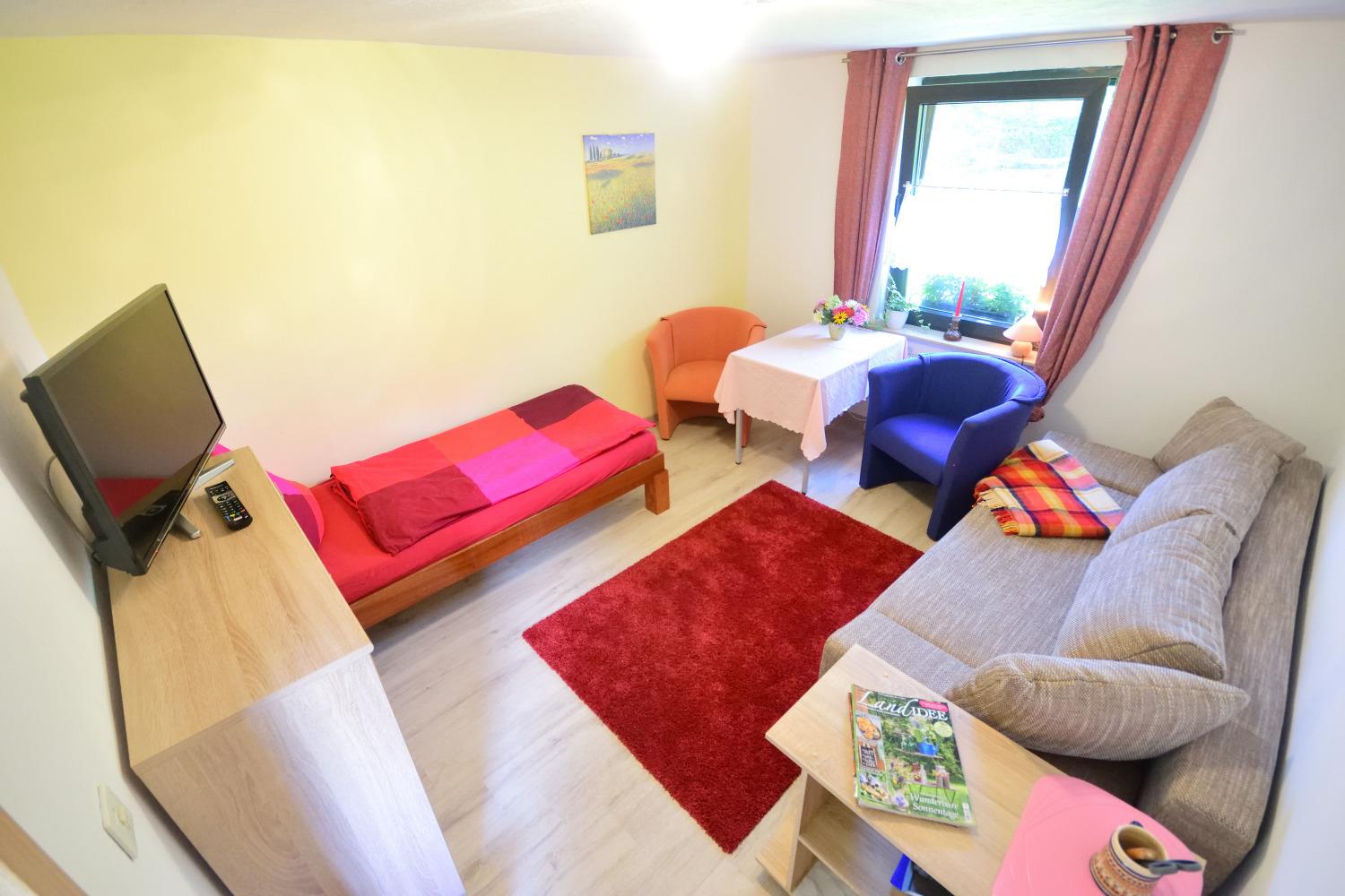Das Wohnschlafzimmer ist mit einem Schlafsofa (1,60 m breit), Einzelbett und Tisch mit 2 Sesseln ausgestattet. Für gemütliche Stunden sorgen Sat-TV und Gesellschaftsspiele. Verdunklung und Insektenschutzgase sind vorhanden. Die kleine Kochnische ist mit allem nötigen ausgestattet, so dass Sie sich selbst versorgen können. Das Bad besitzt eine Dusche, Waschbecken und WC. Ein Kinderreisebett, Parkplatz vor dem Haus und WLAN stehen Ihnen kostenfrei zur Verfügung.