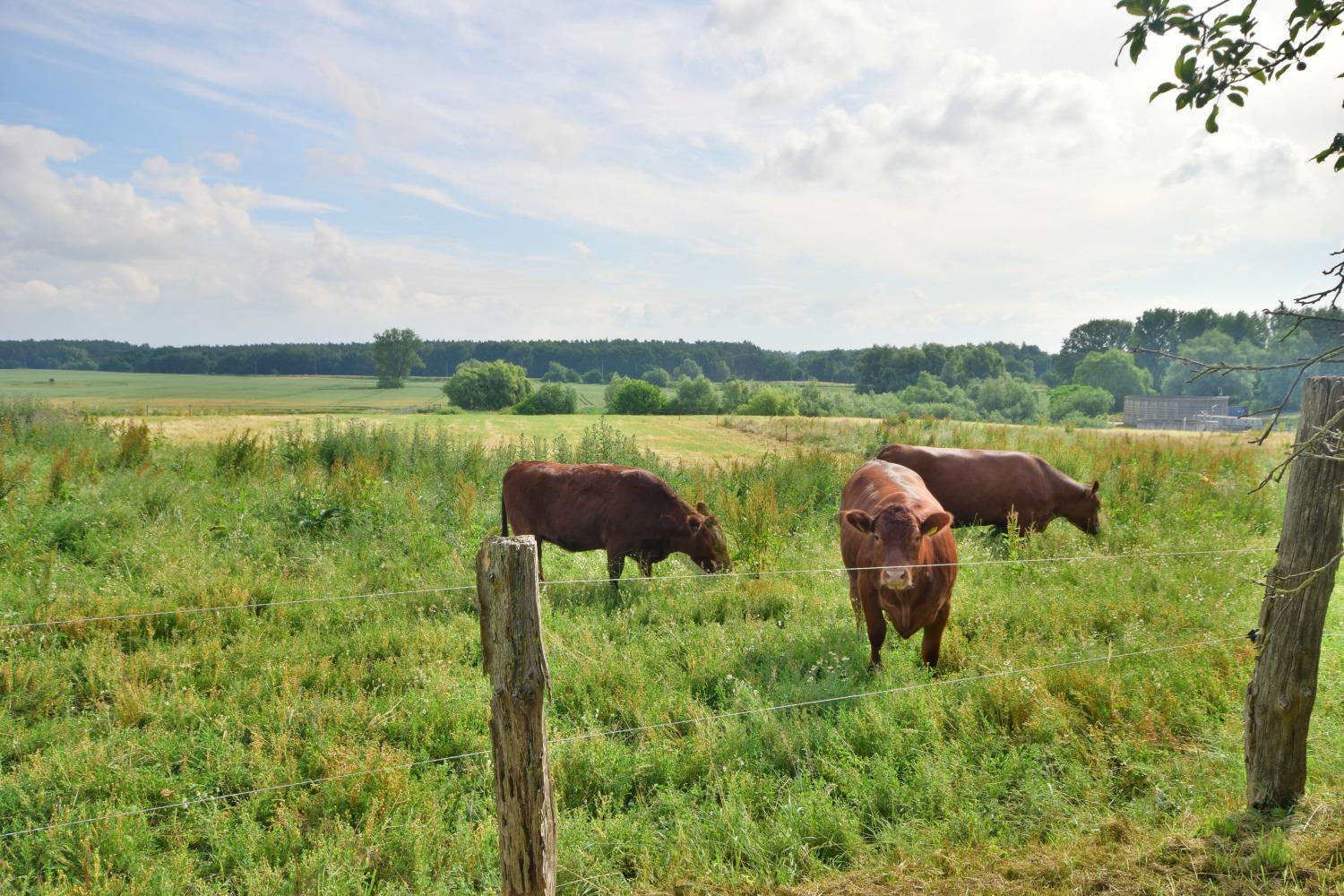 Vom Wohnbereich gelangen Sie auf die große Terrasse, mit angrenzender Wiese. Genießen Sie den Blick bis über die Felder und Rinderweide bis zum Horizont. Sonnenliegen, Grill und Sitzmöglichkeiten sind vorhanden. Ihren PKW und Ihre Fahrräder können Sie auf dem Grundstück überdacht abstellen. Die Ferienwohnung befindet sich auf einem Bauernhof (Grünlandbetrieb und Rinderhaltung im Nebenerwerb).
