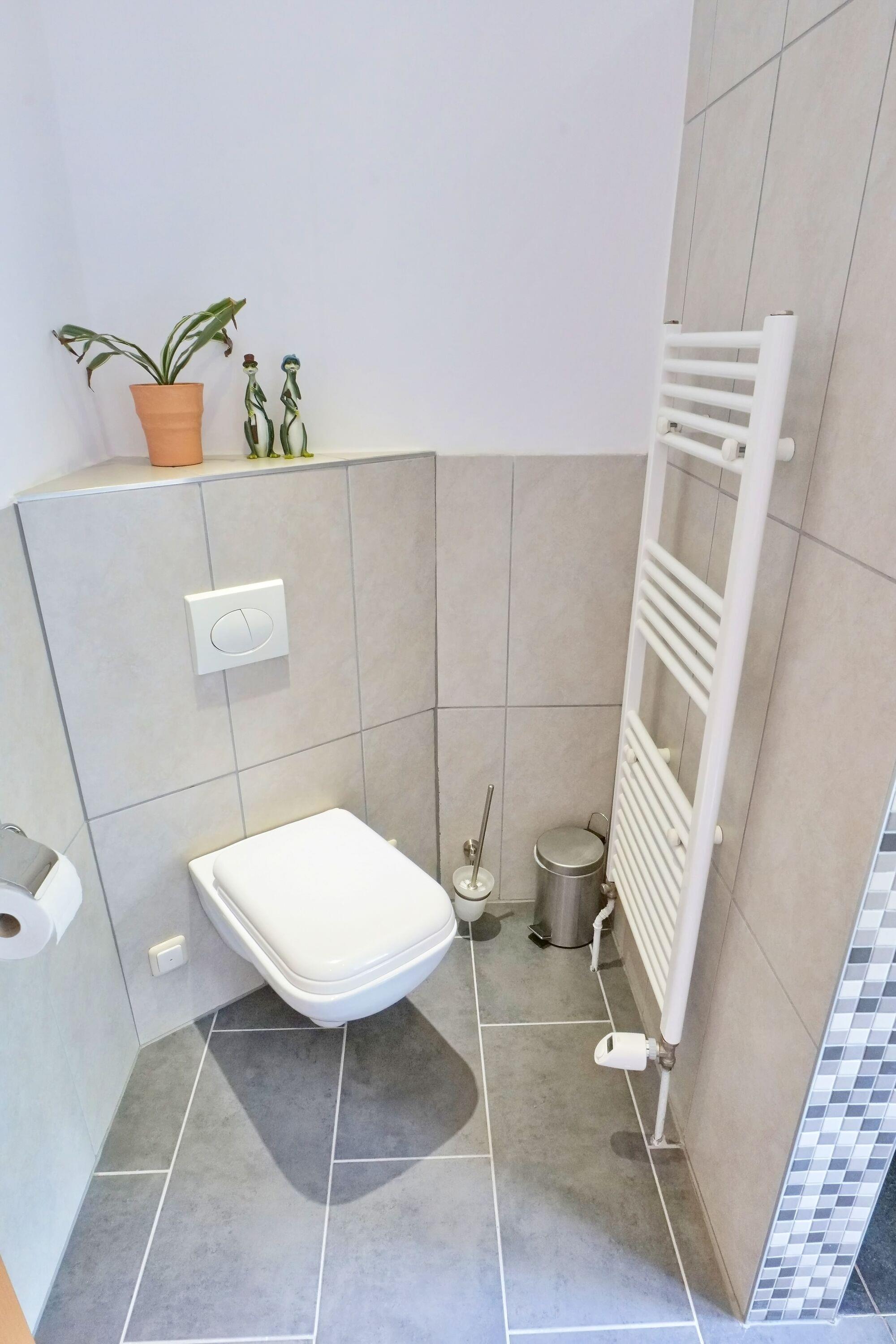 Das ansprechend renovierte Badezimmer verfügt über eine großzügige ebenerdige Dusche, einen großen geräumigen Waschtisch und eine Waschmaschine. Die Fußbodenheizung sorgt hier zusätzlich für Ihr Wohlbefinden.