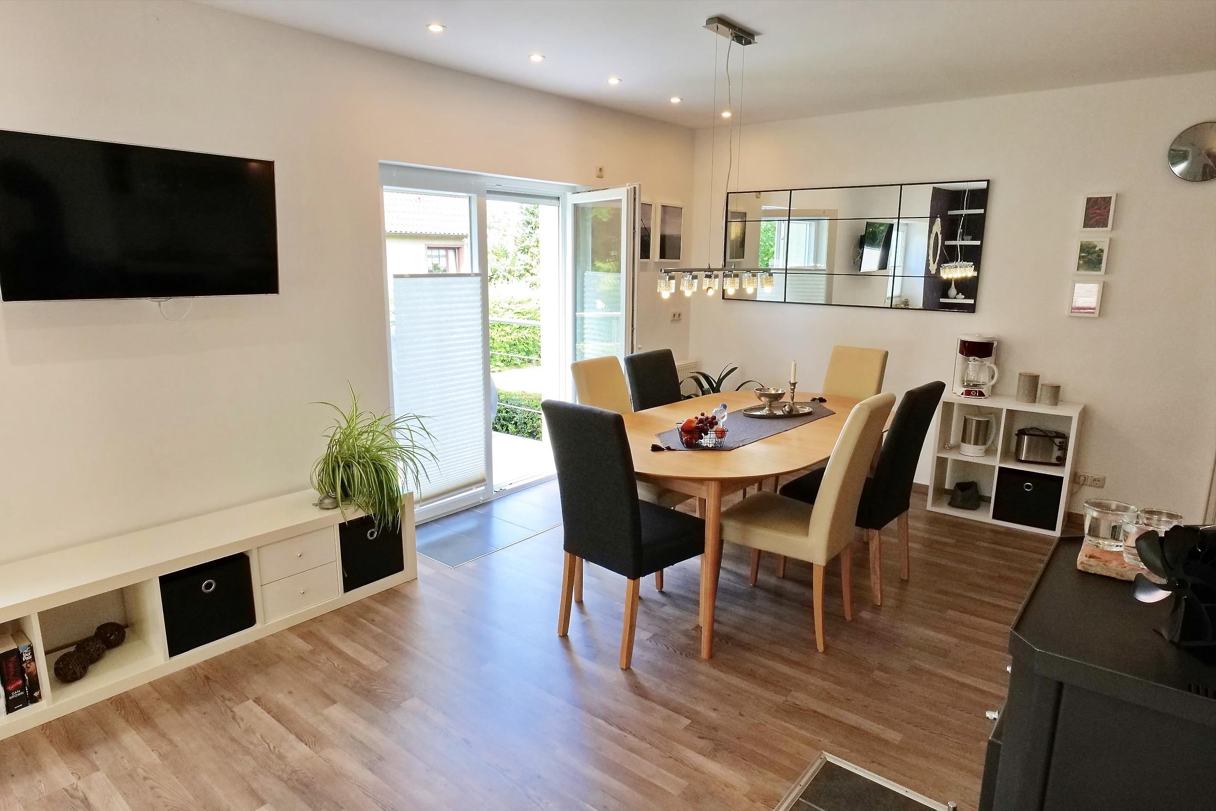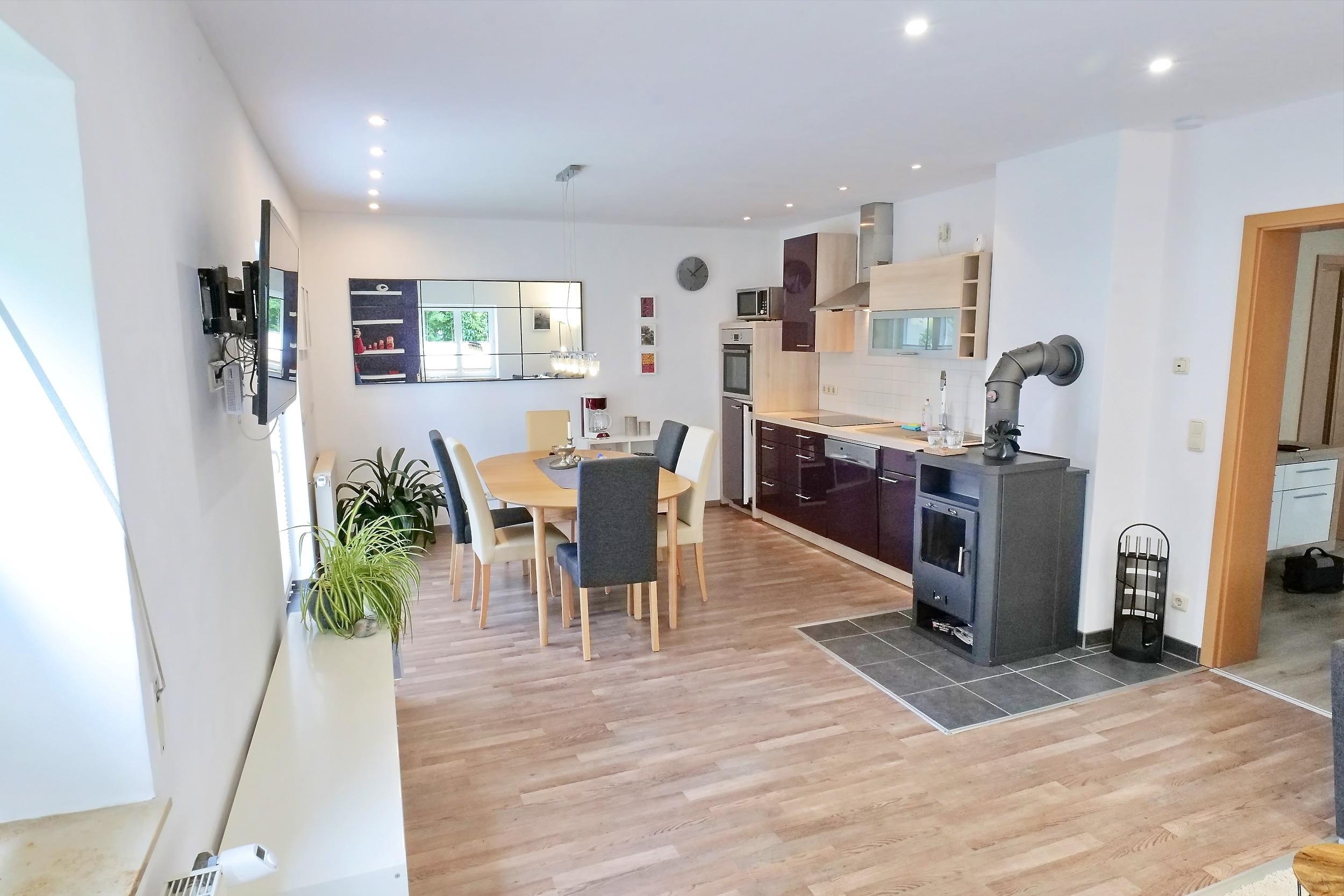 2014 neu ausgebaut und hochwertig sowie umfangreich ausgestattet, wird es Ihnen hier kaum an etwas fehlen. Vor allem in den Herbst-/ und Wintermonaten können Sie unser Highlight, den gemütlichen Kamin in Aktion erleben. Aber auch die anderen Jahreszeiten können Sie in unserer Ferienwohnung genussvoll und entspannt genießen. Eine neue Terrasse von 6 Quadratmeter, gebaut 2021 vervollständigt die Ferienwohnung.