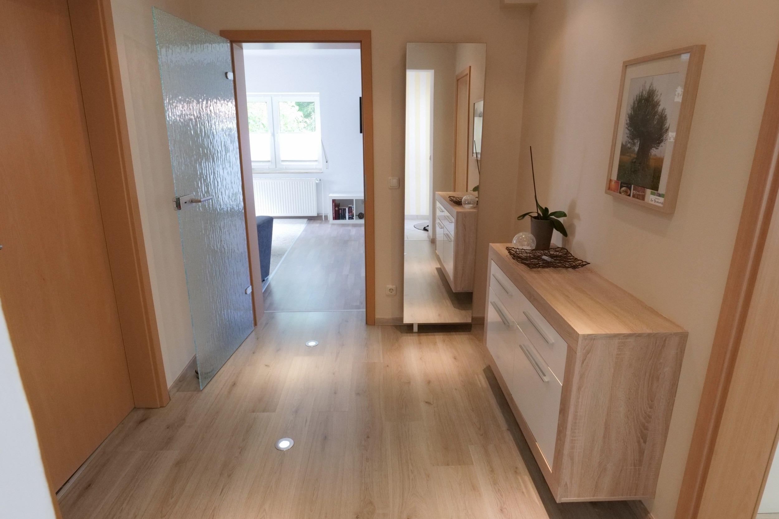 Die Ferienwohnung verfügt über einen großen Flurbereich teilweise gefliest und im Wohnbereich mit Laminatboden ausgestattet.
