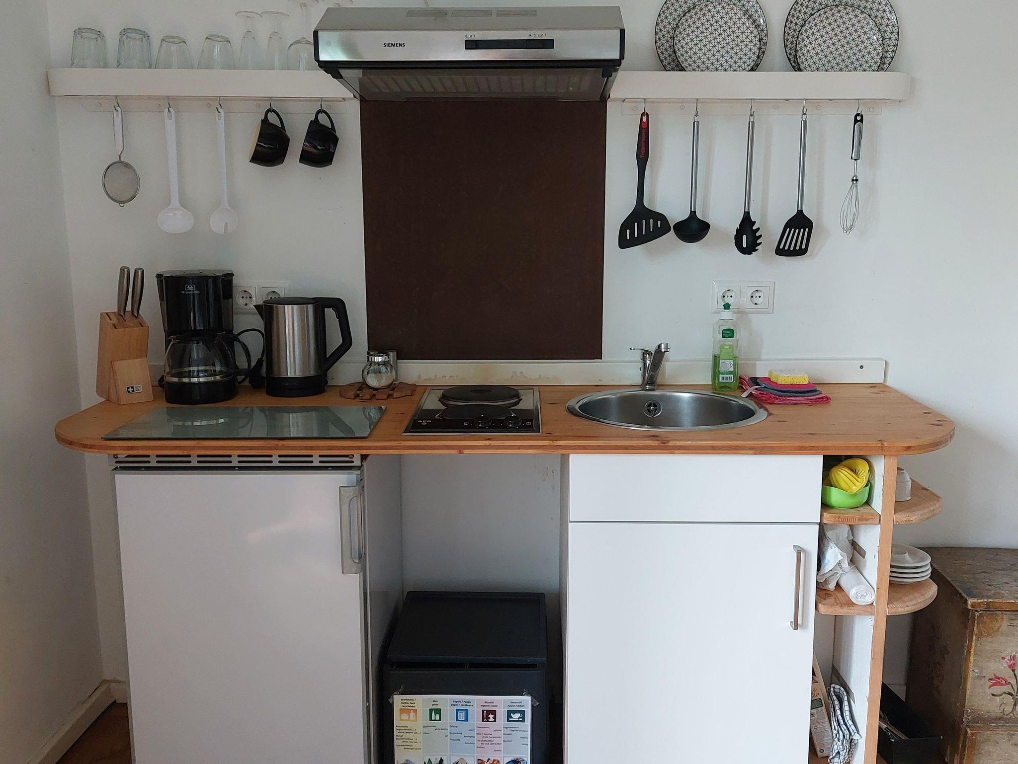 Die Ferienwohnung ist ein Einzimmerappartement mit Küche, Bad und einem Balkon. Die Einrichtung ist einfach und funktionstüchtig. Die Gäste können die Räumlichkeiten im Erdgeschoss (Gastraum und Weinstube) mit nutzen.