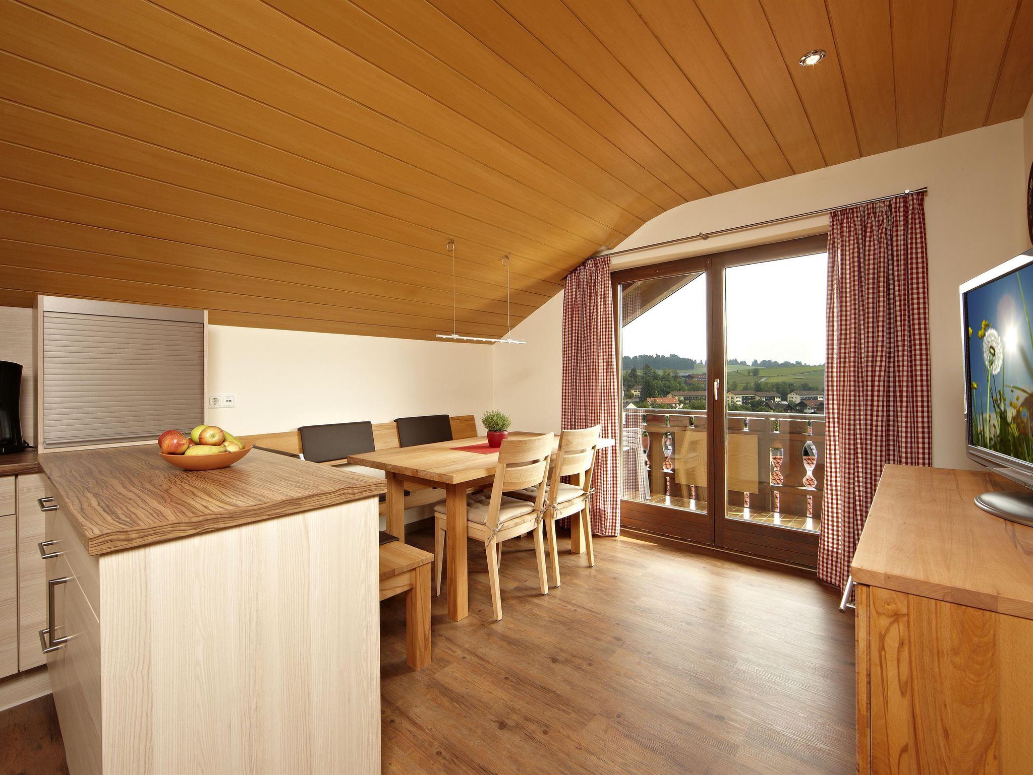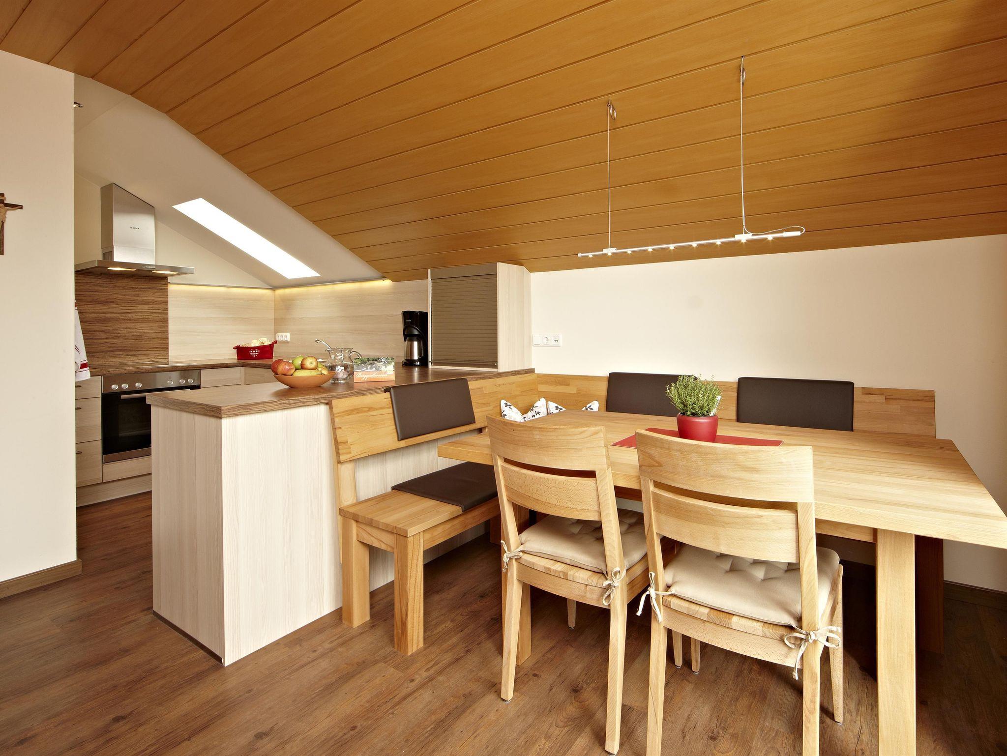 Gemütliche Ferienwohnung für 2 bis 4 Personen im 2. Stock (Dachgeschoß). Aufgeteilt in Schlafzimmer, Wohnzimmer mit Doppelbett-Schlafcouch (1,80 m Breite!), komplett ausgestatteter Küche mit Mikrowelle und großzügigem Bad mit Doppelwaschbecken, Dusche/WC bietet die Ferienwohnung behaglichen Komfort. Vom schönen Ostbalkon, auf dem man morgens hervorragend frühstücken kann, geniessen Sie einen traumhaften Blick auf das Murnauer Moos und die dahinterliegenden Bergketten.