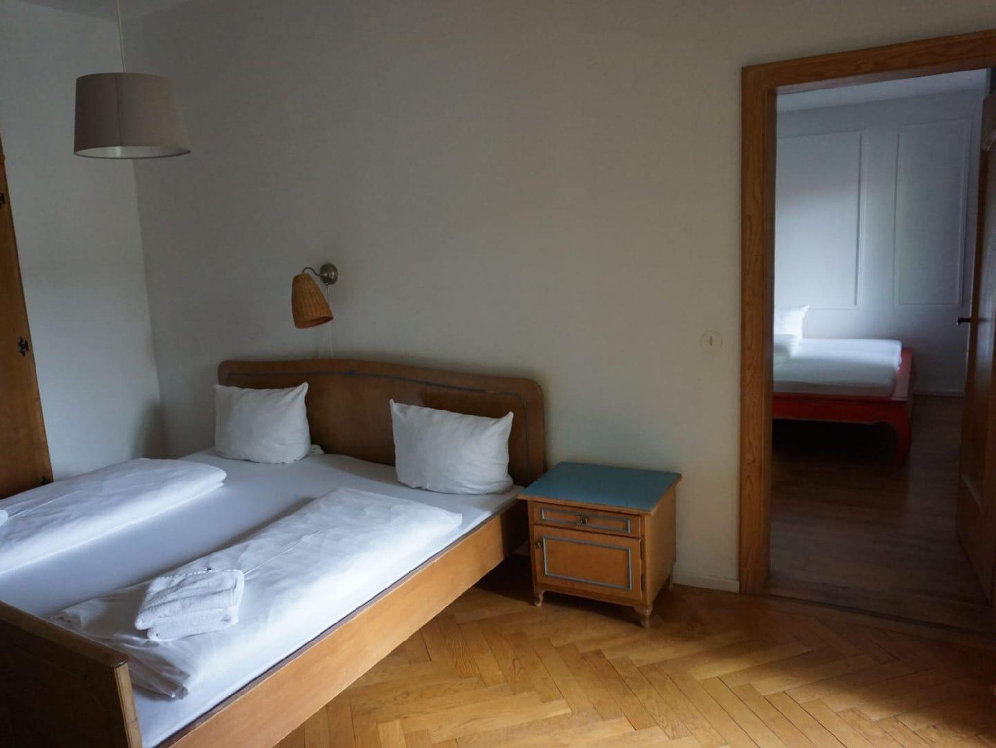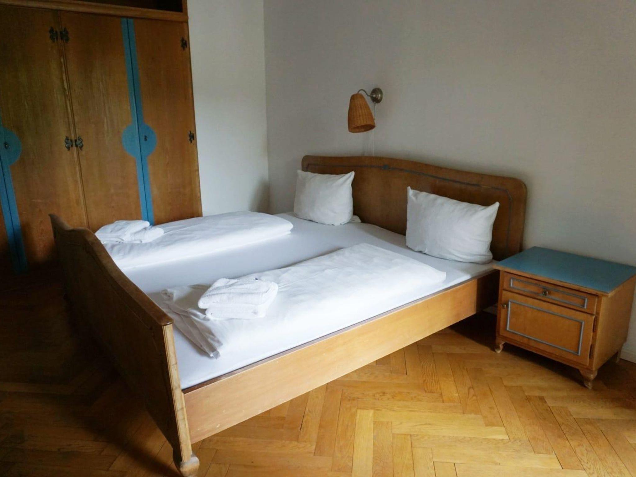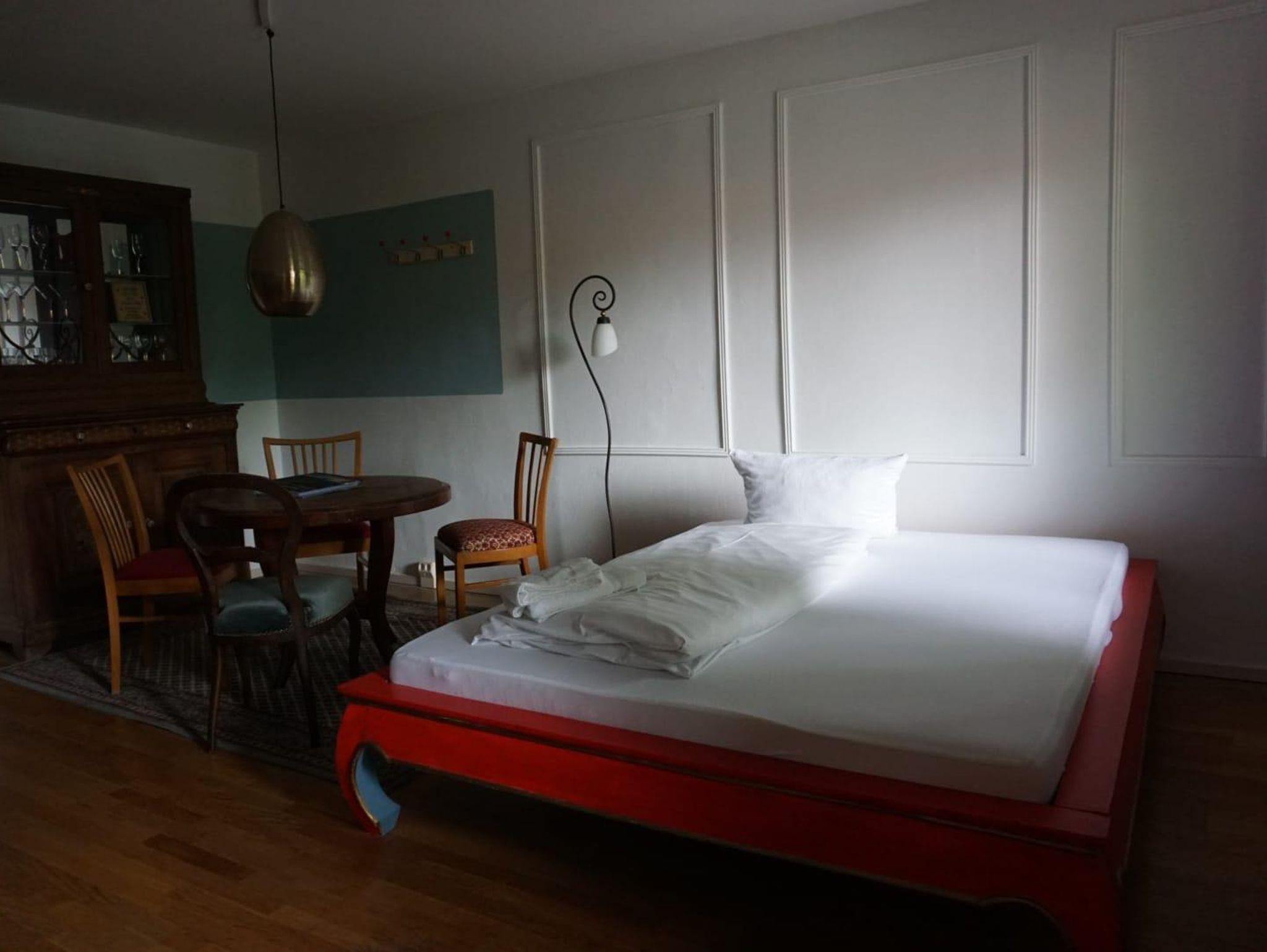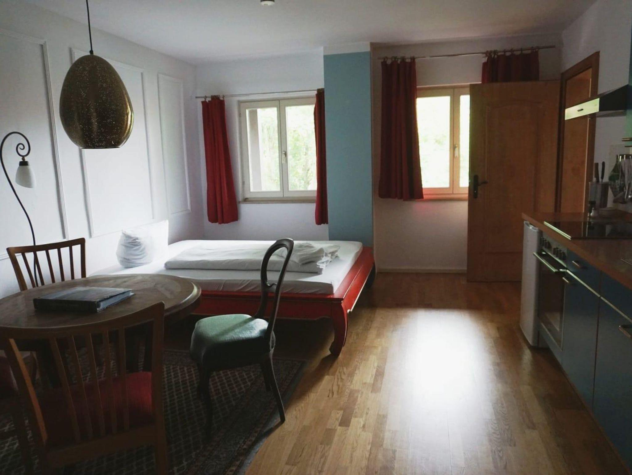 Die Ferienwohnung verfügt über 1 Schlafzimmer, Bad und ein Multifunktionszimmer. In diesem großzügigen Raum ist Küche und Wohnbereich sowie ein Einzelbett integriert. Der Zugang zum Balkon befindet sich über das Bad und Schlafzimmer. Die Einrichtung ist einfach und funktionstüchtig. Die Gäste können die Räumlichkeiten im Erdgeschoss (Gastraum und Weinstube) nutzen. Das W-LAN im gesamten Haus ist abschaltbar.